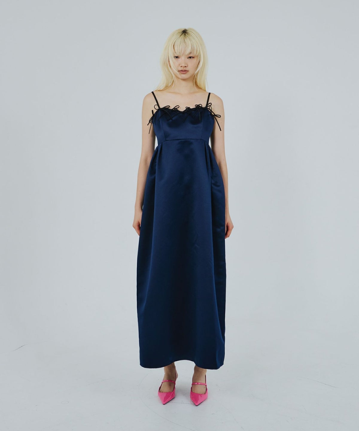 ネイビーのみ配色リボンで、ブラック×ネイビーのコントラストがガーリーモードな雰囲気を演出。
