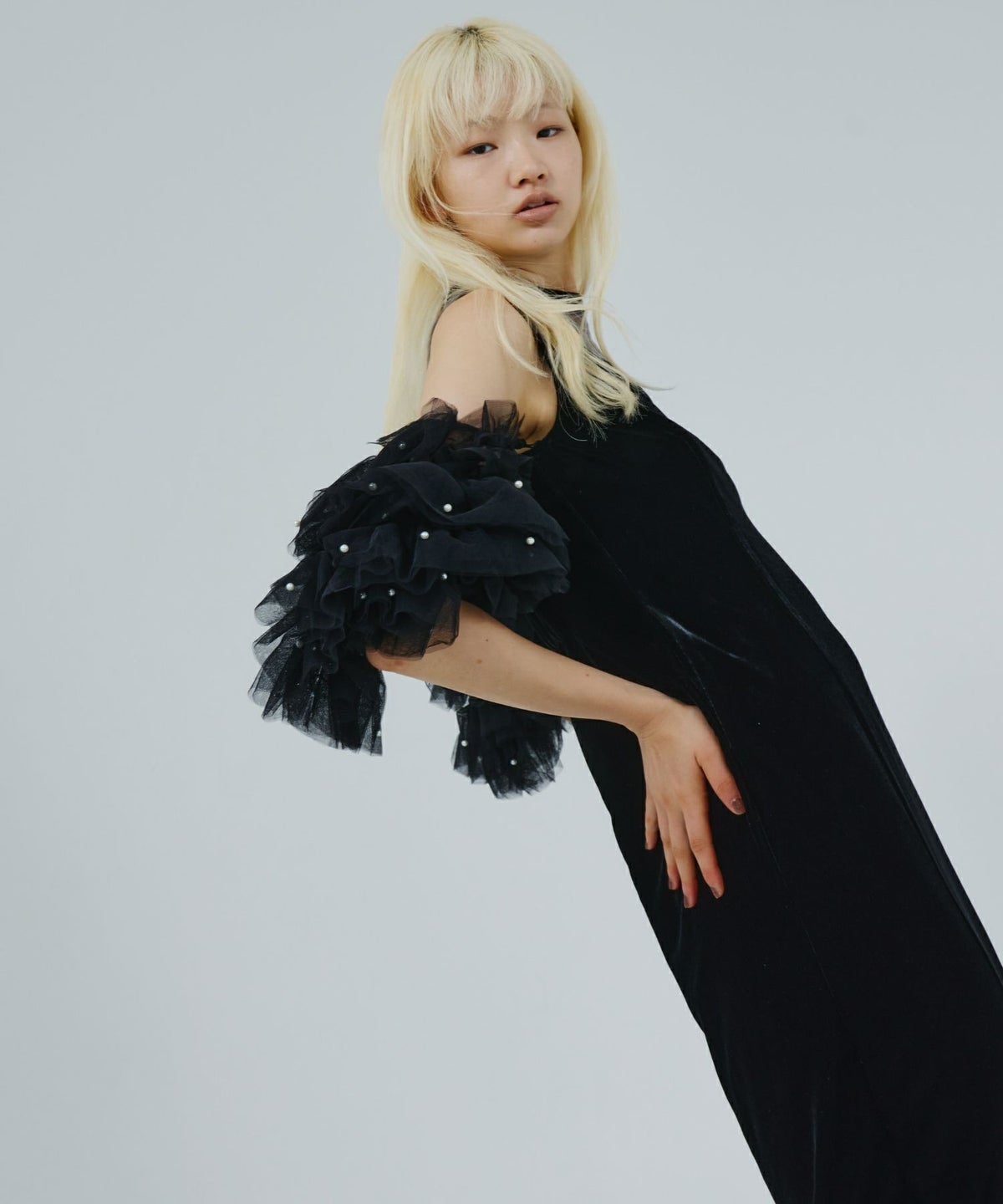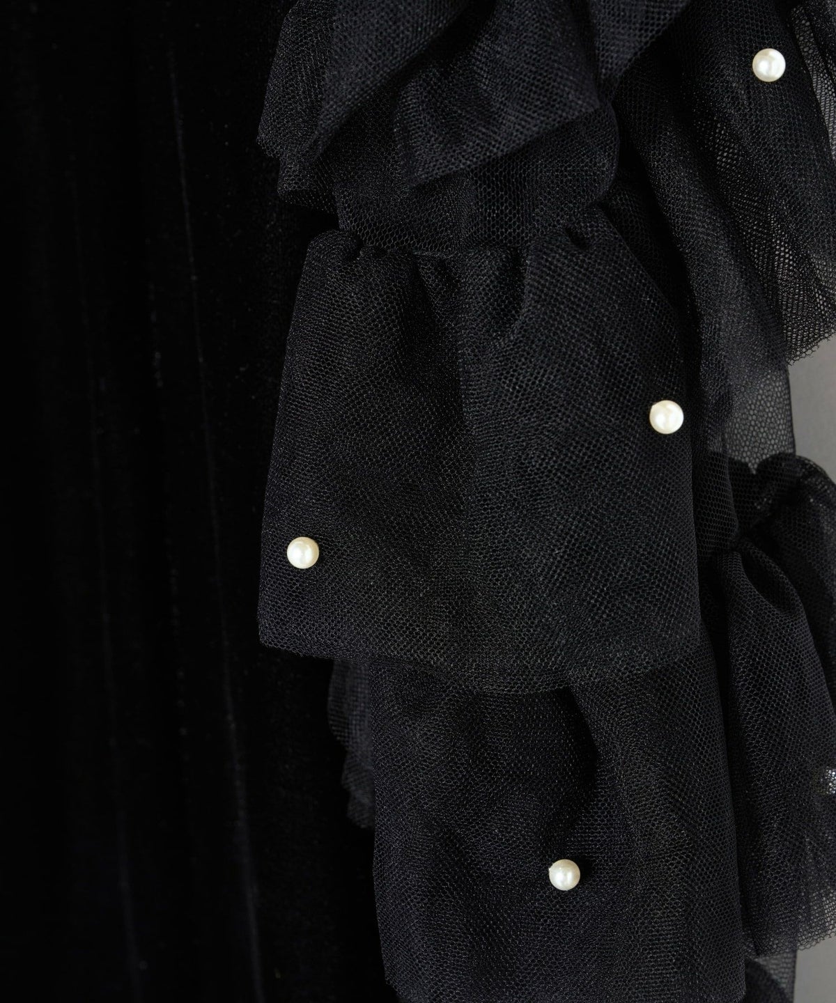 ワンピ部分はベロア生地に変更し、袖チュールにポイントでパールをあしらったレディなドレス。