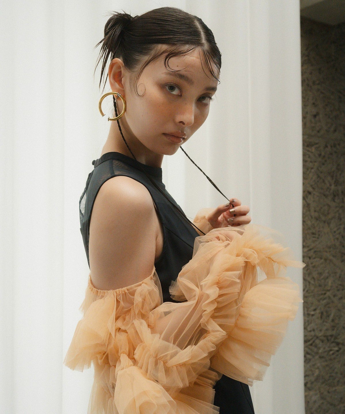 大人気の「decorative tulle tops」と同じチュールを採用し、ハリ感と柔らかさの絶妙なバランスで、たっぷりなボリュームフリルでも柔らかな着心地。