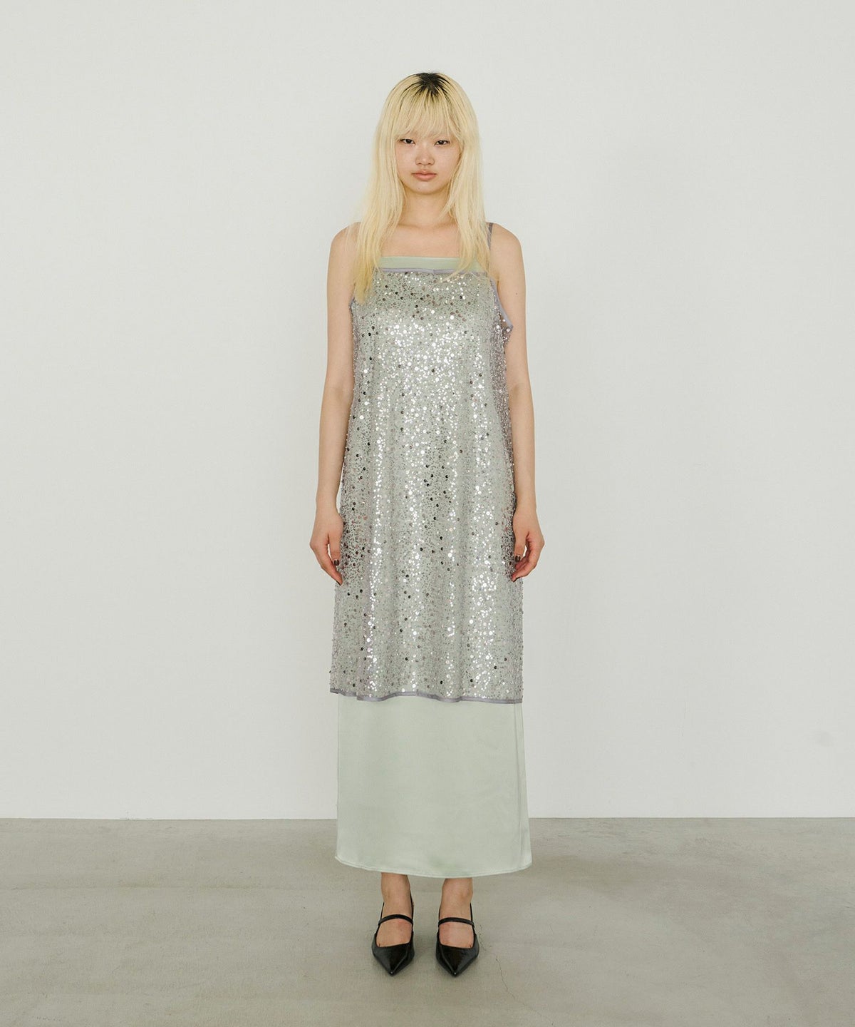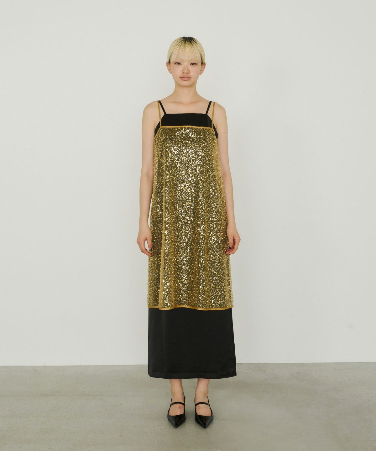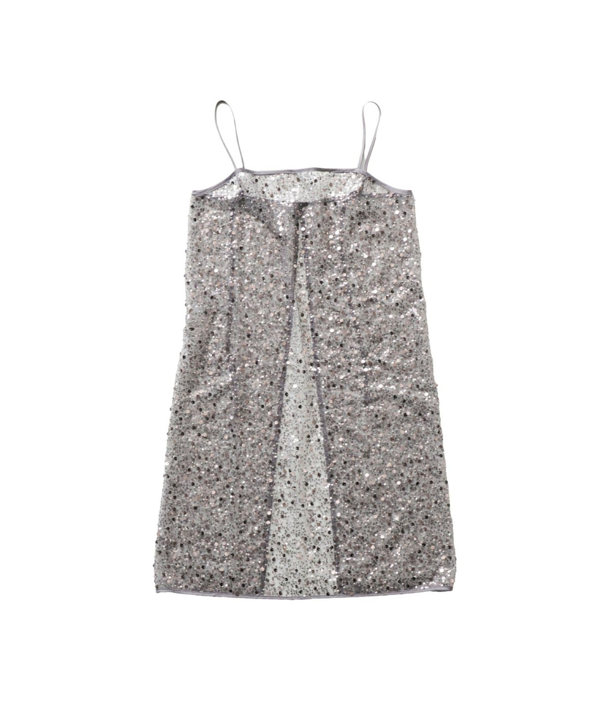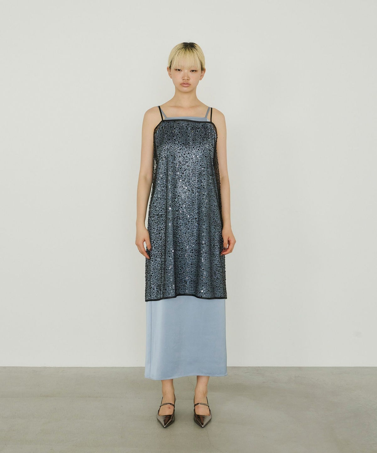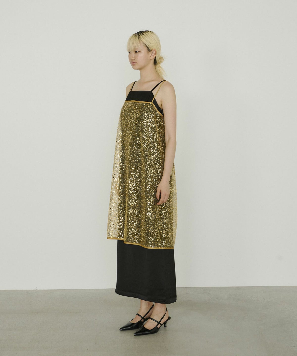 メタリックのスパンコールとパールビーズをランダムに刺繍した、繊細なチュール素材を使用したキャミドレス。