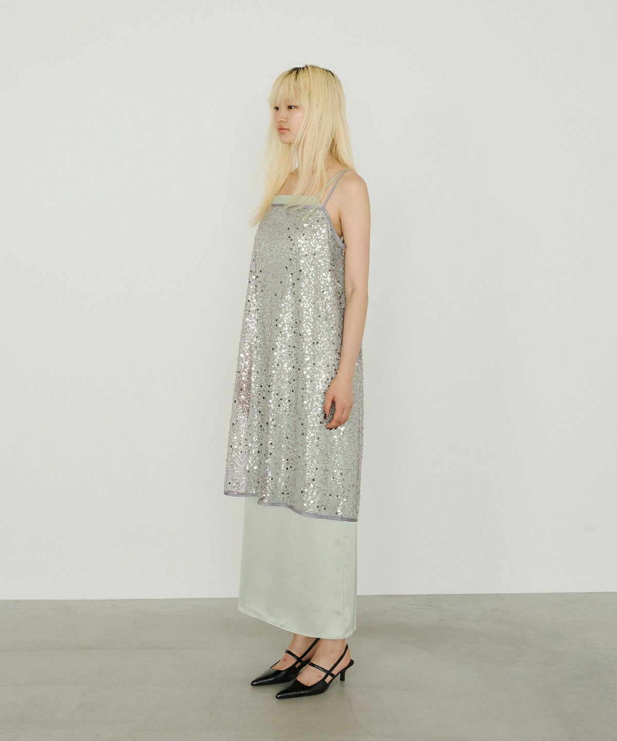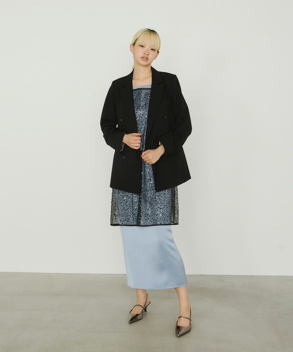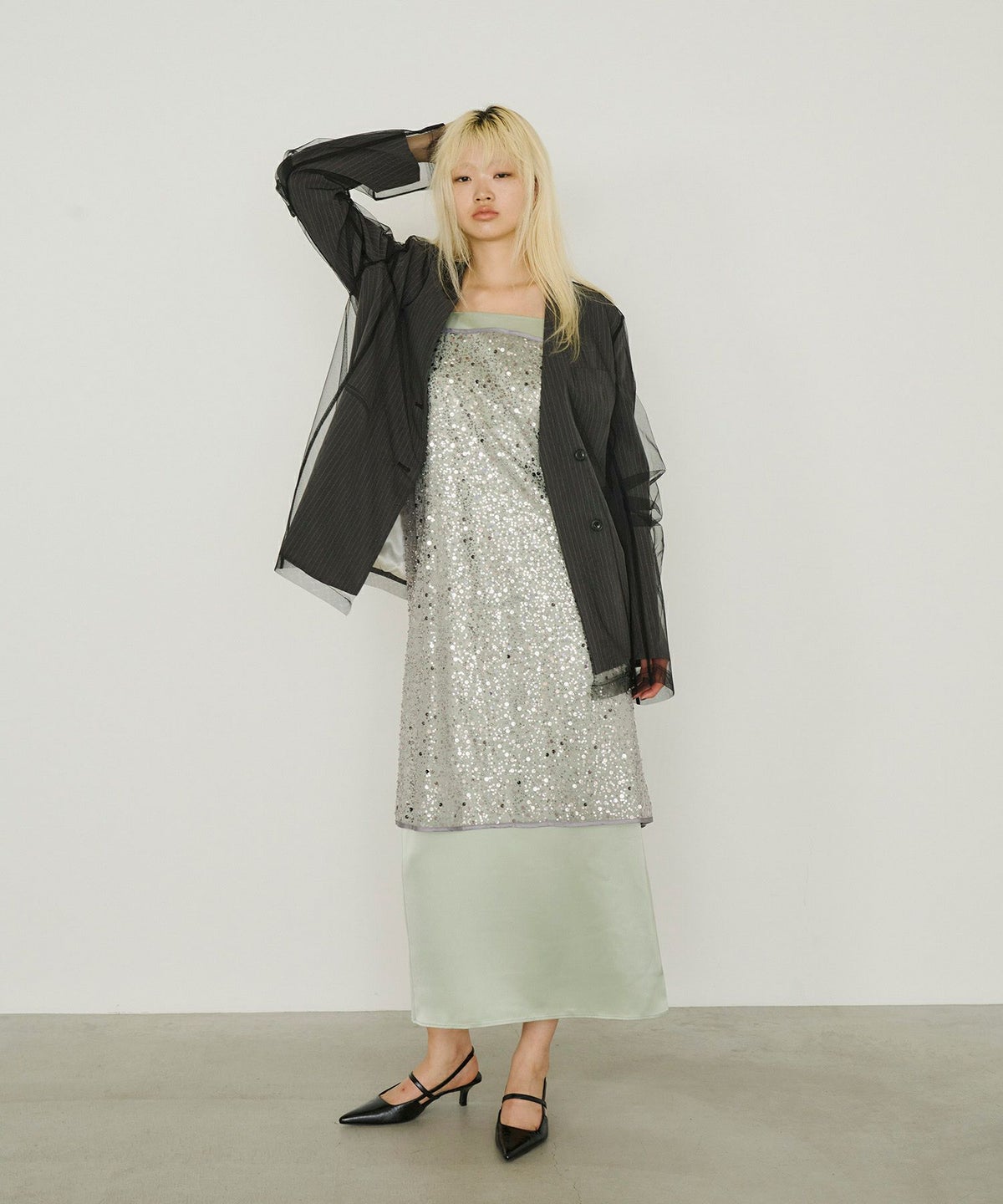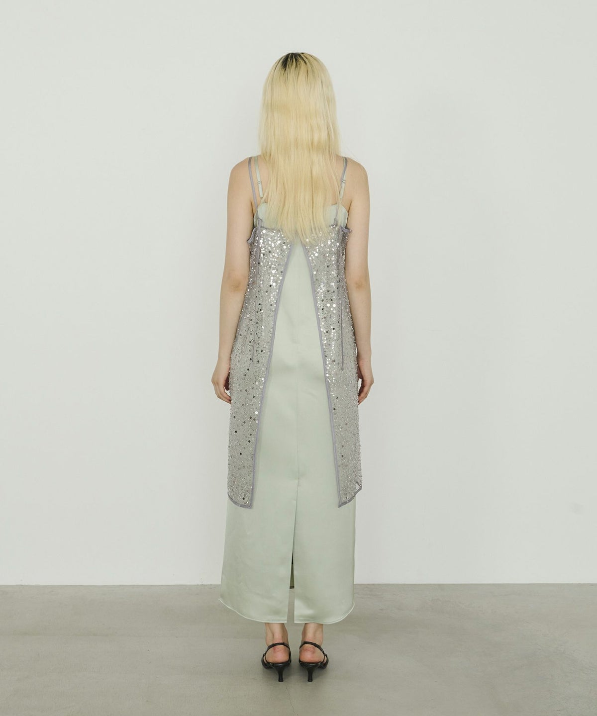 ・〈satin minimal dress(品番:50264)〉 と合わせれば、よりフォーマル感のある華やかなスタイルに