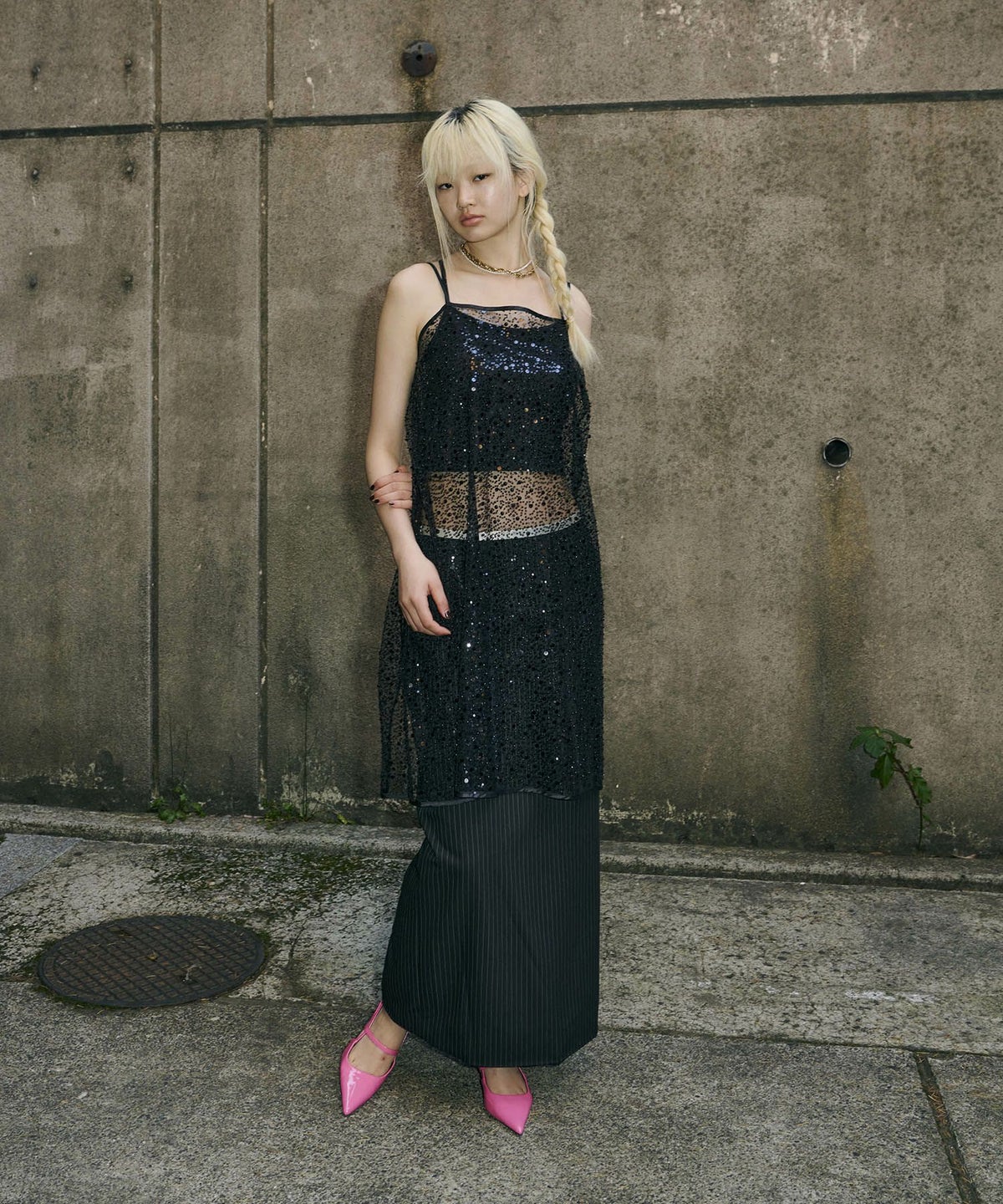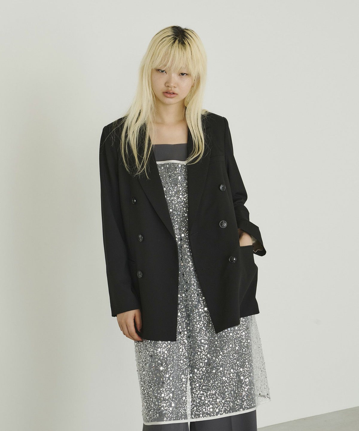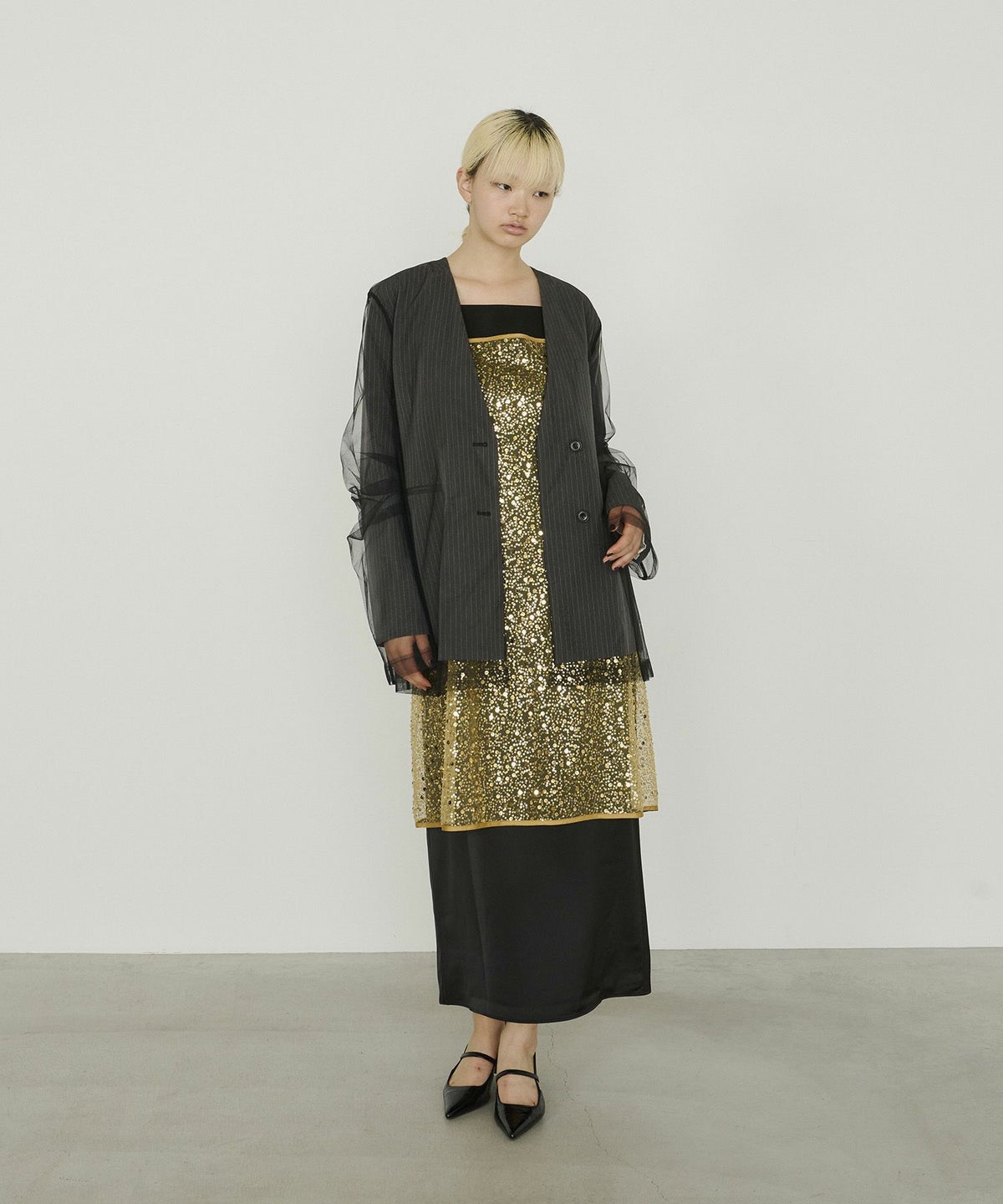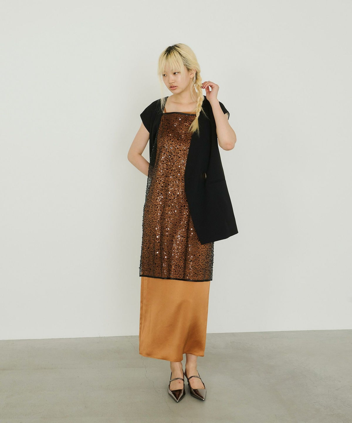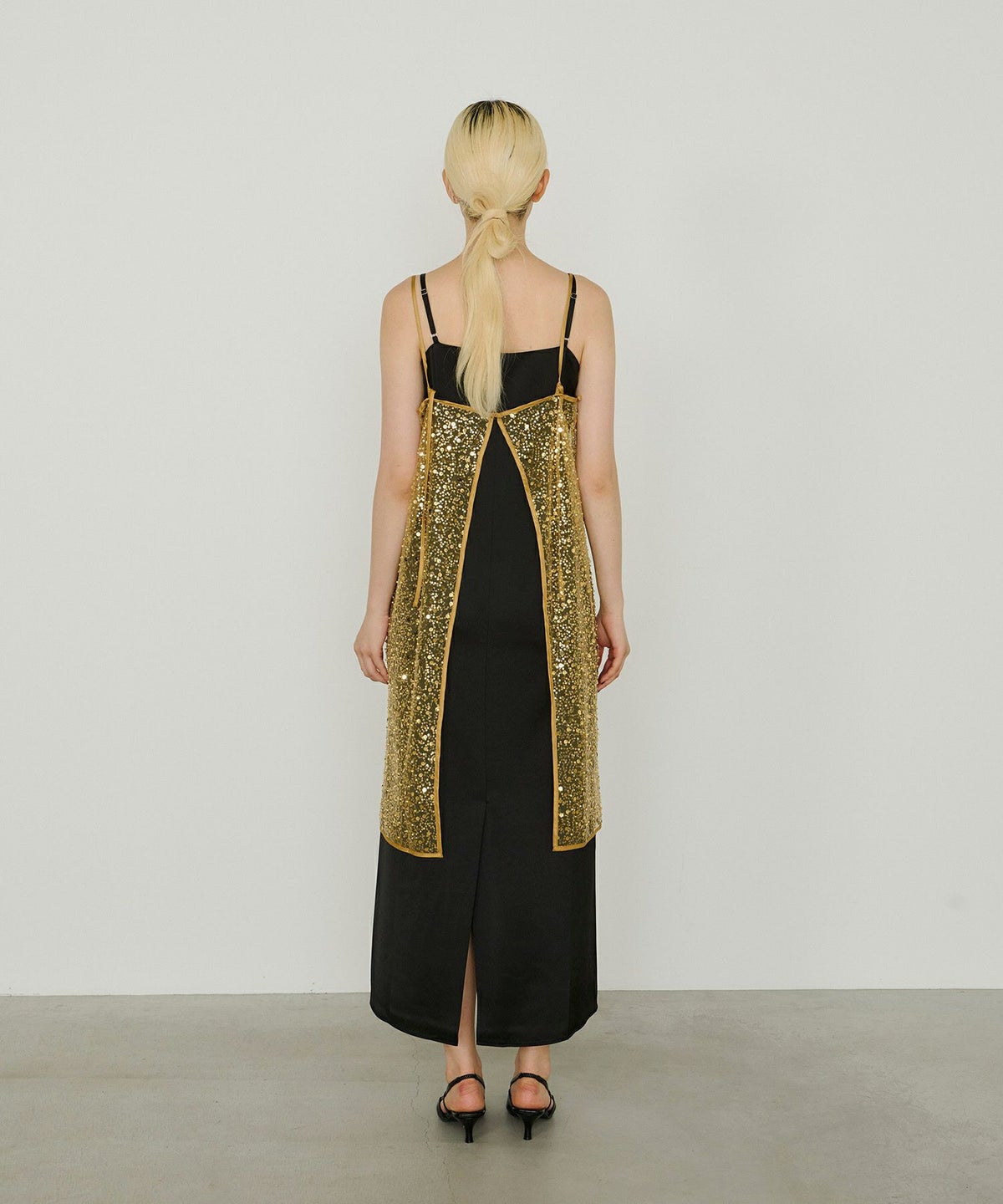 ・〈satin minimal dress(品番:50264)〉 と合わせれば、よりフォーマル感のある華やかなスタイルに