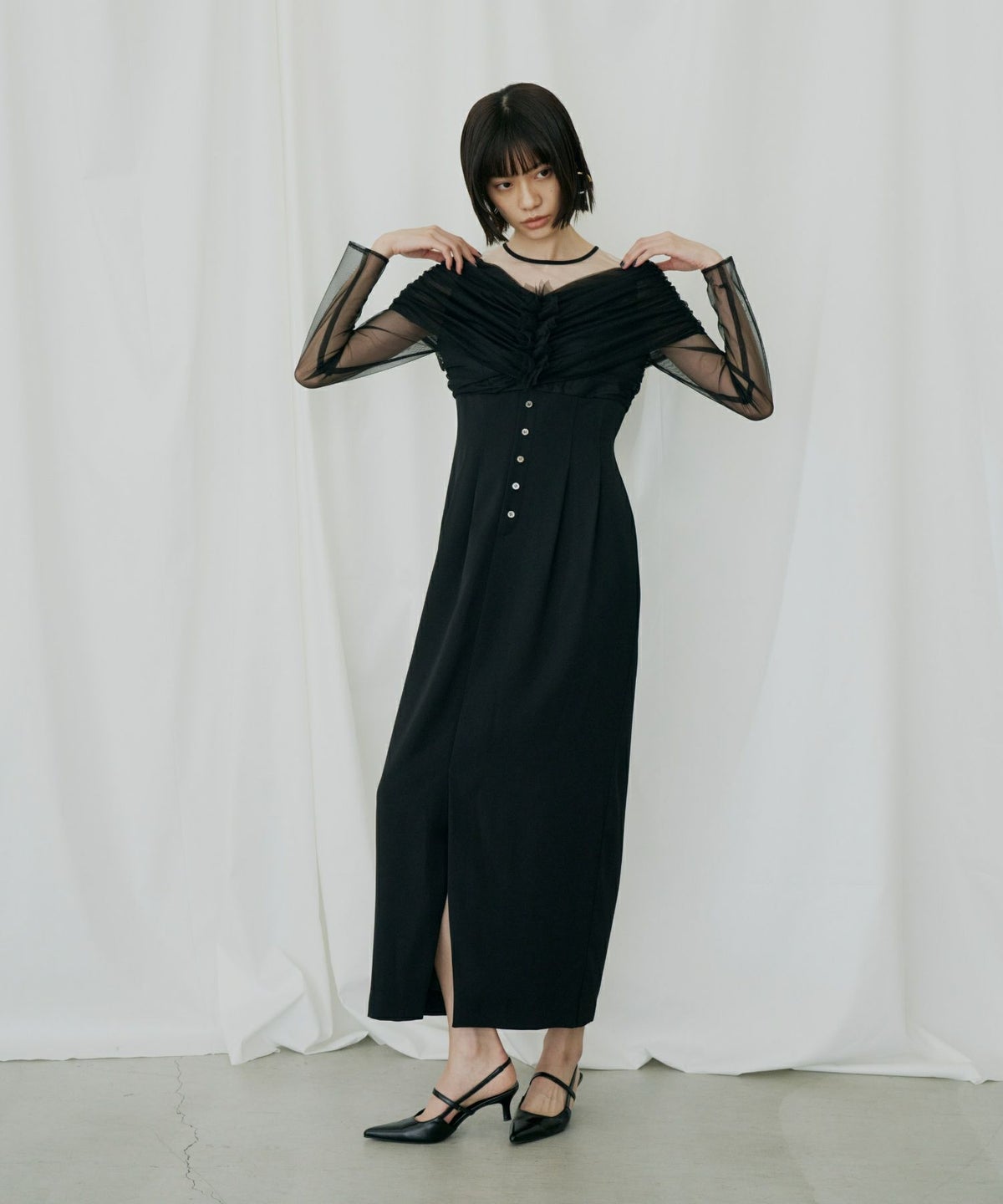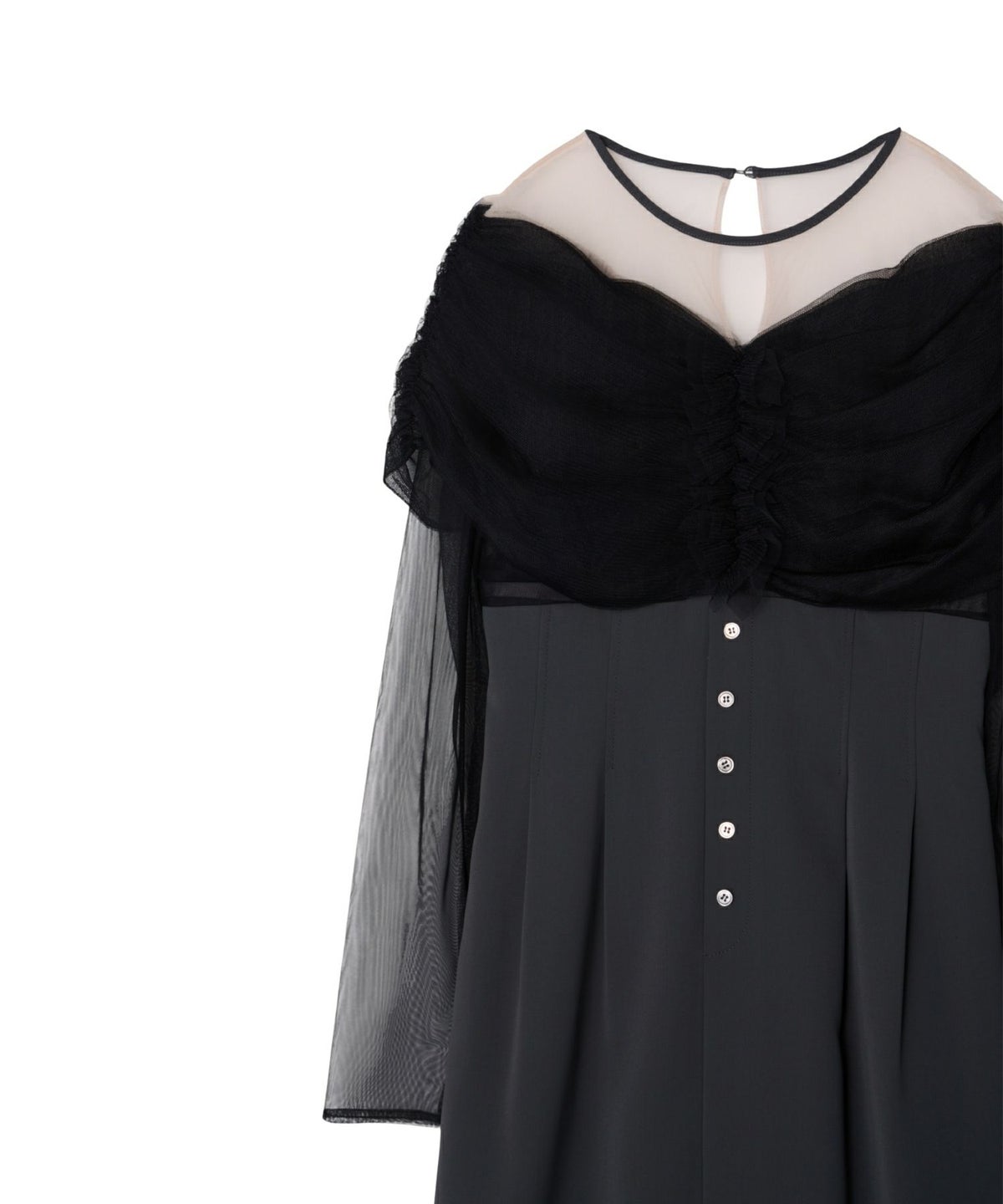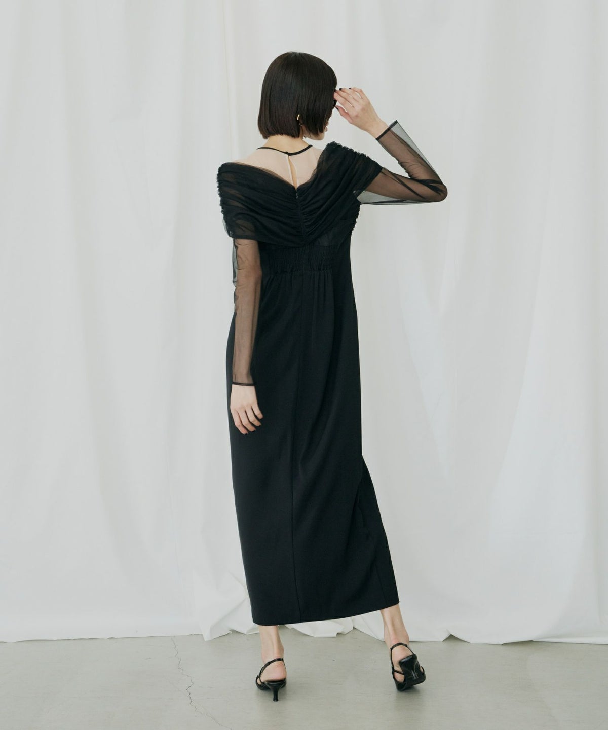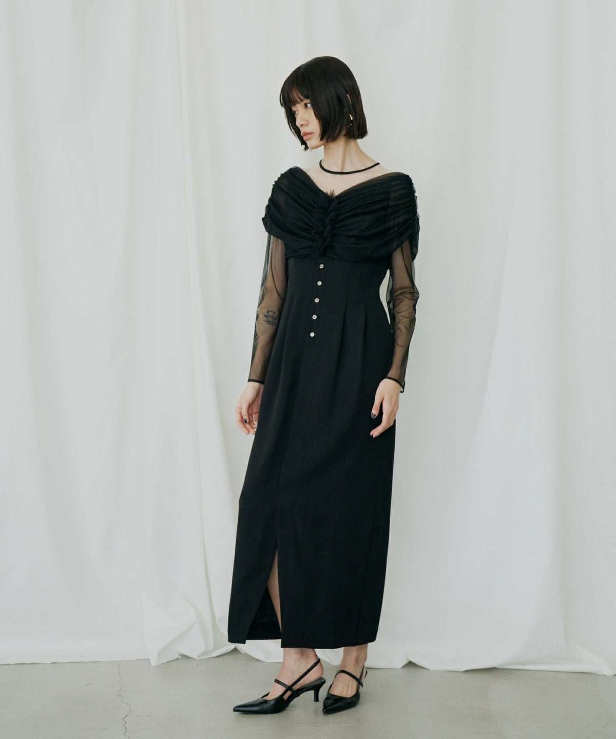 ヨークとスリーブには、透けすぎない上品なシアーチュールを使用し、肌を美しく見せつつも上品な印象に。