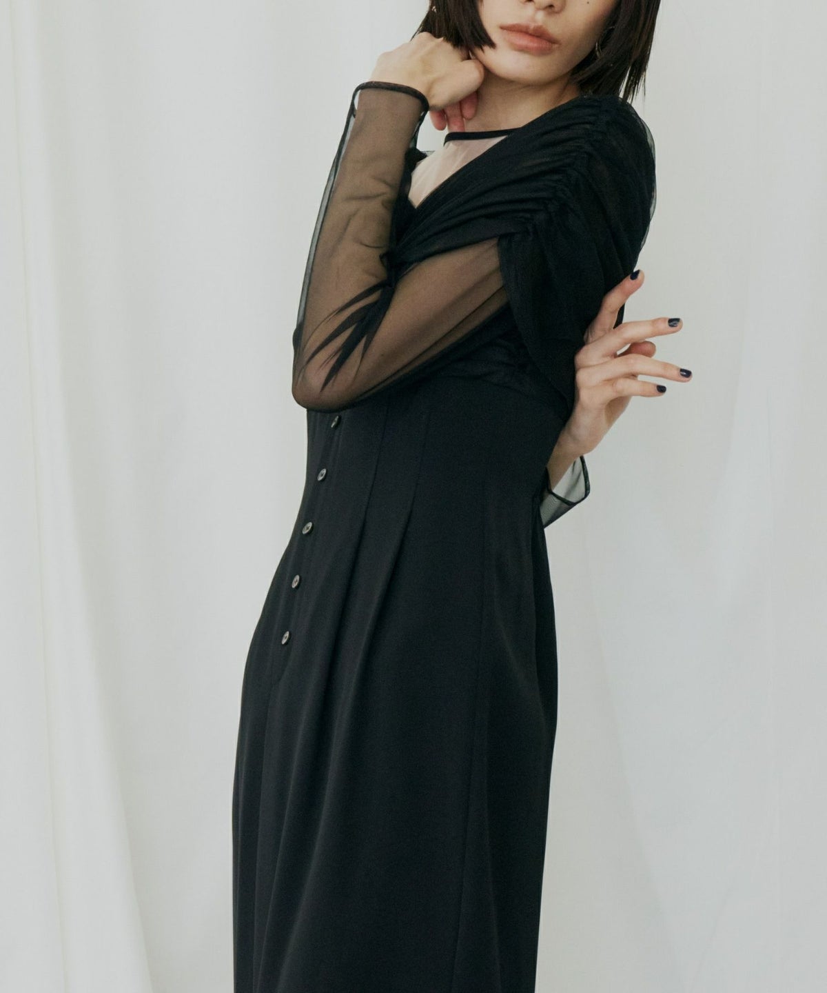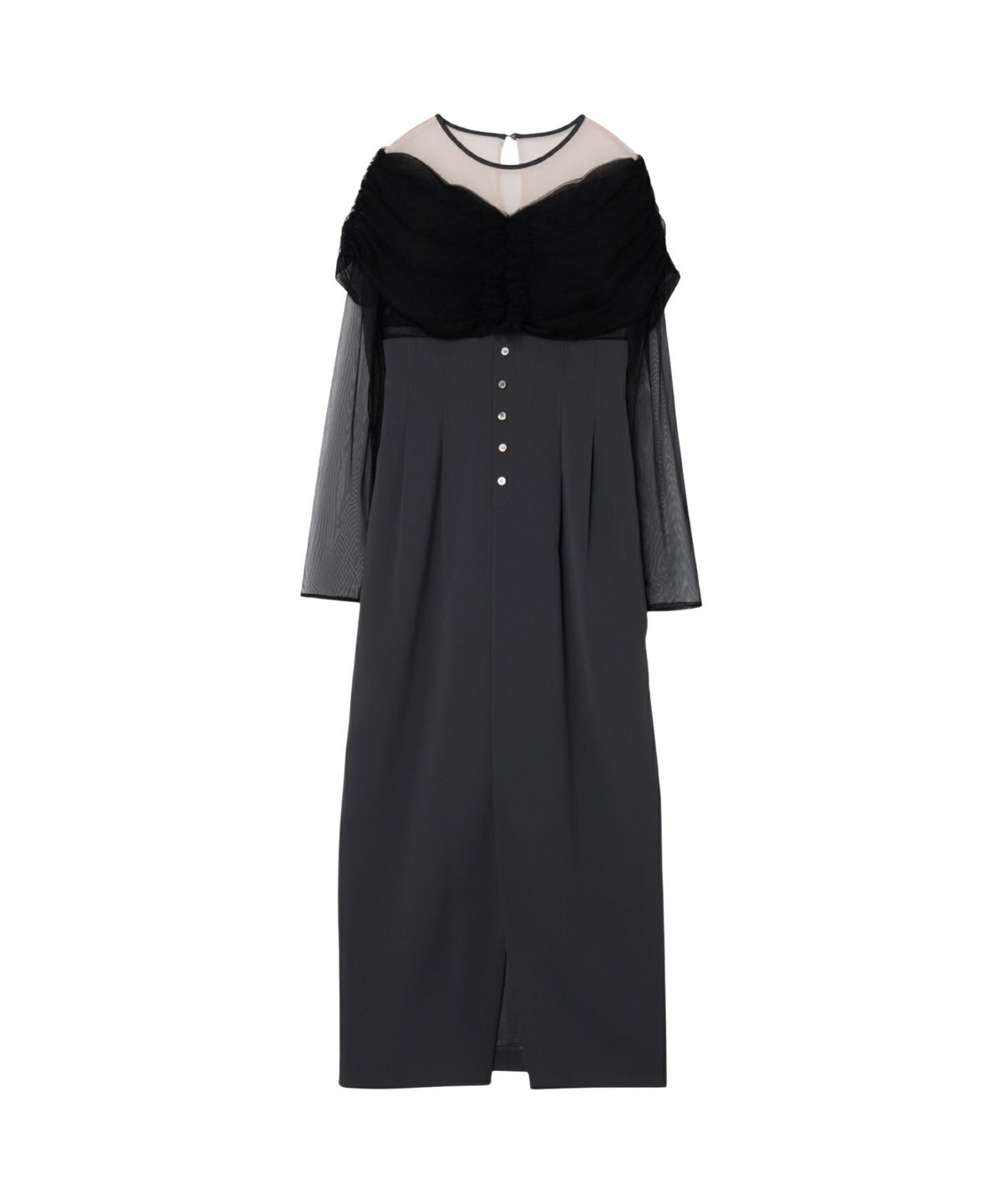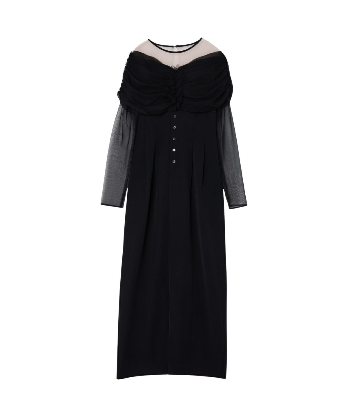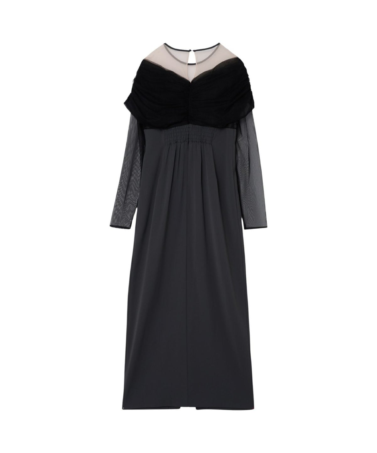 ヨークとスリーブには、透けすぎない上品なシアーチュールを使用し、肌を美しく見せつつも上品な印象に。