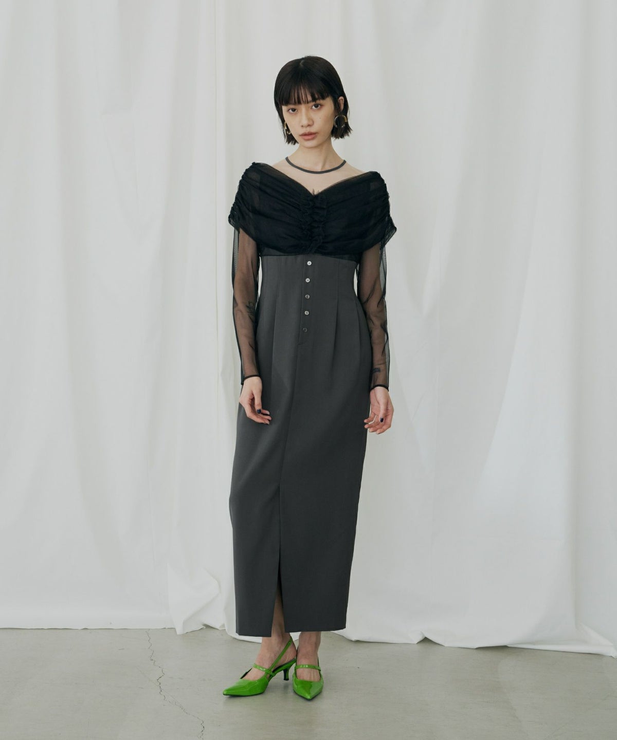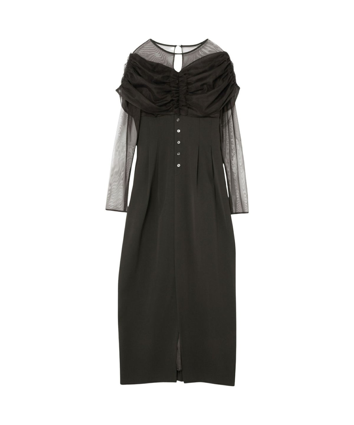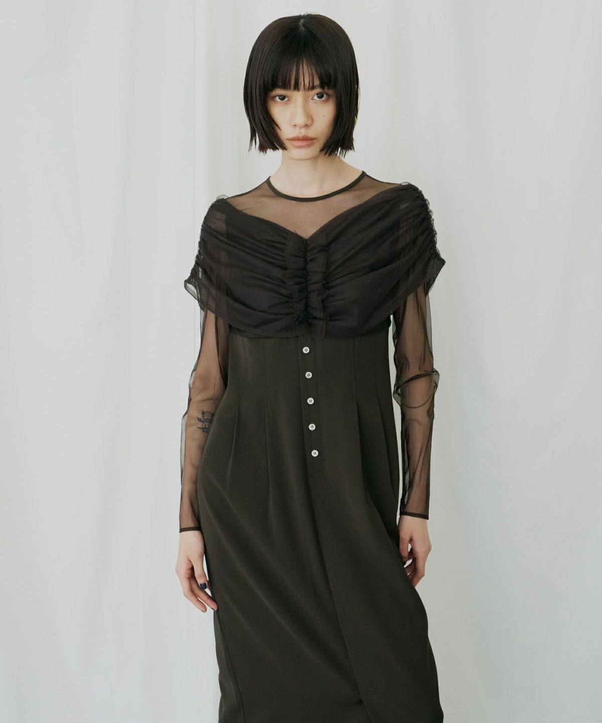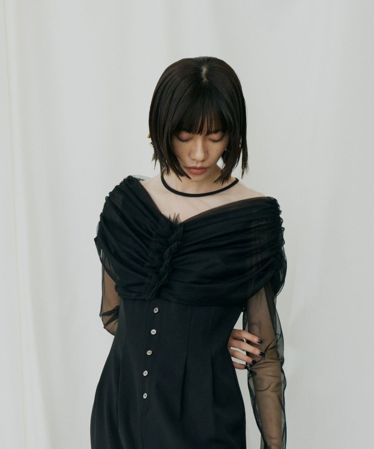 ヨークとスリーブには、透けすぎない上品なシアーチュールを使用し、肌を美しく見せつつも上品な印象に。