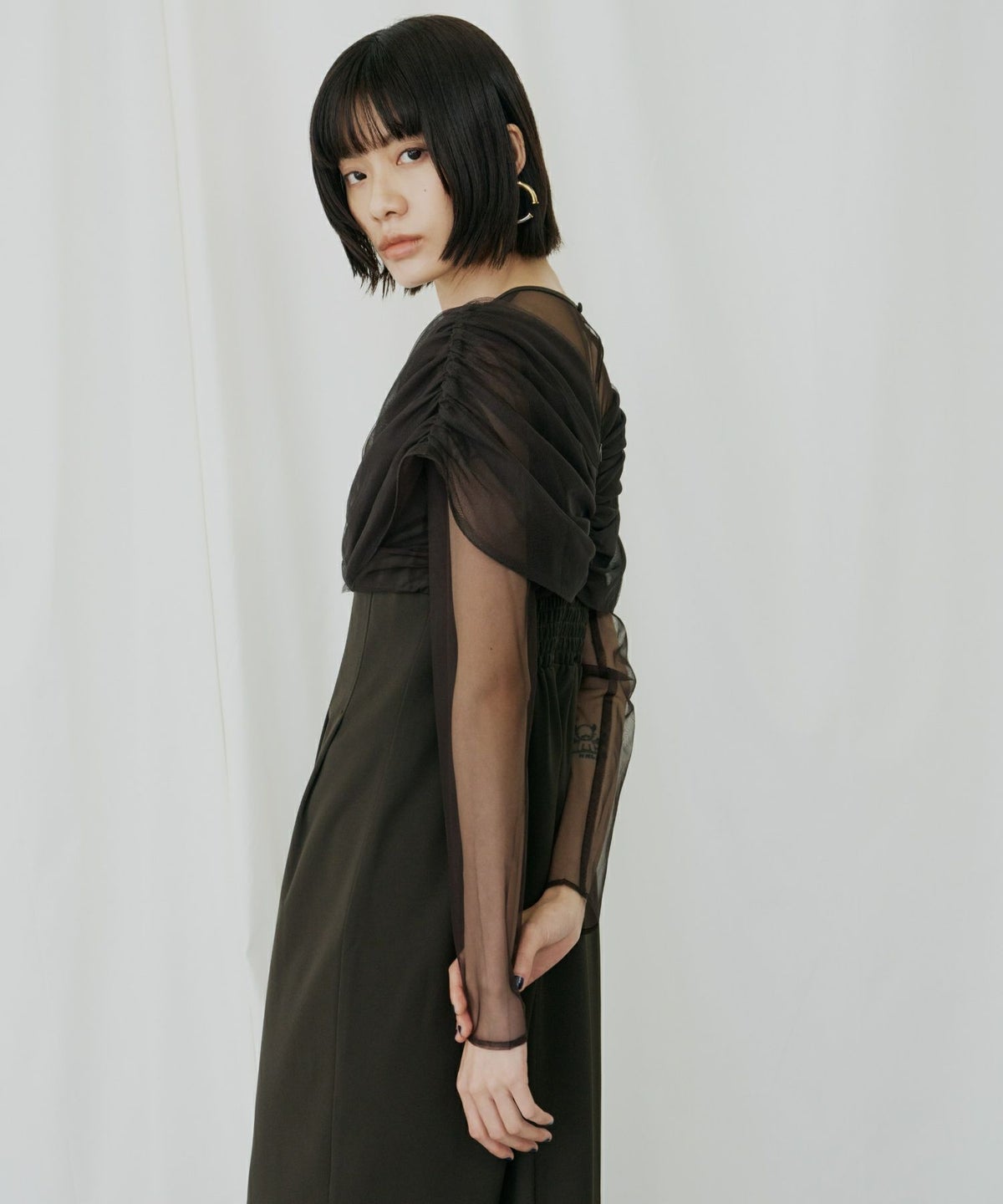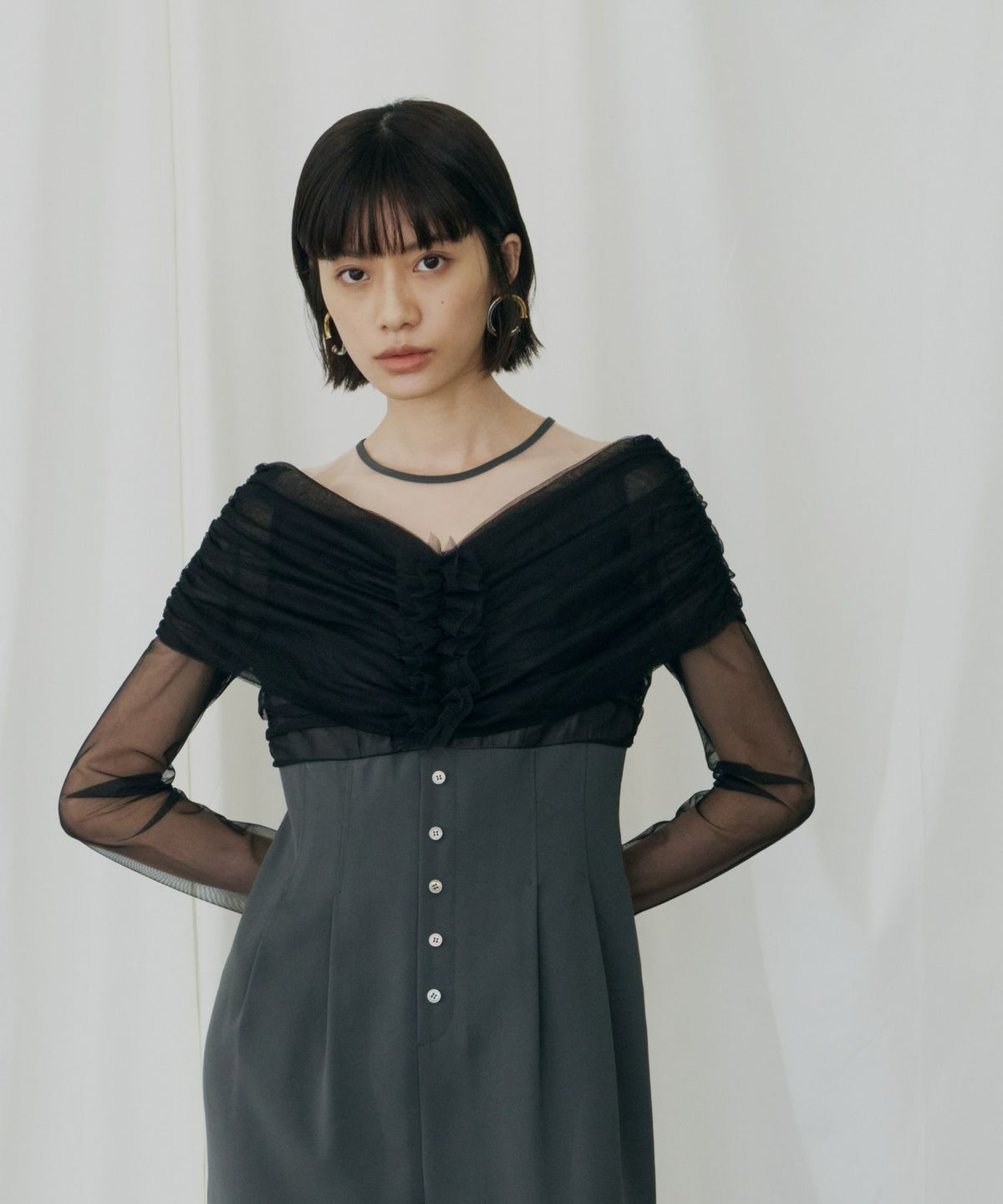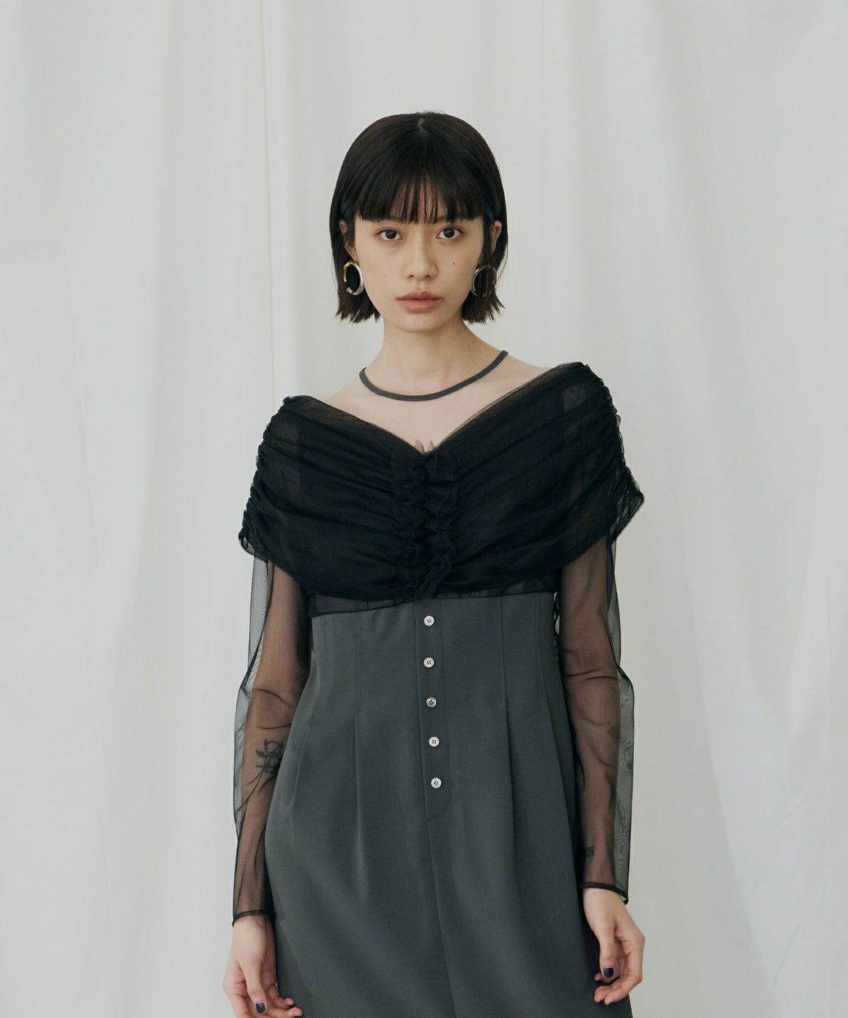 身頃からオフショル部分にたっぷりとギャザーを寄せた中央のフリルが立体的な表情と存在感を放つ。