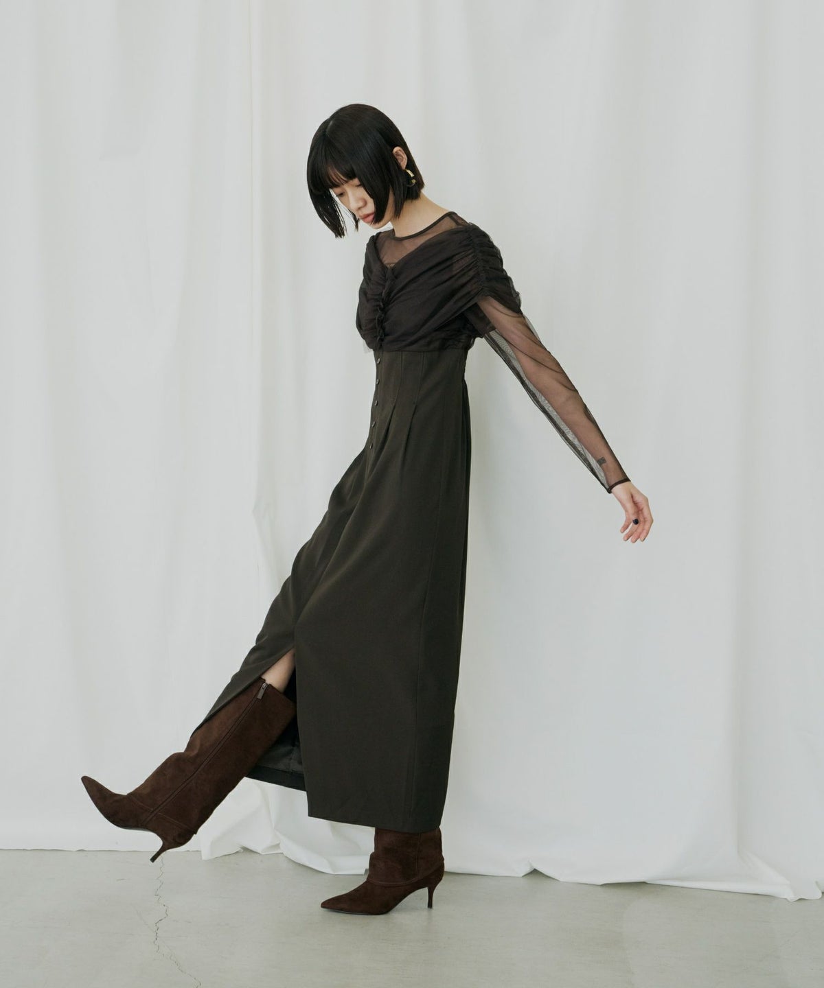 切替位置高めのウエストで足長効果も抜群。