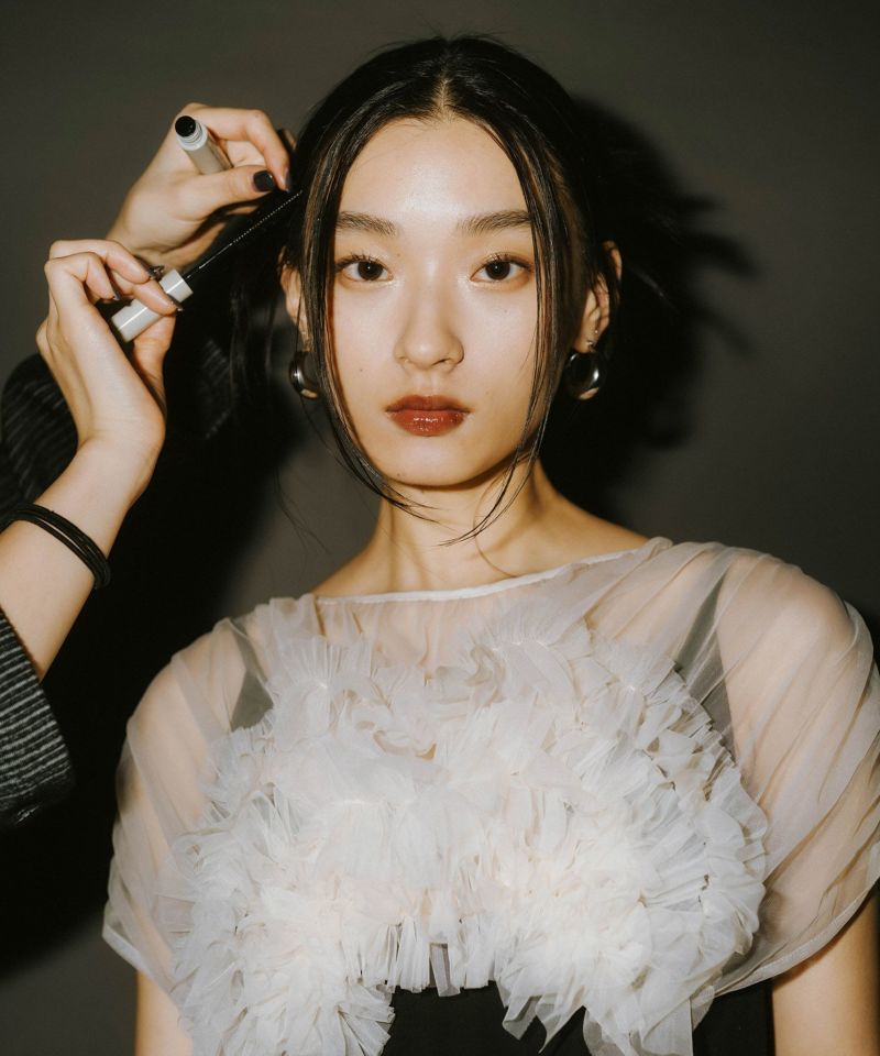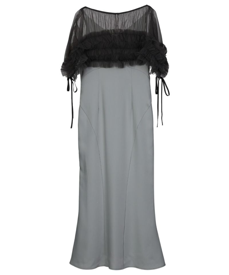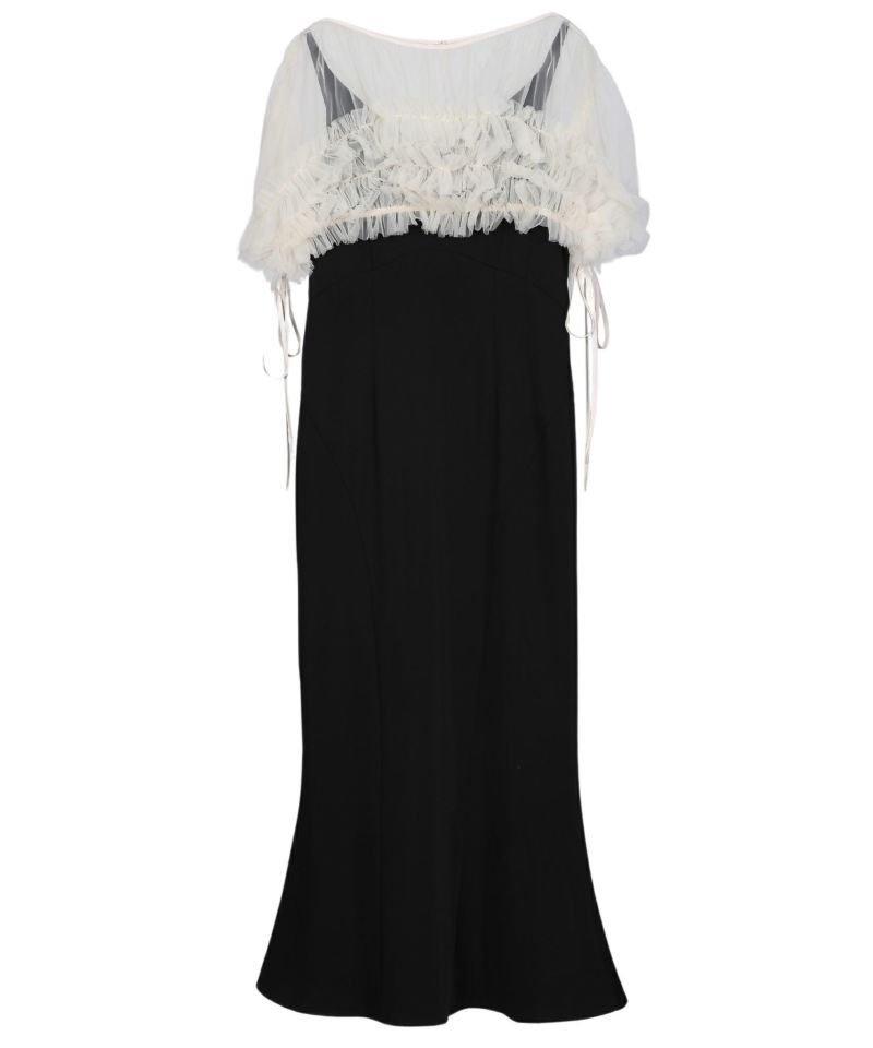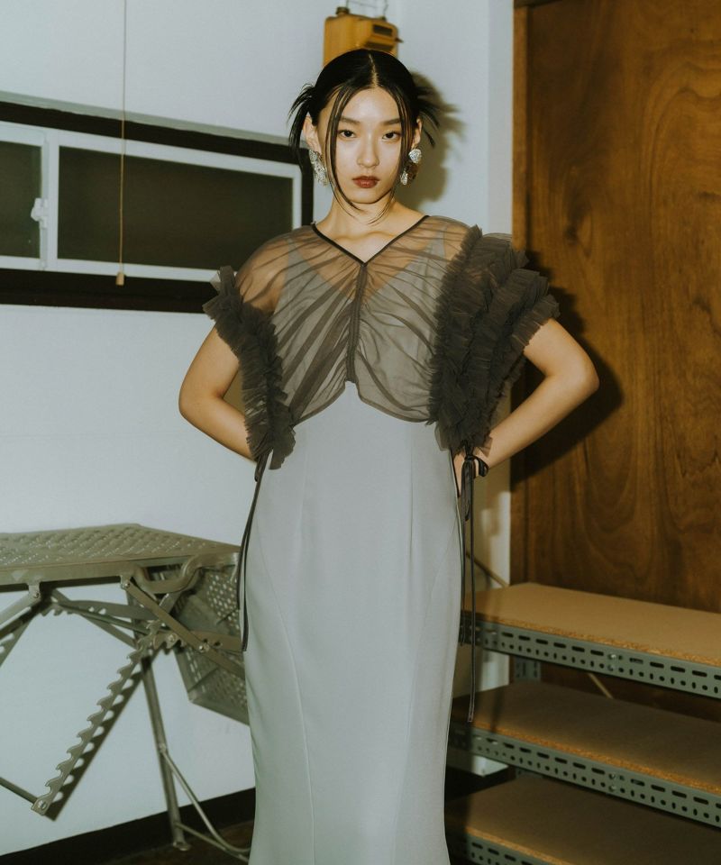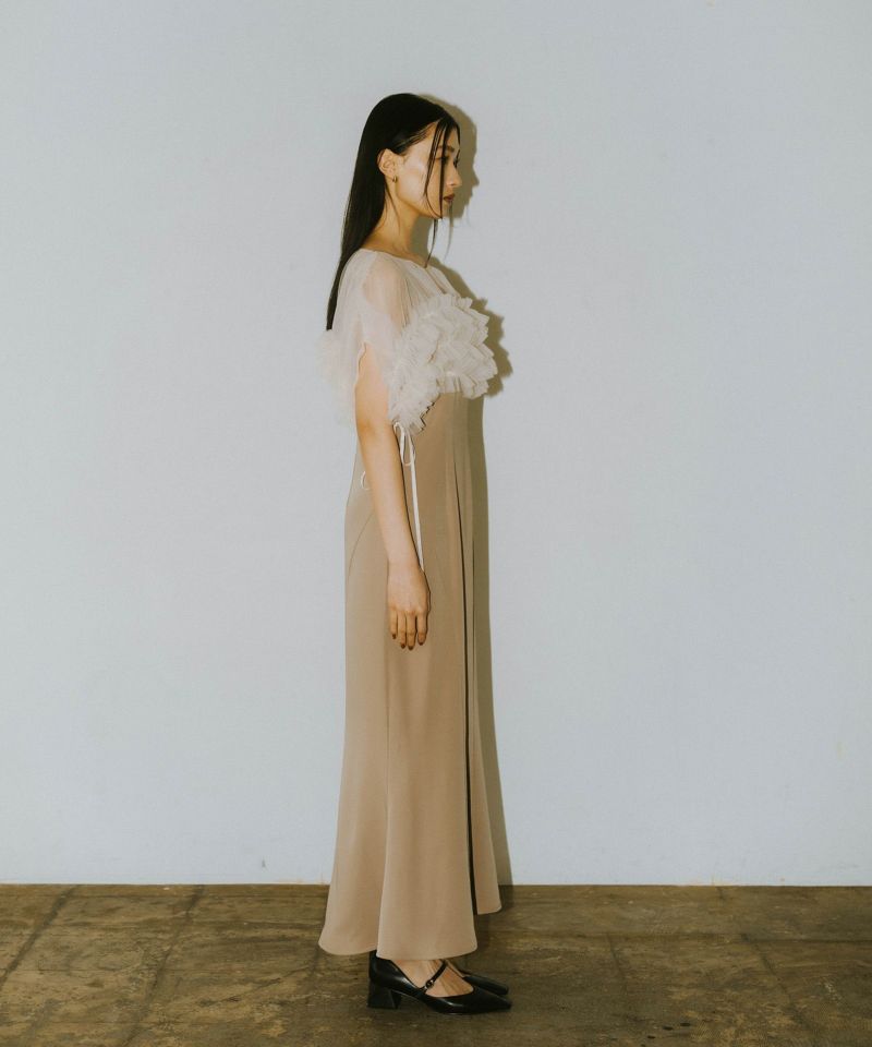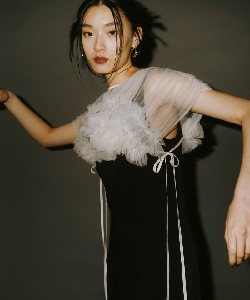 細かい網目のナイロンチュールでふんわりソフトな質感のフリルを重ね、重さを感じさせない繊細な印象に。