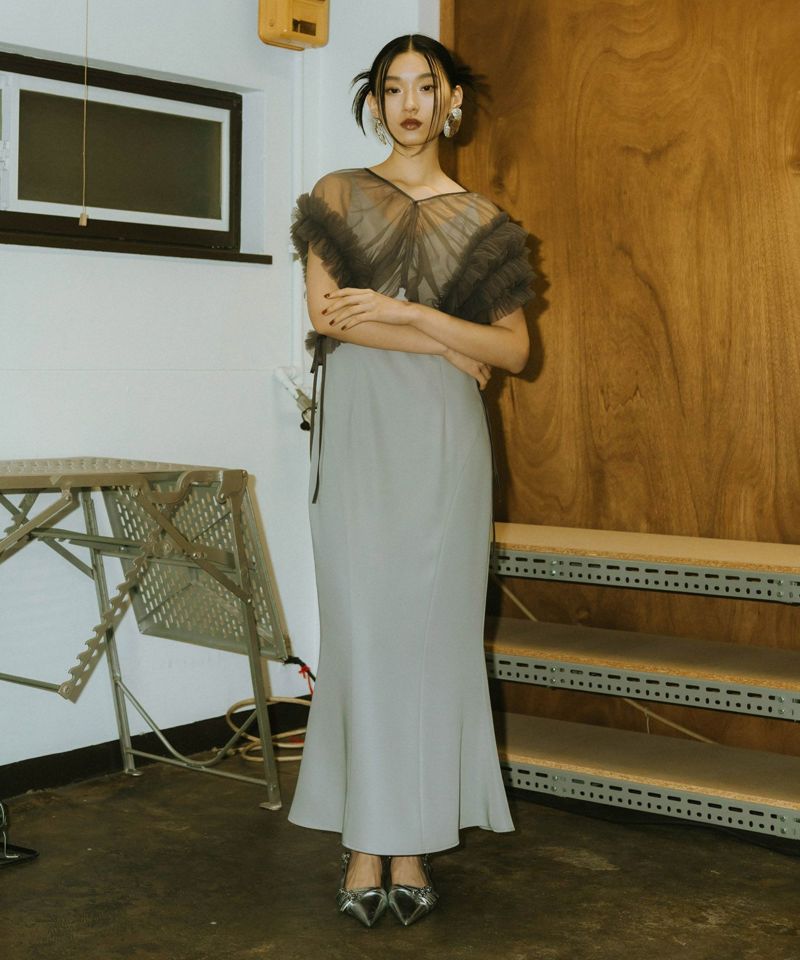 女性らしいカーブを描きつつシャープさの残るマーメイドに仕立てるため、程よくシルエットが出る柔らかすぎないさらりとした合繊生地を採用。