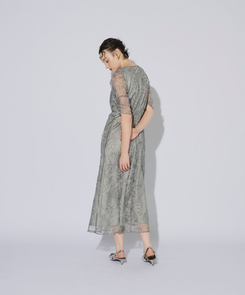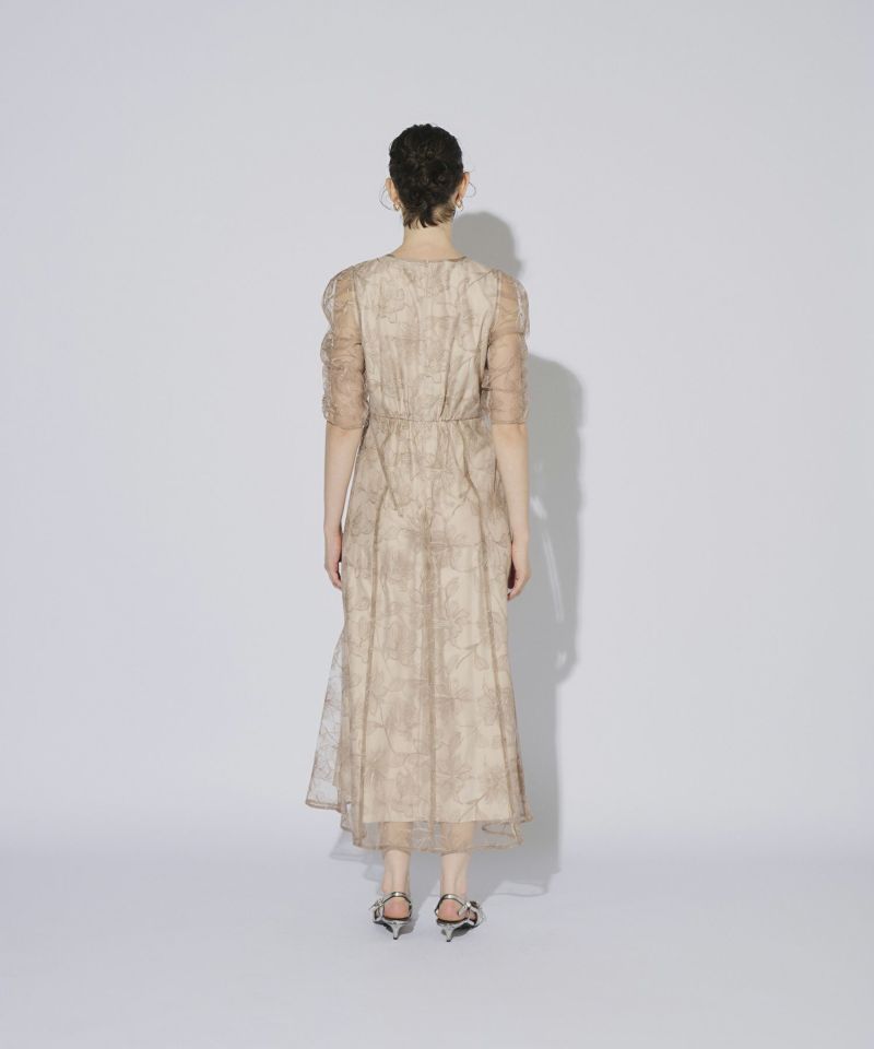 チュール素材に、甘すぎないフラワー柄を刺繍した素材を使用。