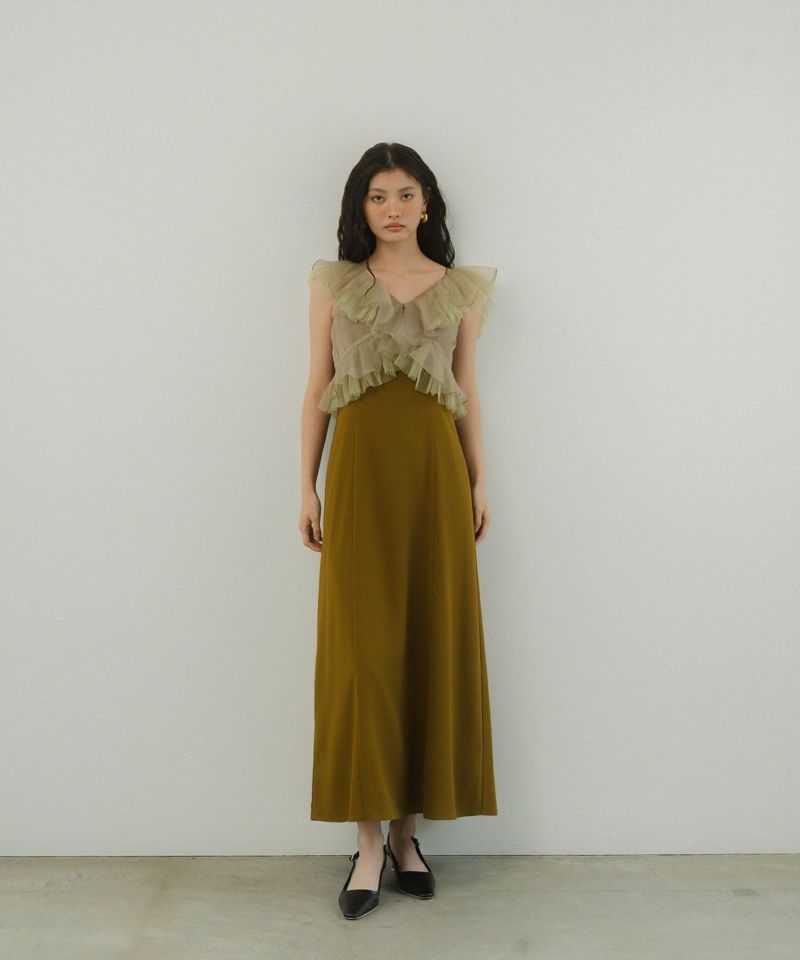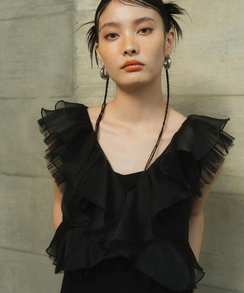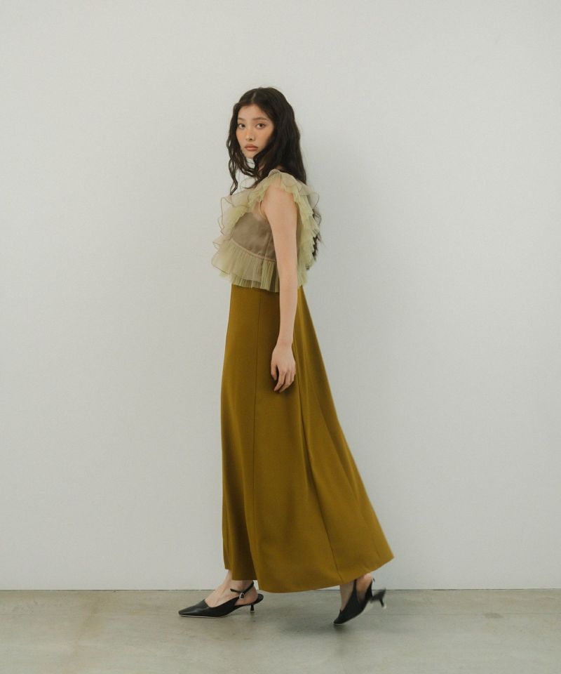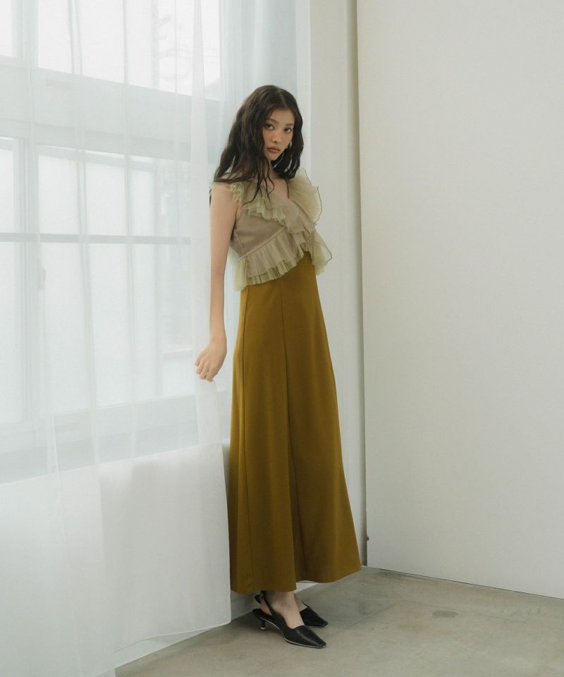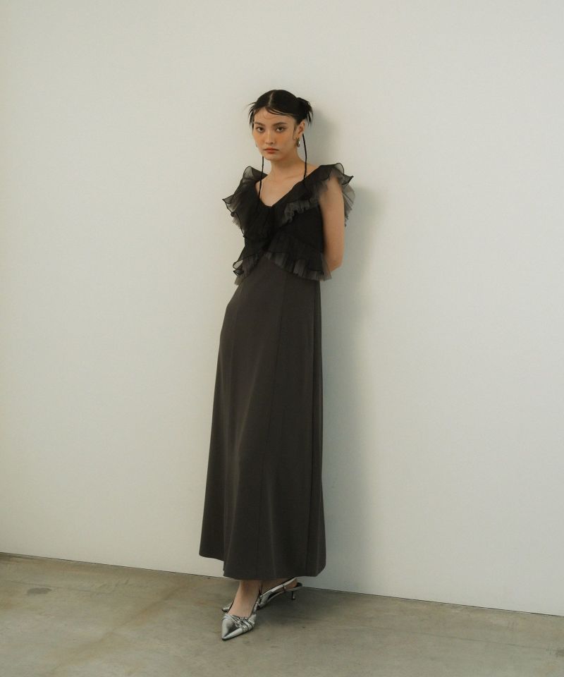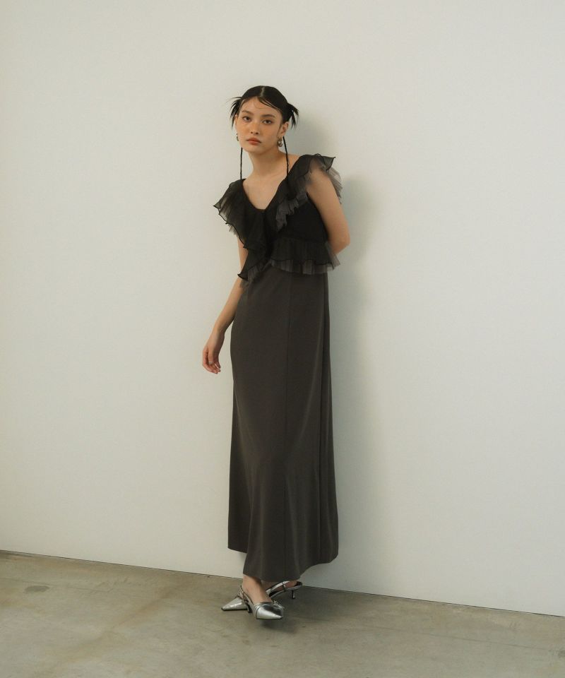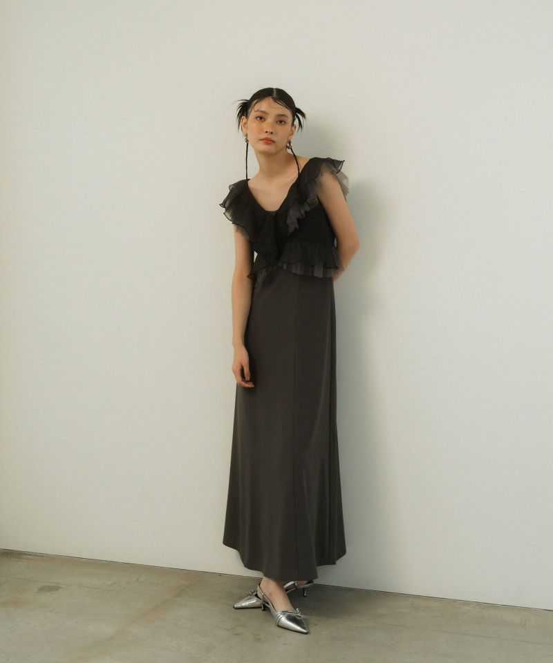 ラッフルとプリーツの異素材MIXが映えるトップスに、フレアラインのキャミドレスを合わせた一枚。