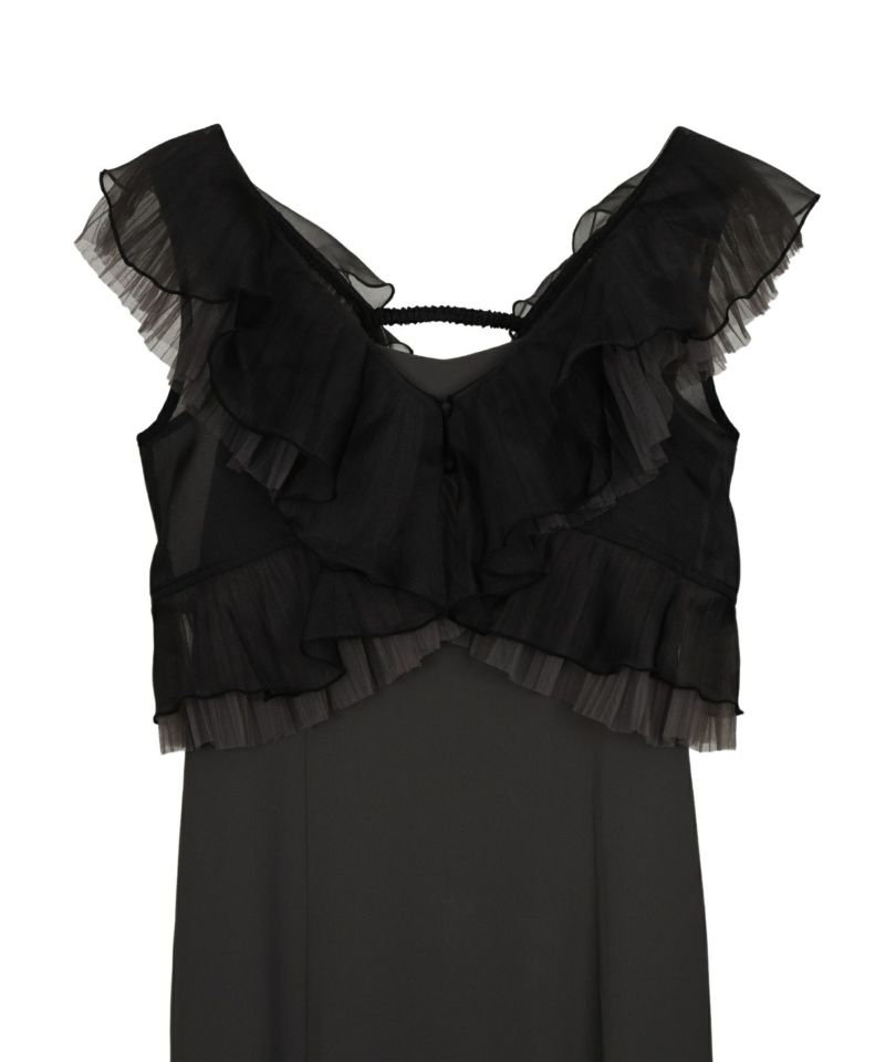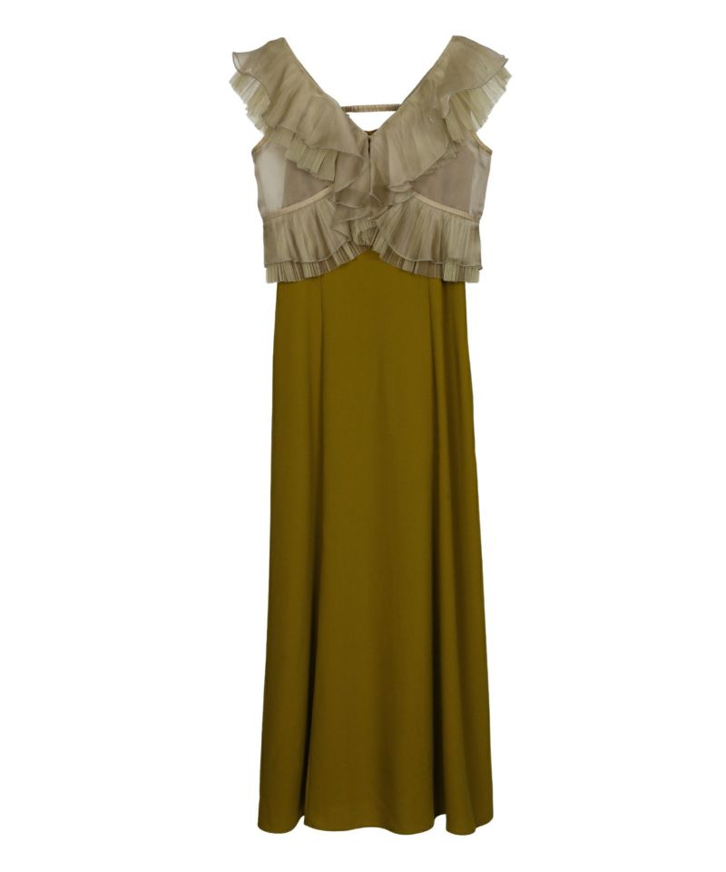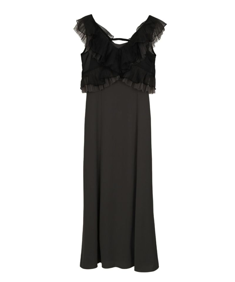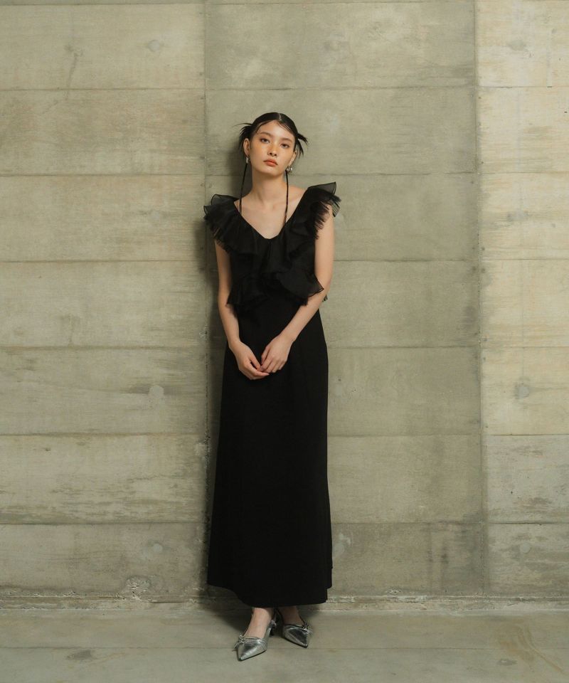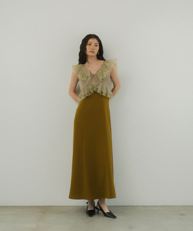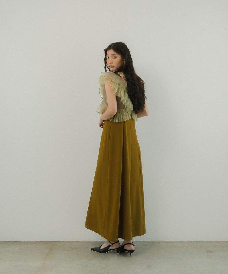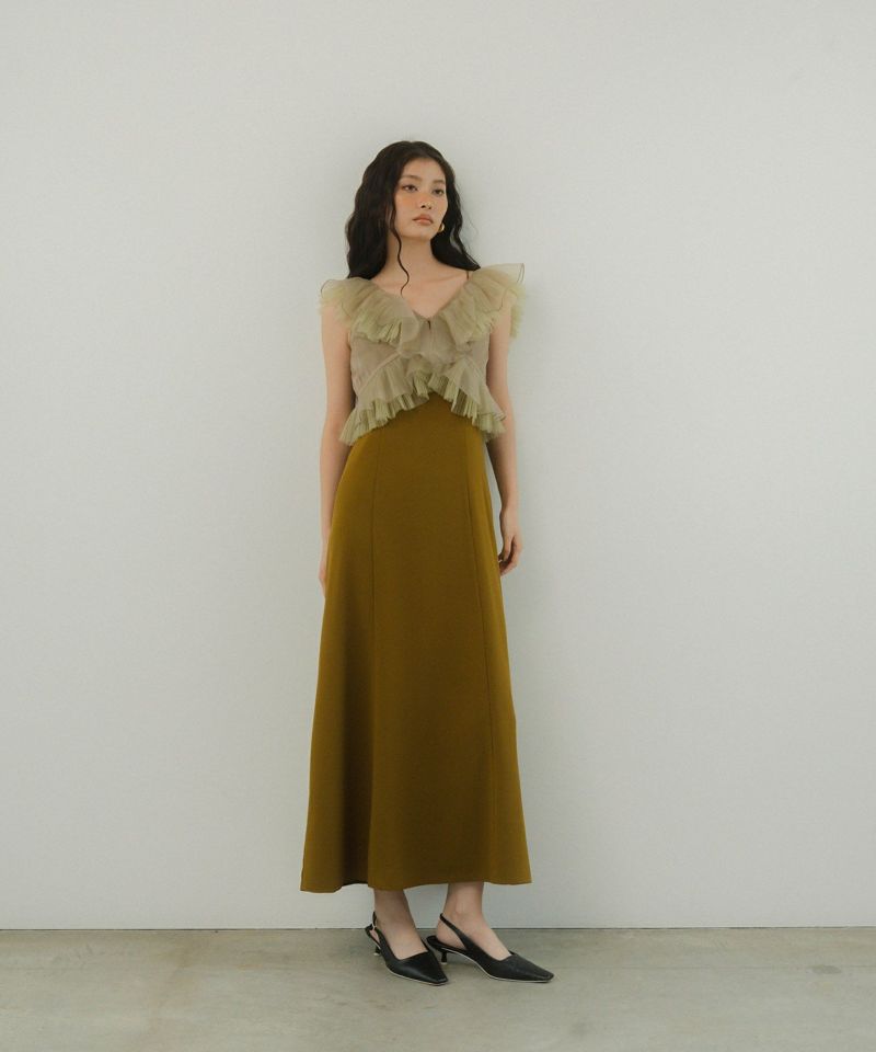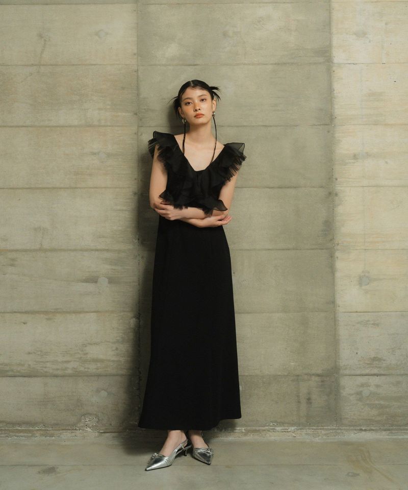 ラッフルとプリーツの異素材MIXが映えるトップスに、フレアラインのキャミドレスを合わせた一枚。