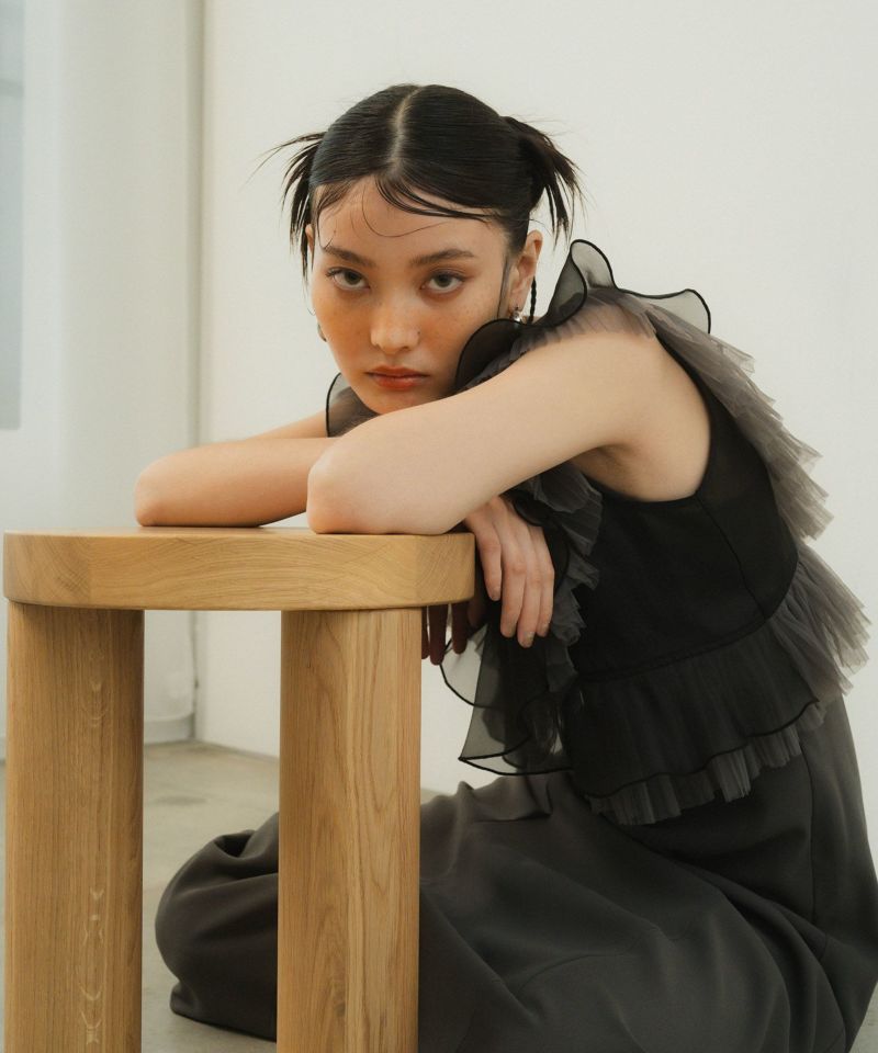 ソフトで繊細なオーガンジーにプリーツチュールを掛け合わせ、質感のコントラストを効かせたトップスは、