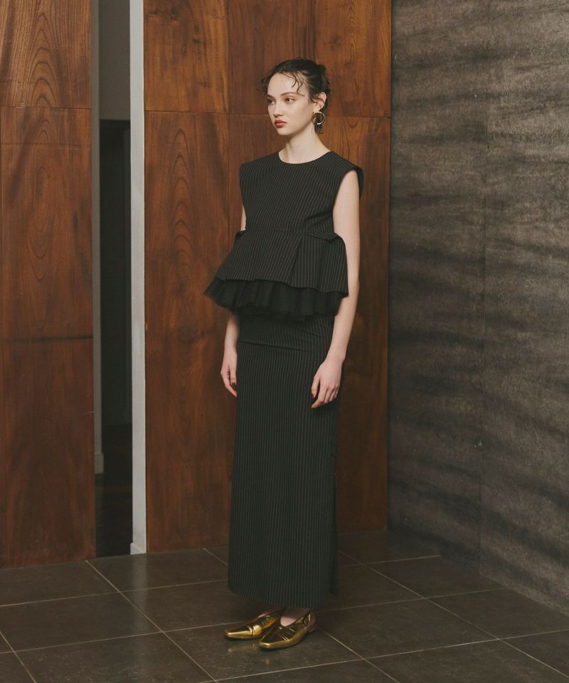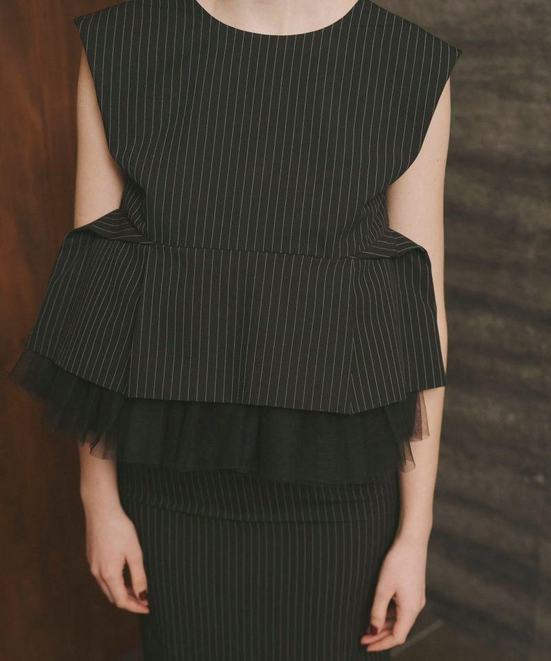 マニッシュな印象を引き立てるピンストライプ素材が魅力のペプラムセットアップ。