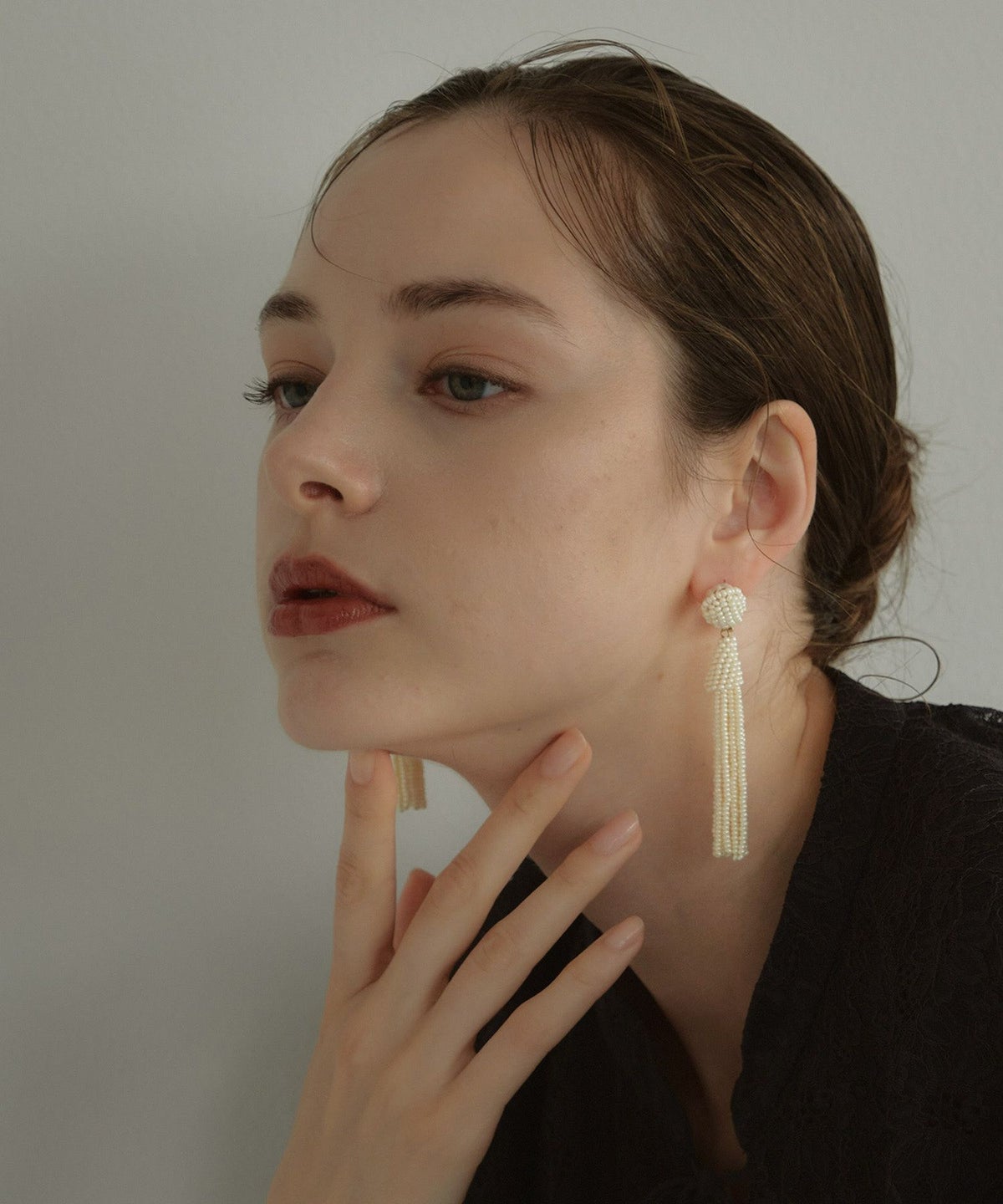 長く肩でゆれるタイプのピアスで、首からデコルテにかけて美しいシルエットに魅せてくれます。
