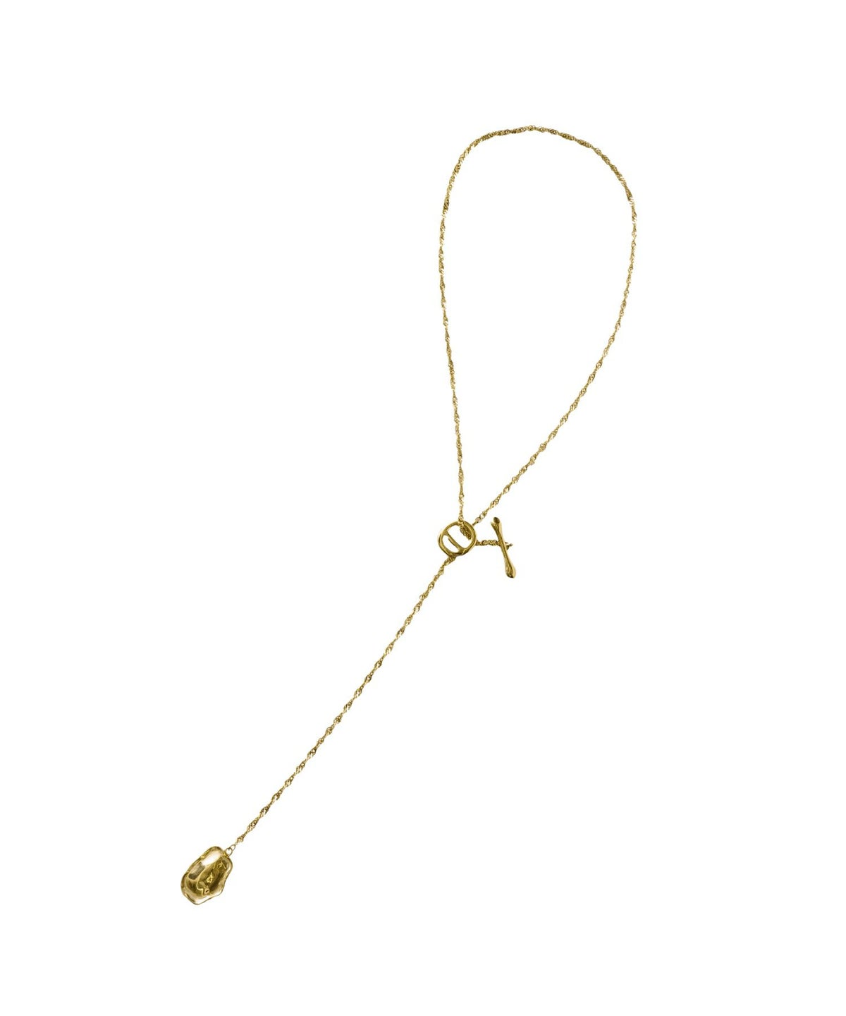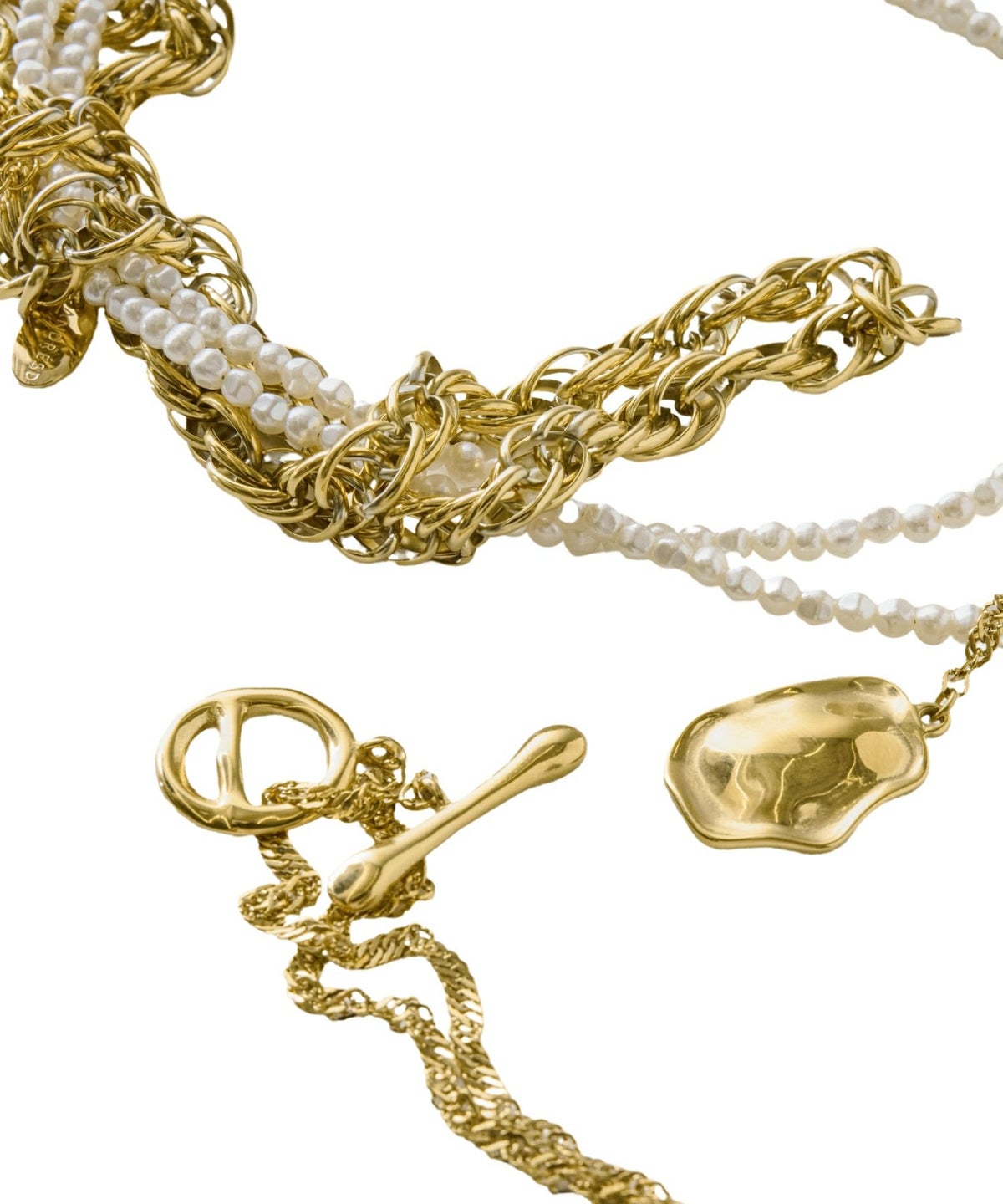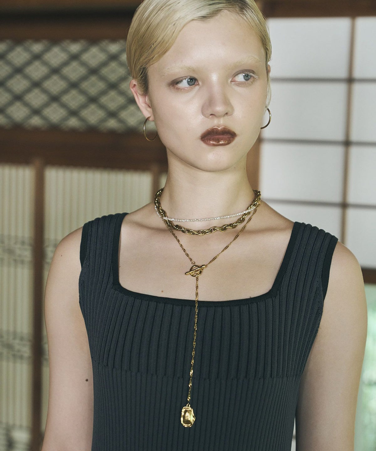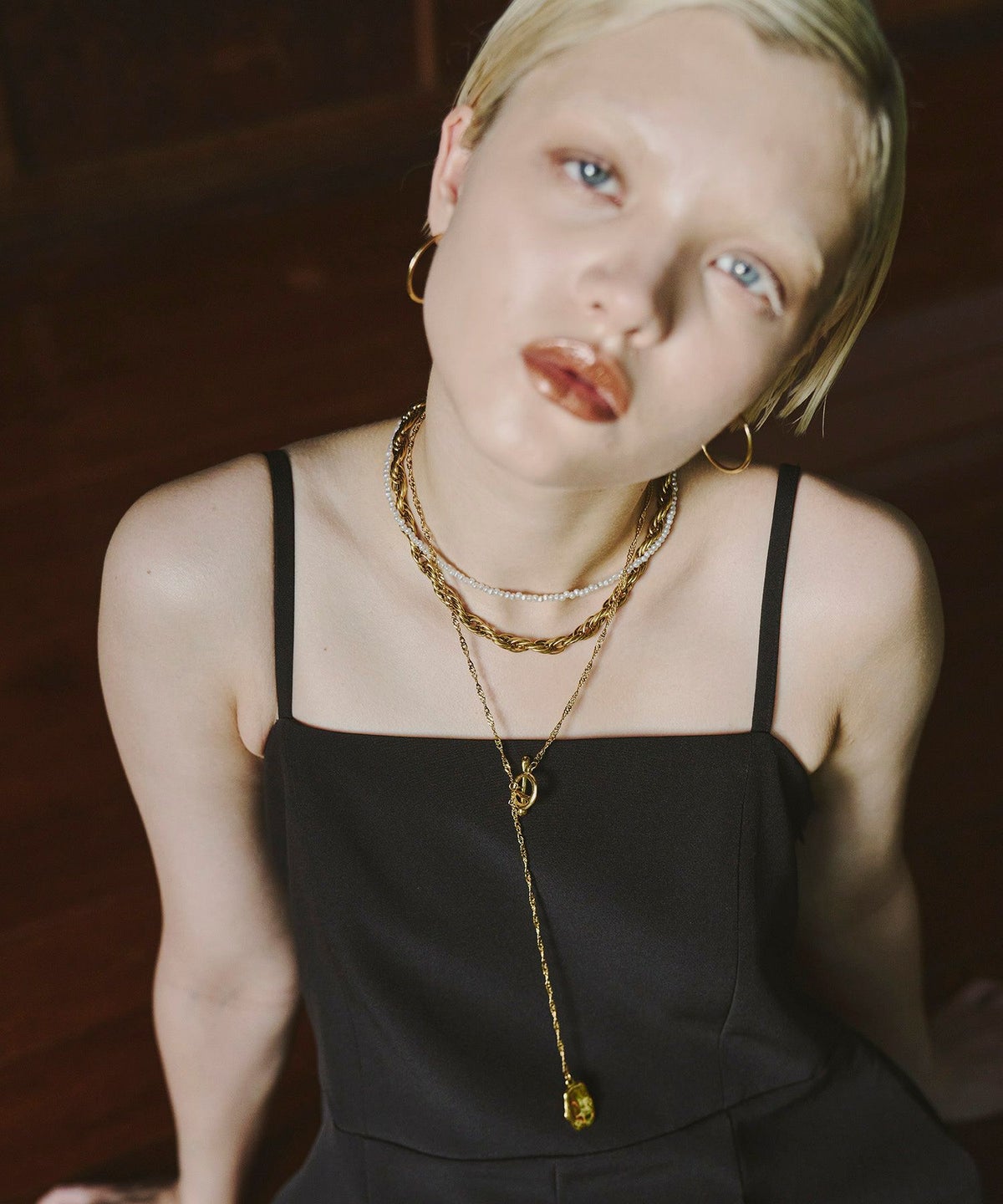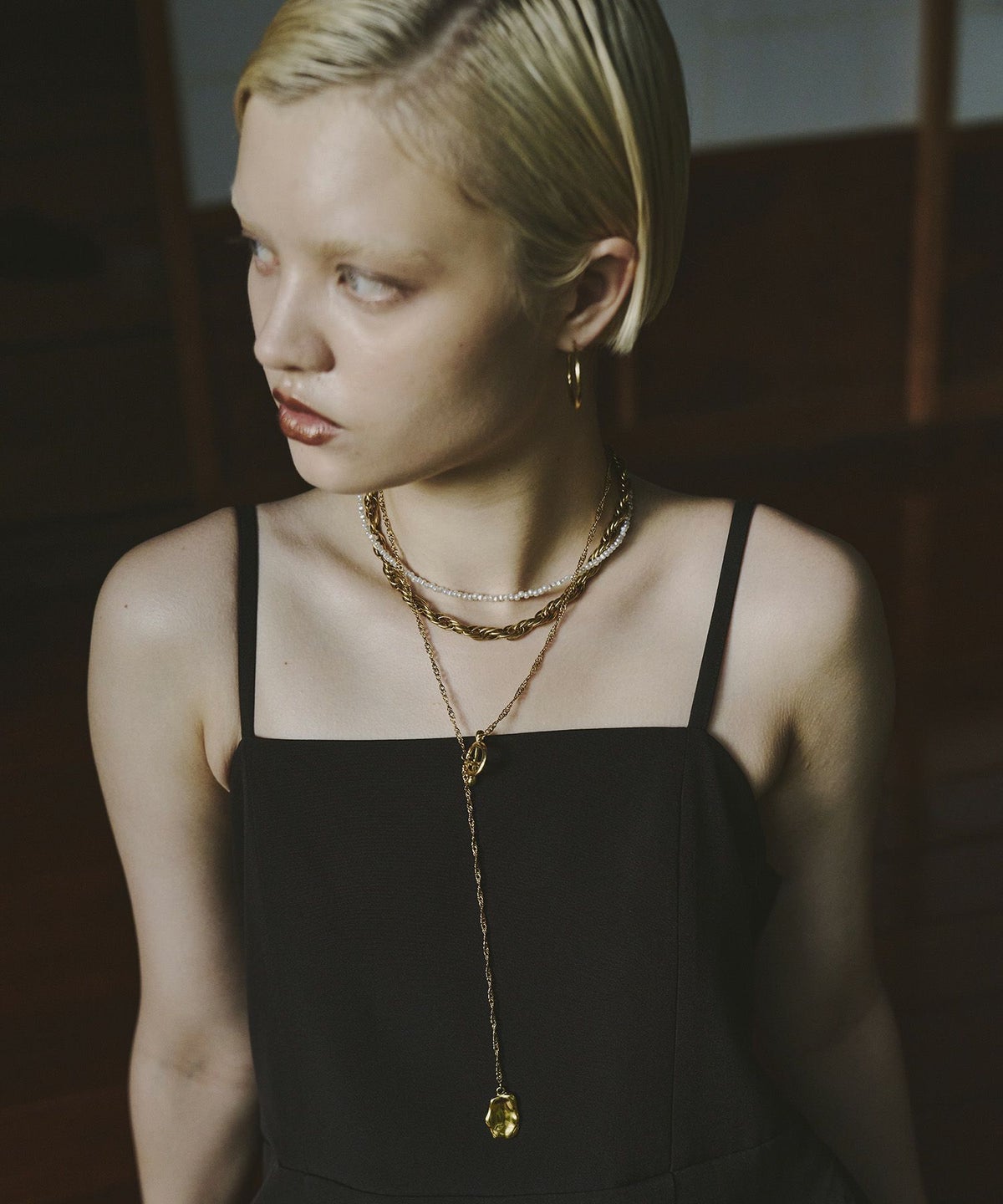 ロングタイプのパールネックレスとY字チェーンネックレスは、後ろにも垂らせる仕様。
