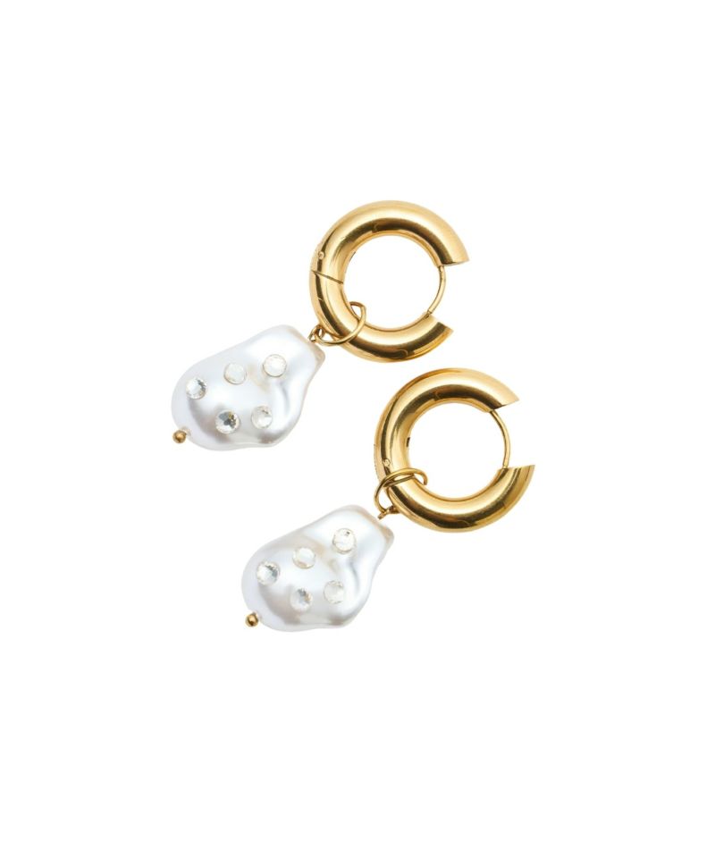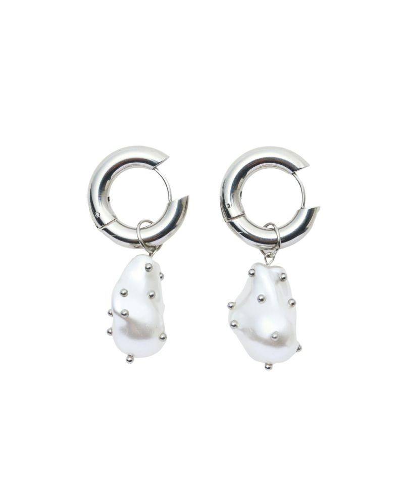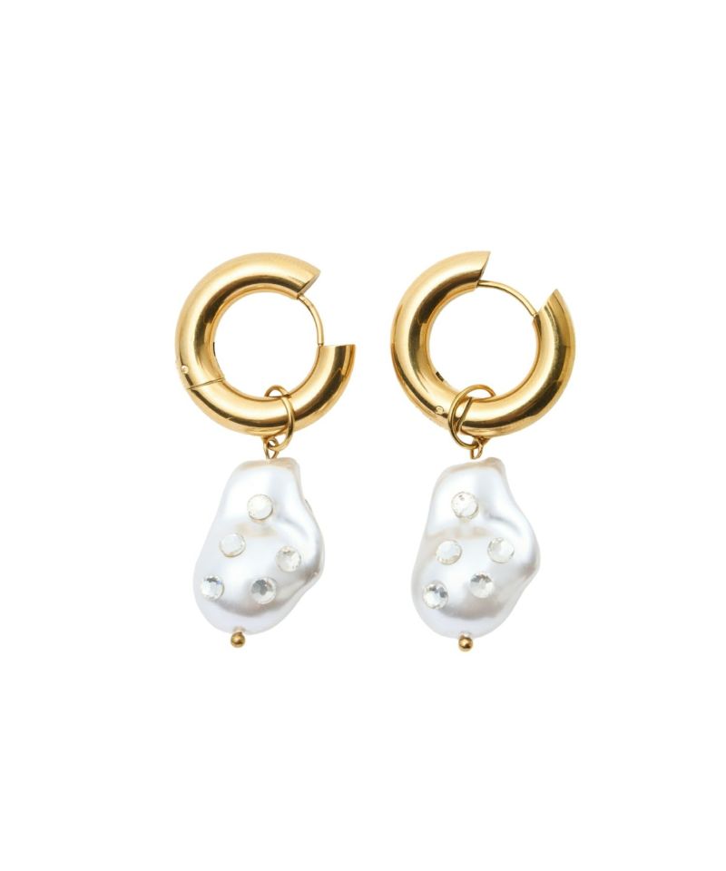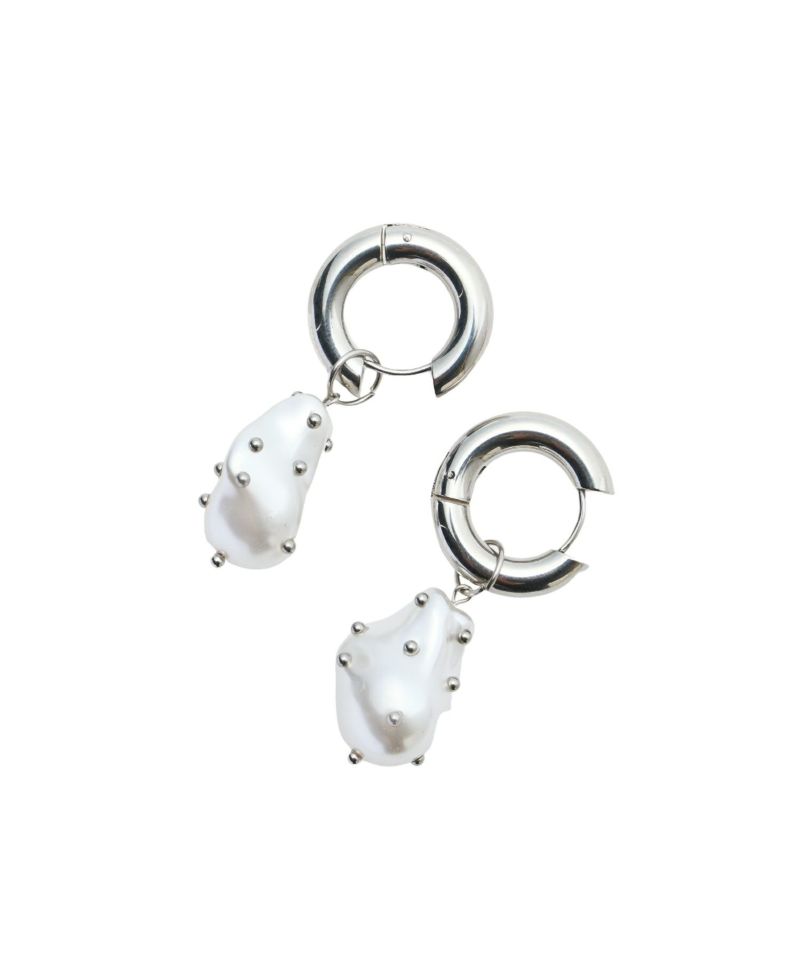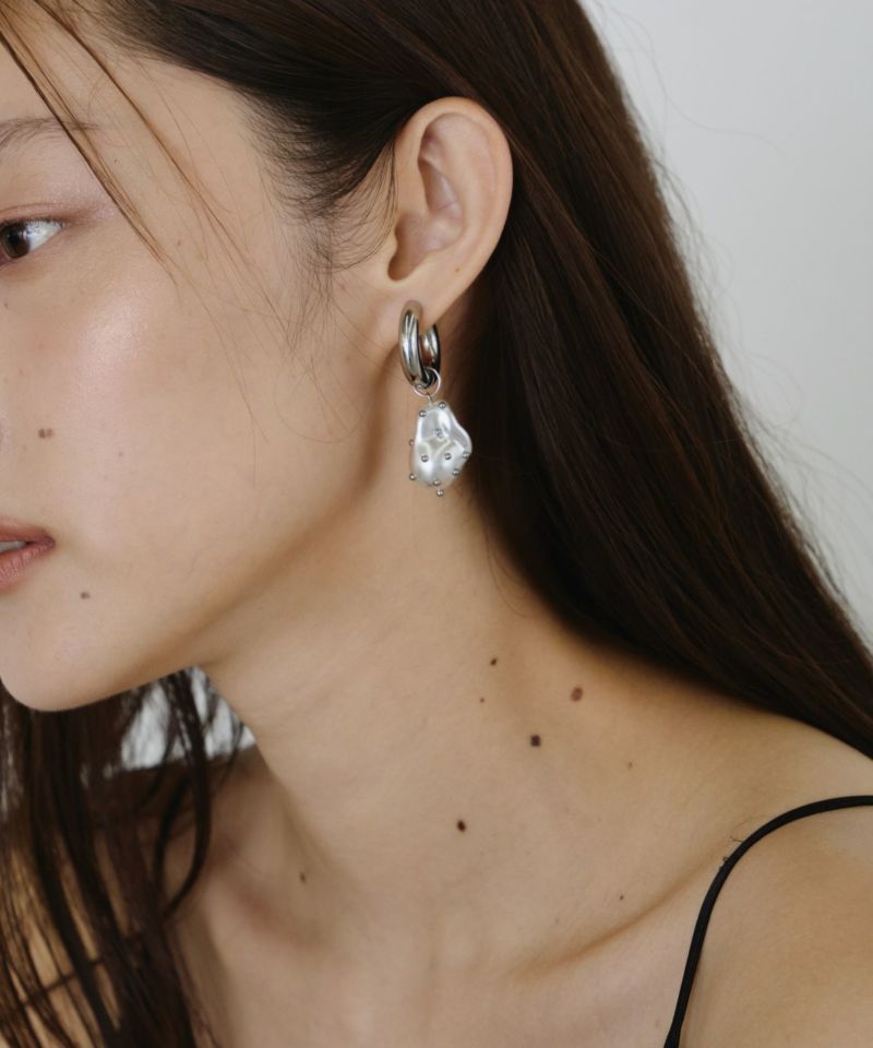 存在感のあるバロックパールに、ランダムに散りばめられたスタッズやジルコンを組み合わせたピアス。