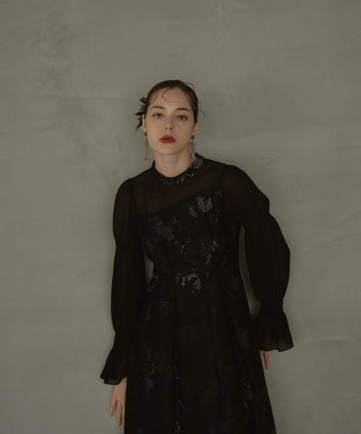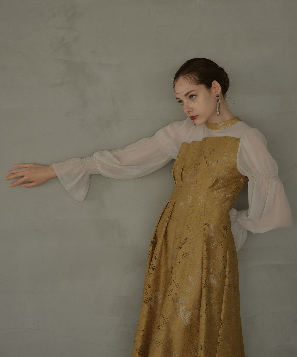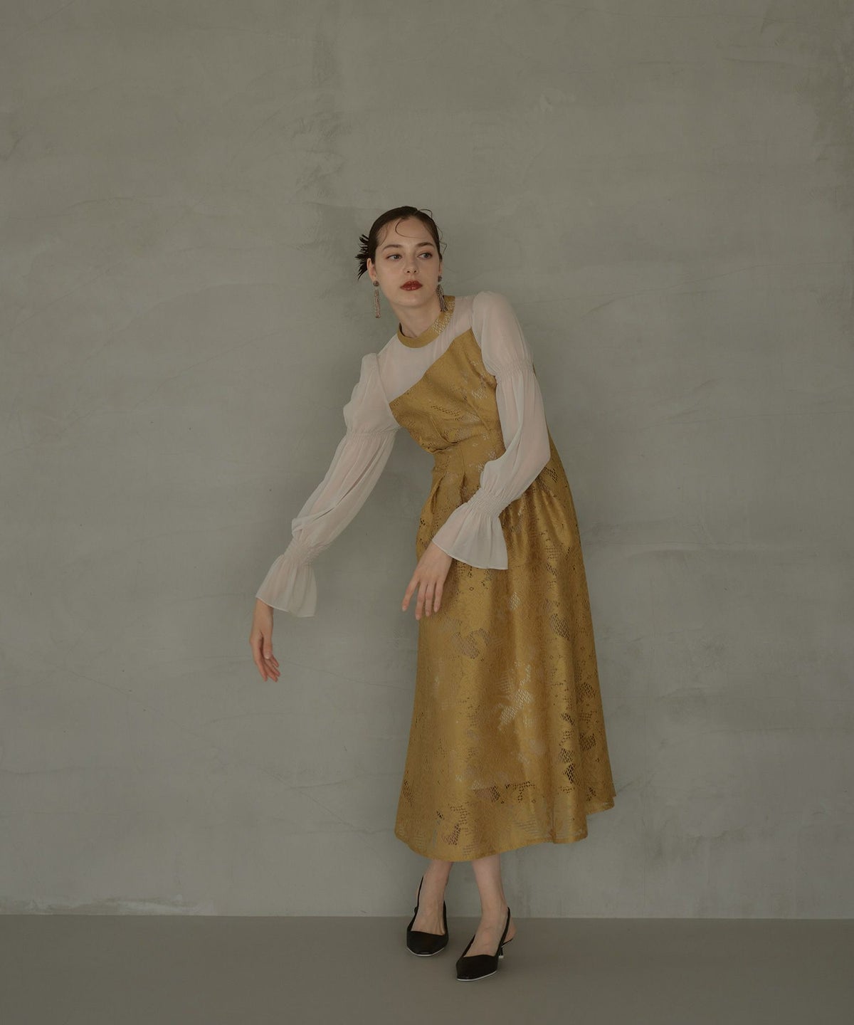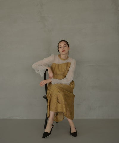 デコルテ部分にはアシンメトリーなデザインが施され、独特の魅力を放ちます。
