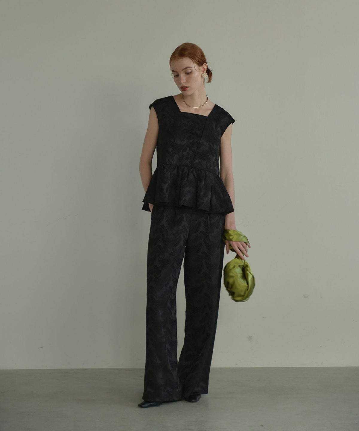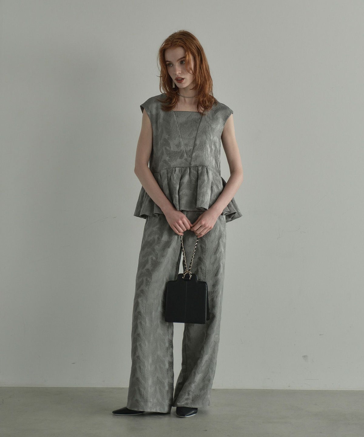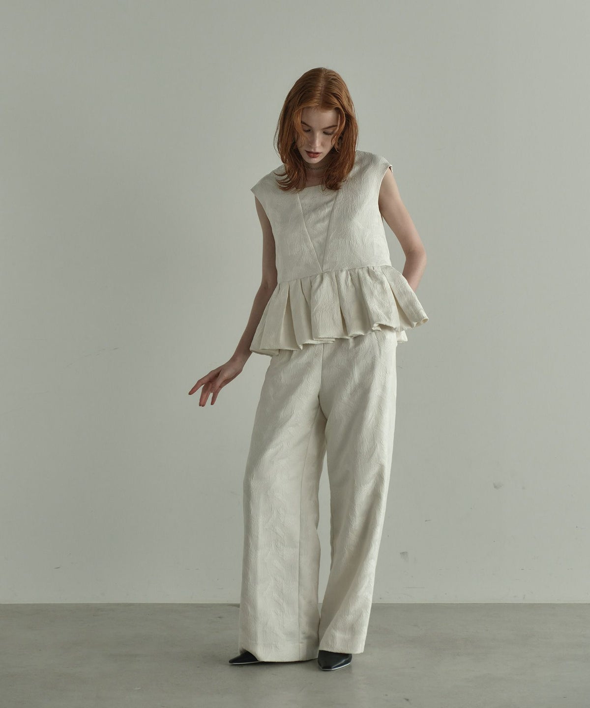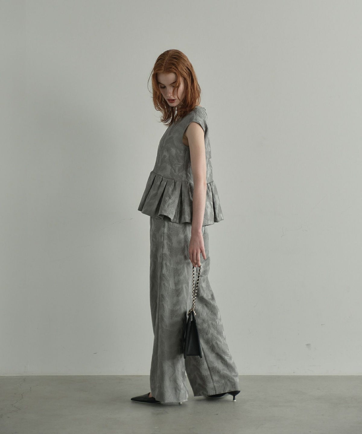 フェザー柄のジャガード素材でお作りした、パンツセットアップ。
