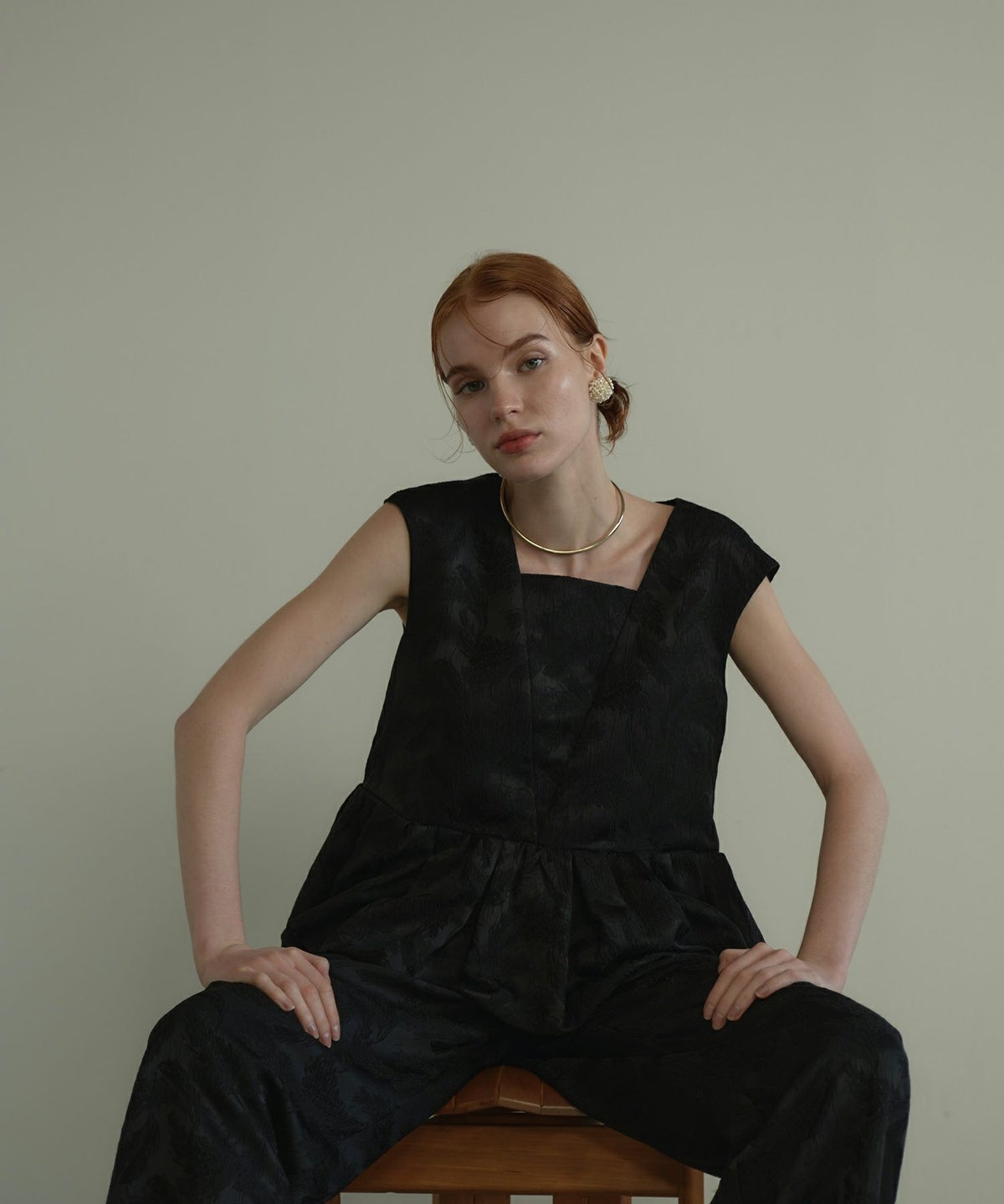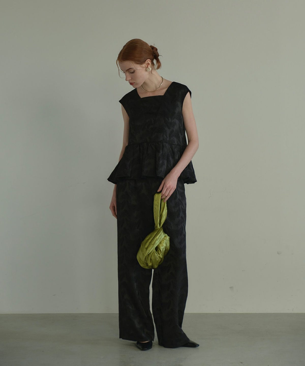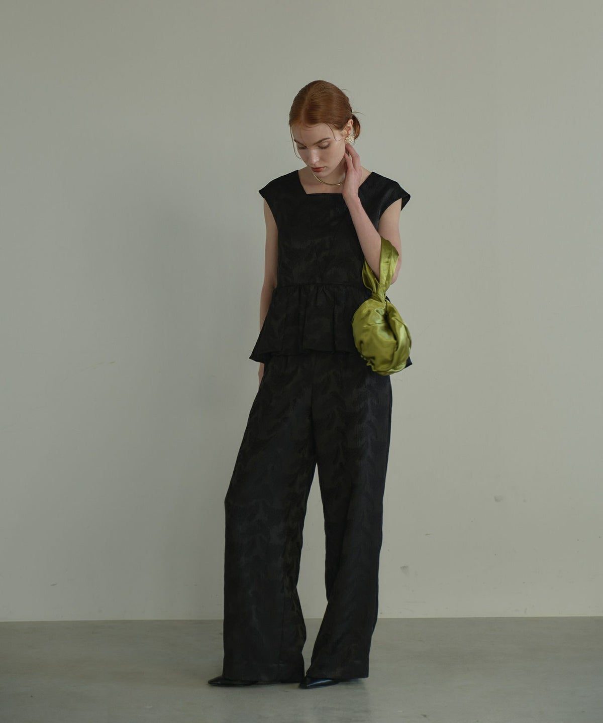 フェザー柄のジャガード素材でお作りした、パンツセットアップ。