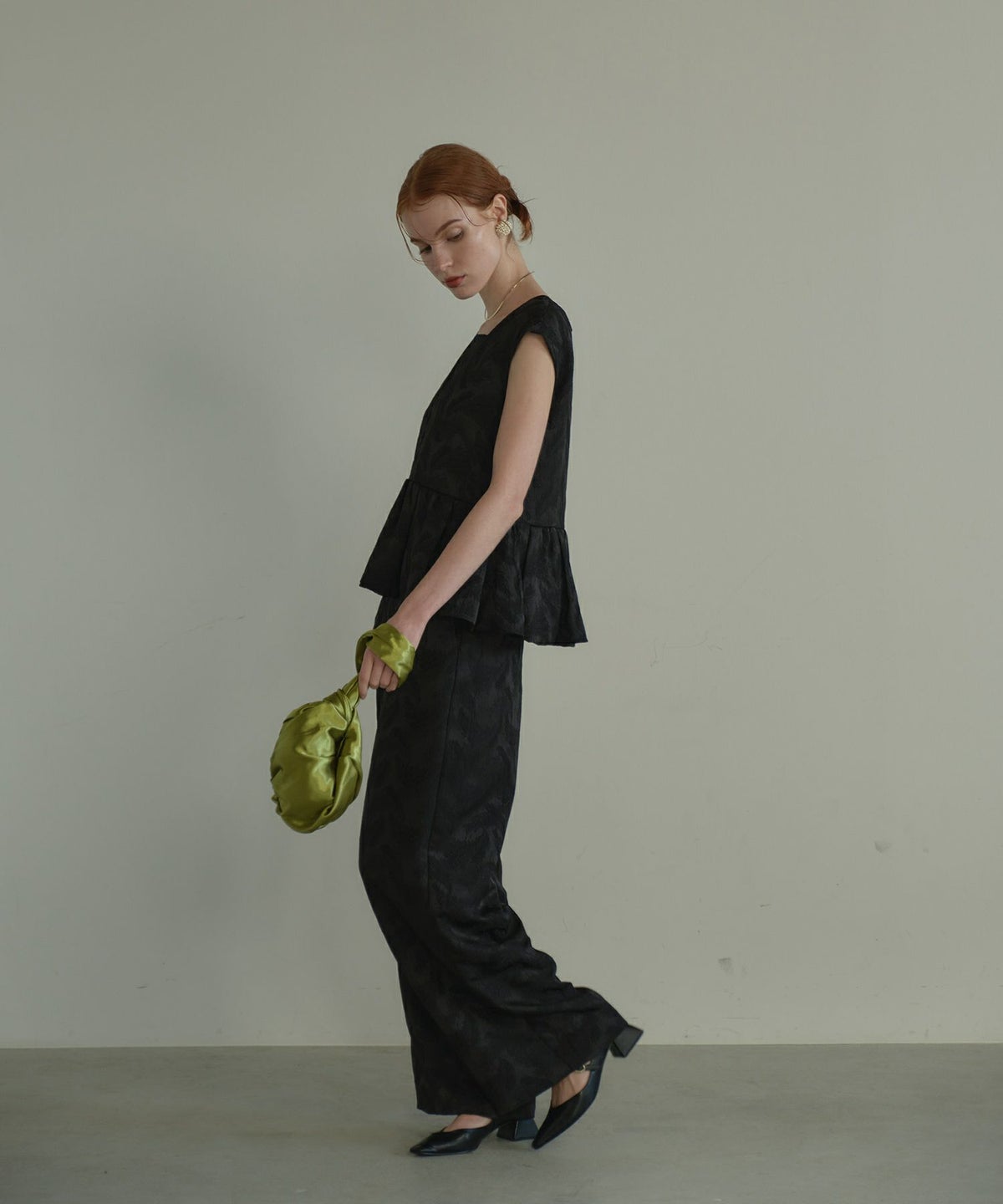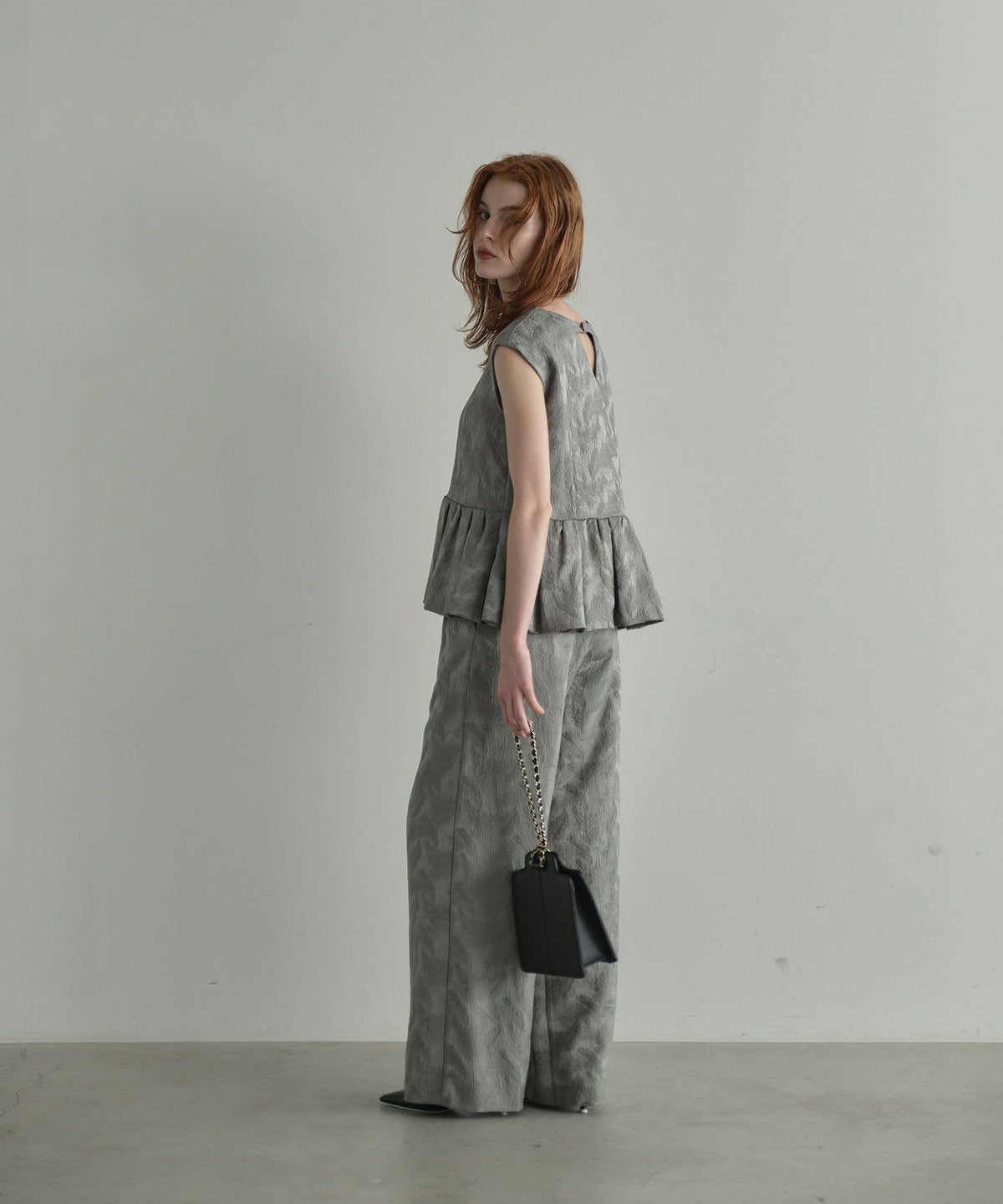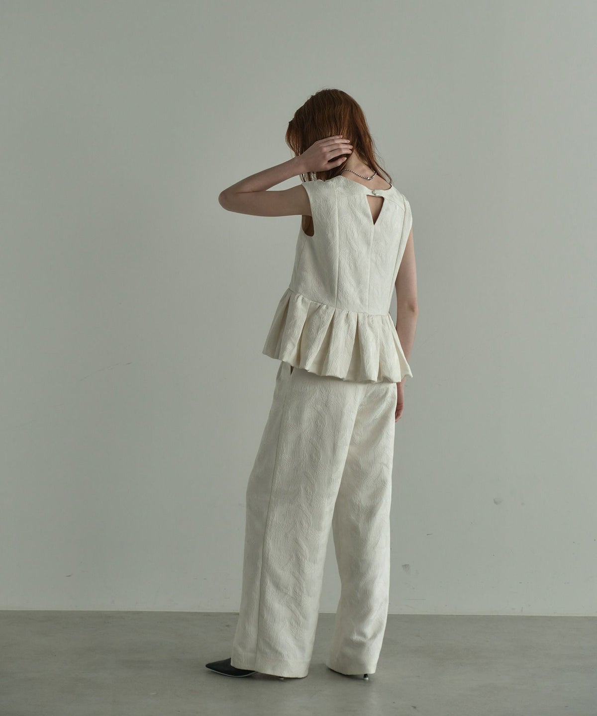 スタイルアップして見える理由でもある"ボリュームのあるペプラム"が動きに合わせて揺れるのも魅力。
