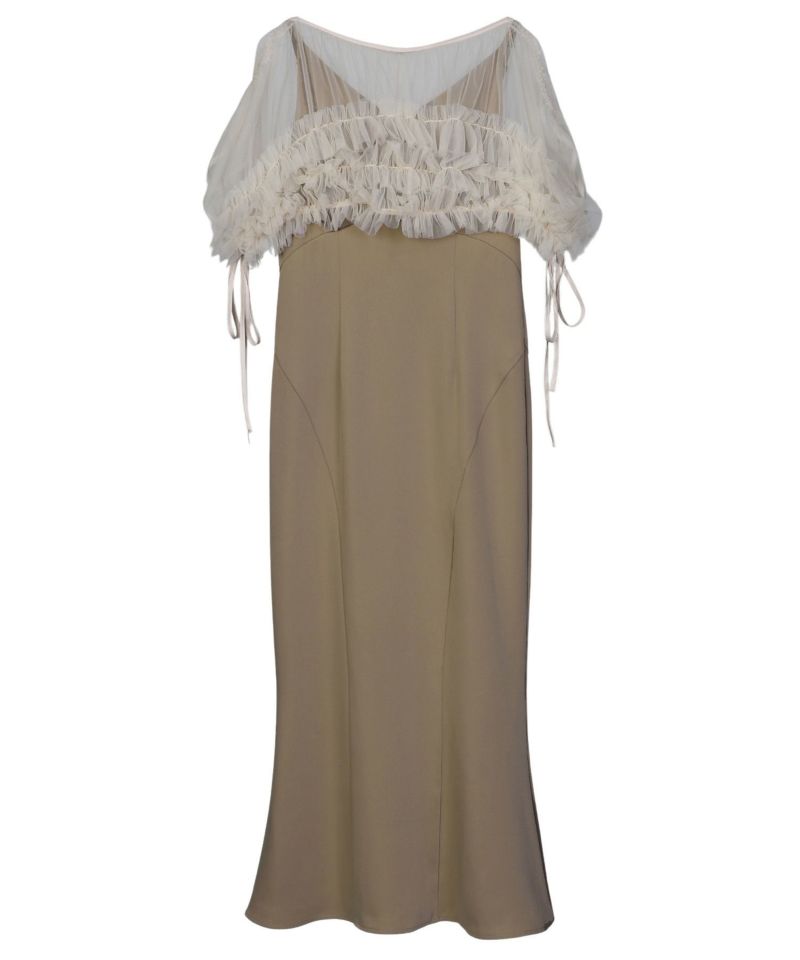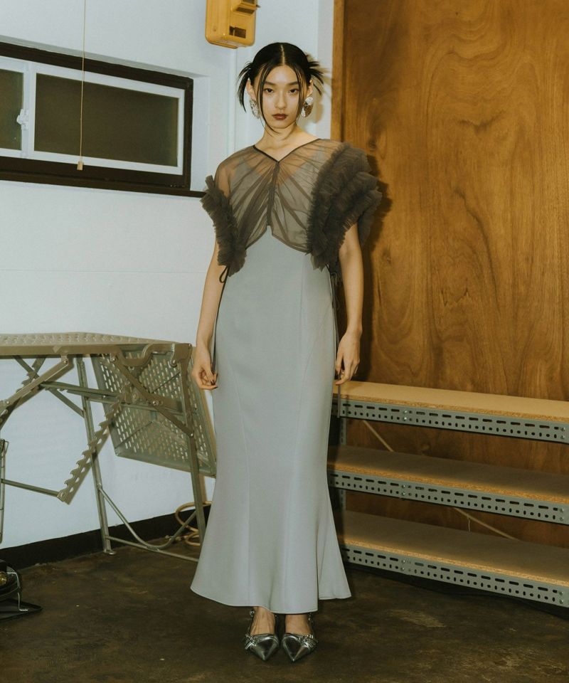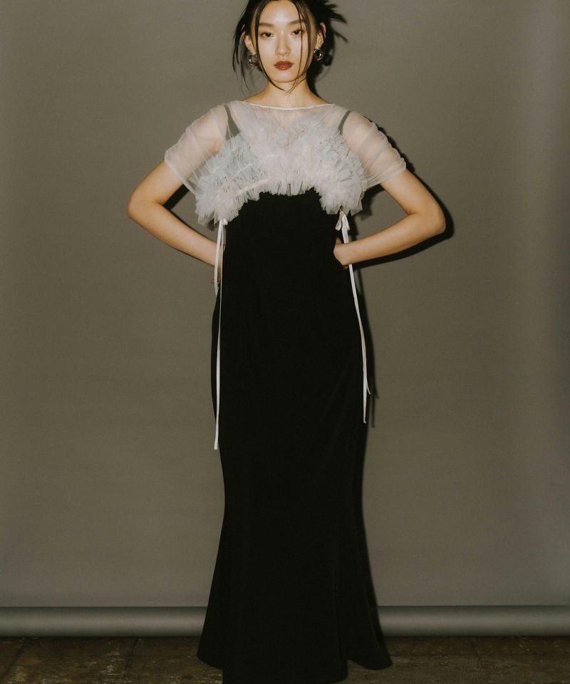細かい網目のナイロンチュールでふんわりソフトな質感のフリルを重ね、重さを感じさせない繊細な印象に。
