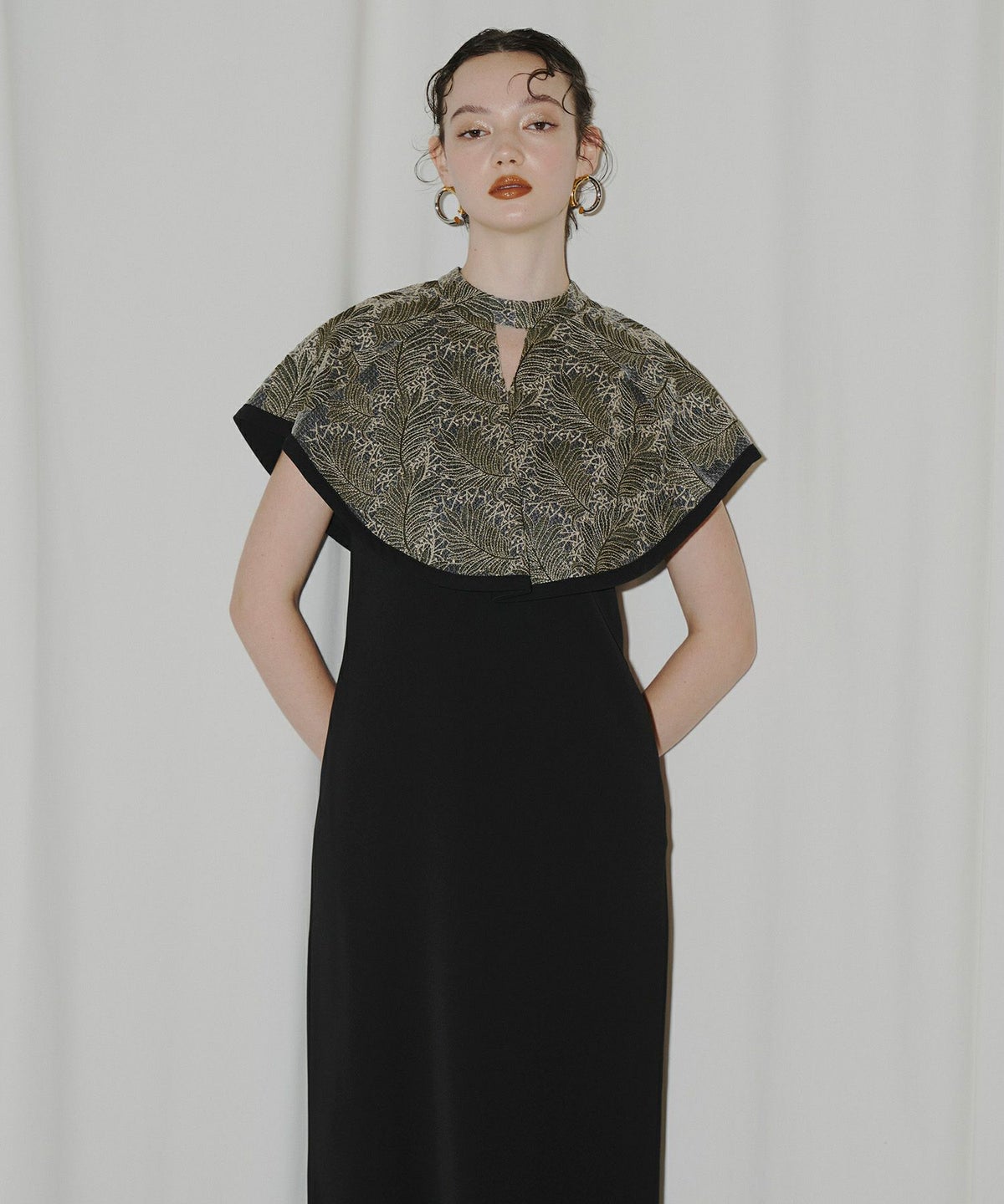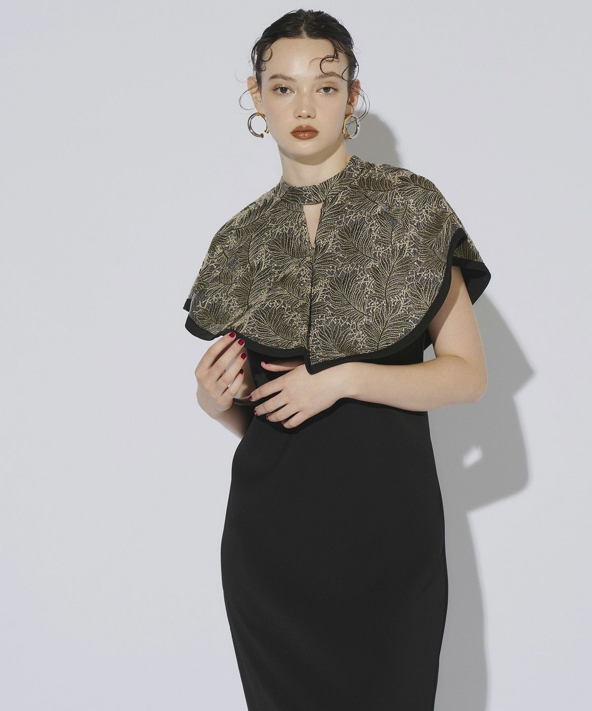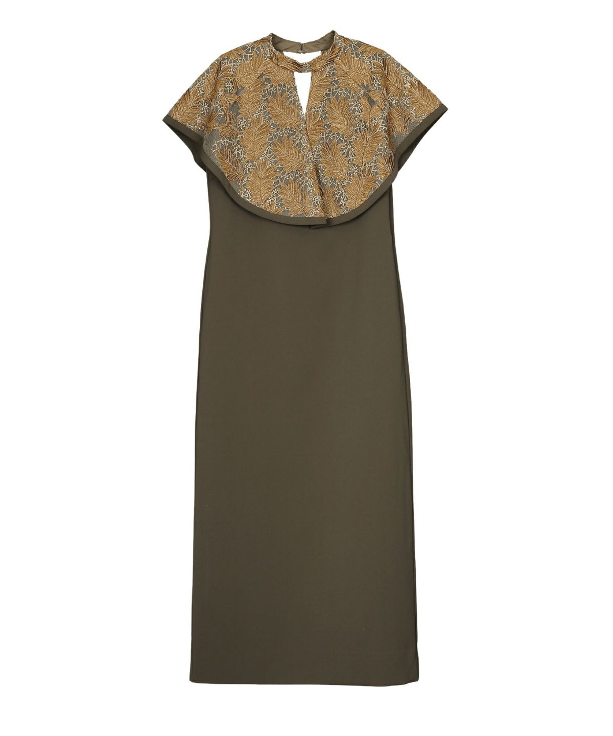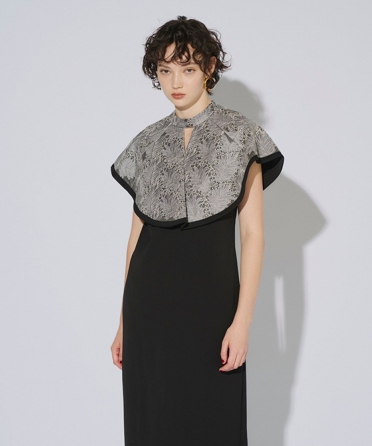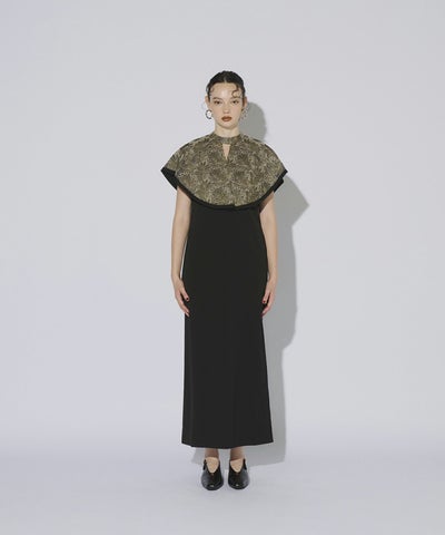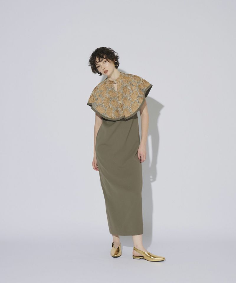 インパクトある刺繍のデザインが目を惹きつけるケープドレス。