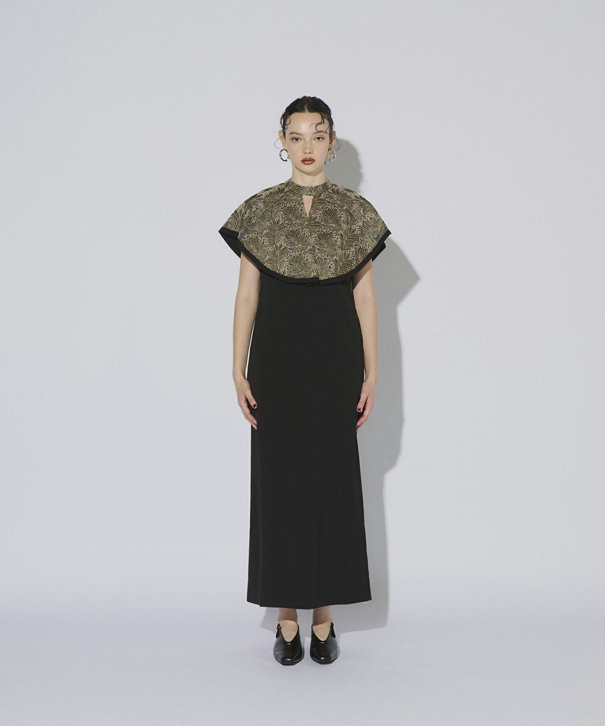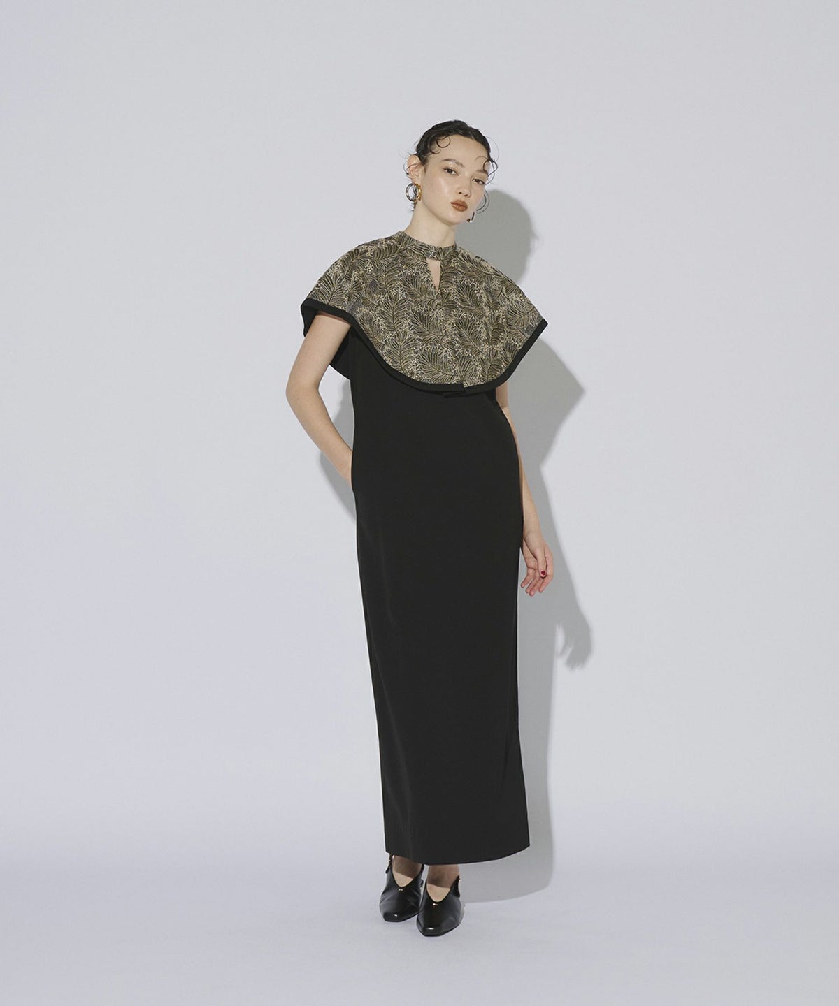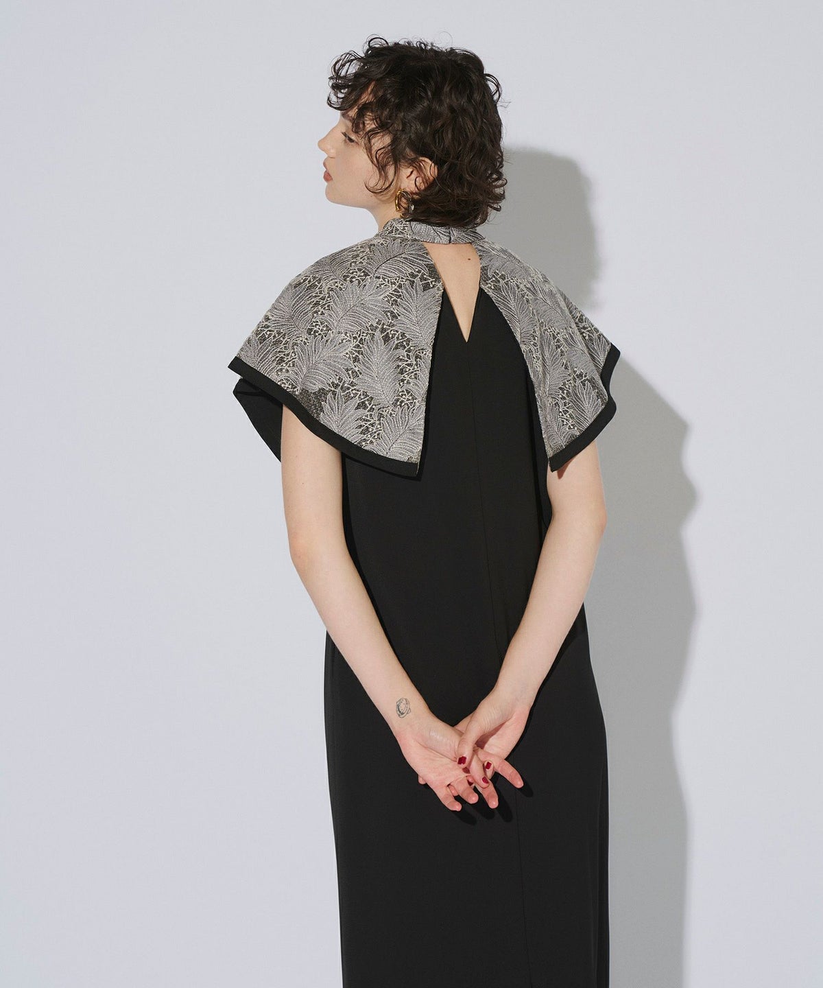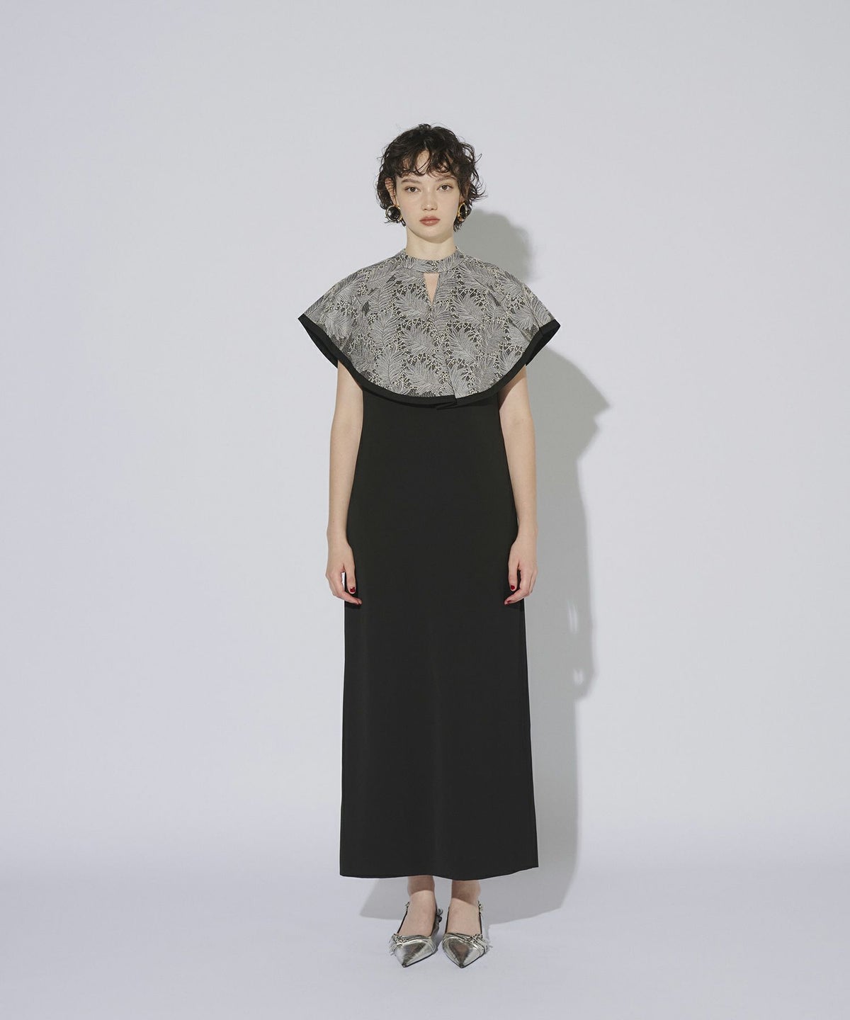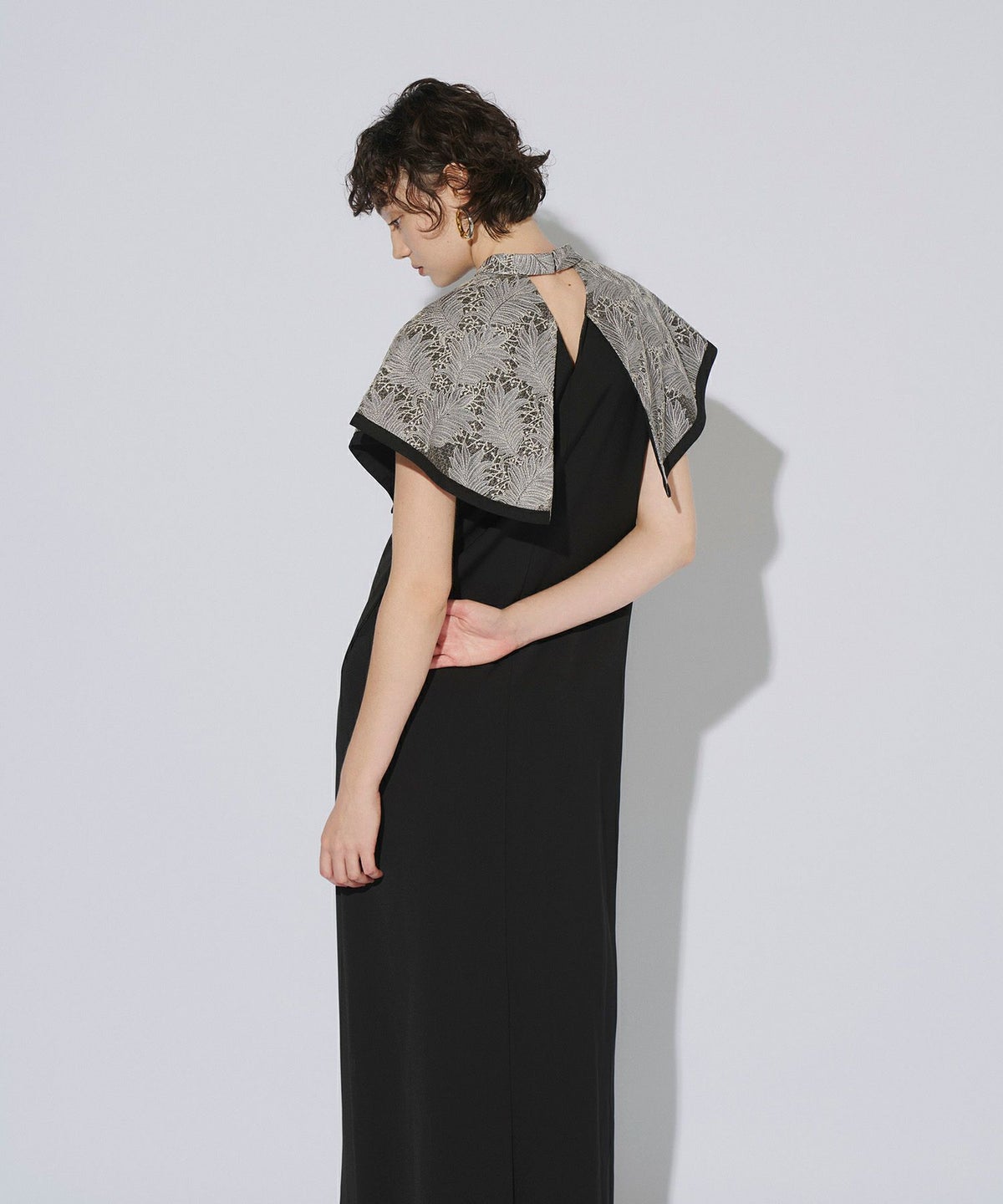 インパクトある刺繍のデザインが目を惹きつけるケープドレス。