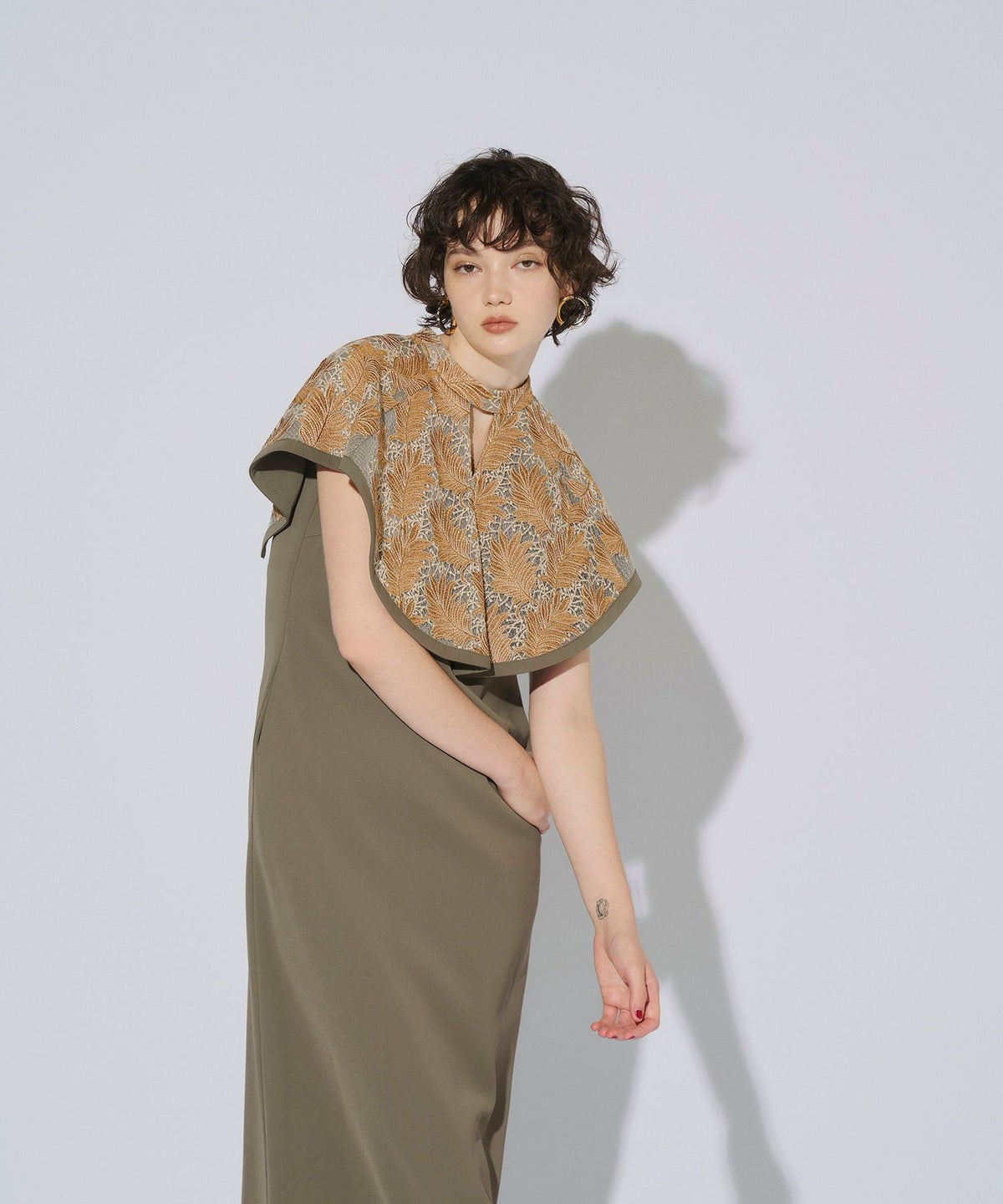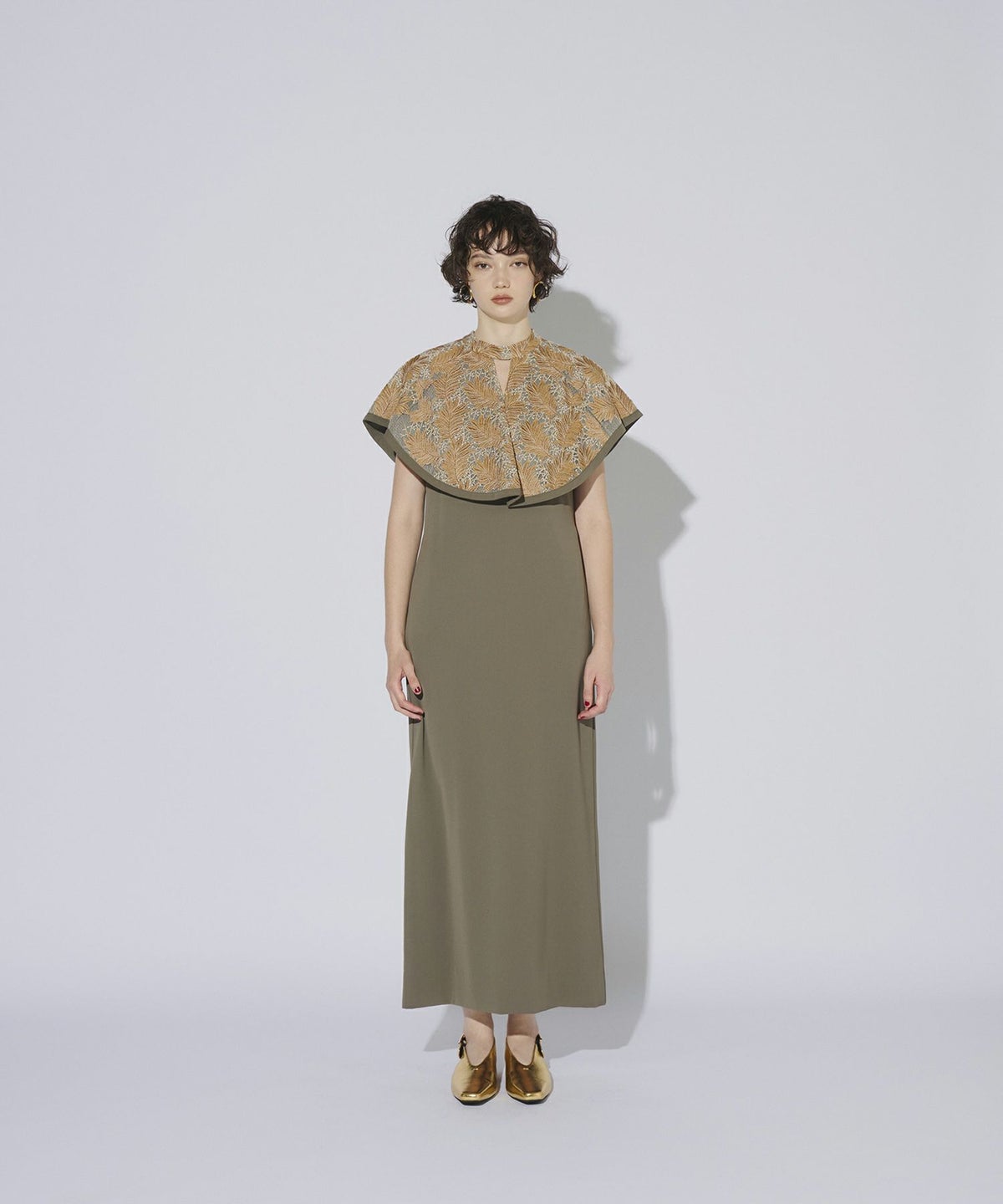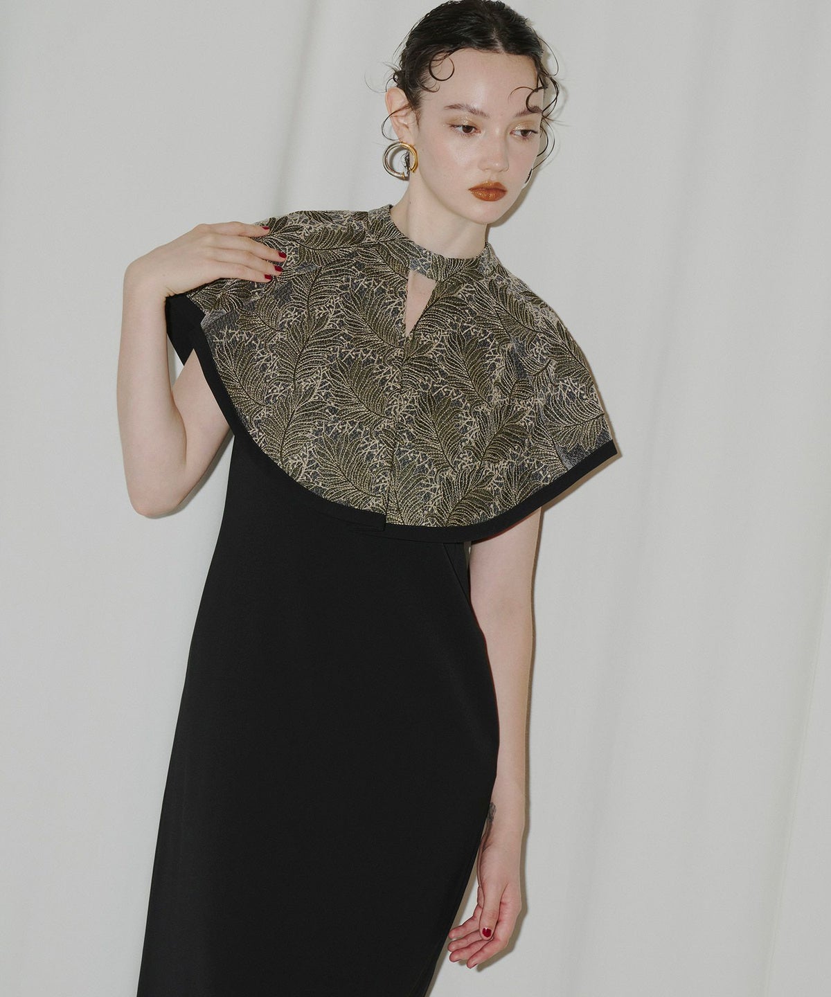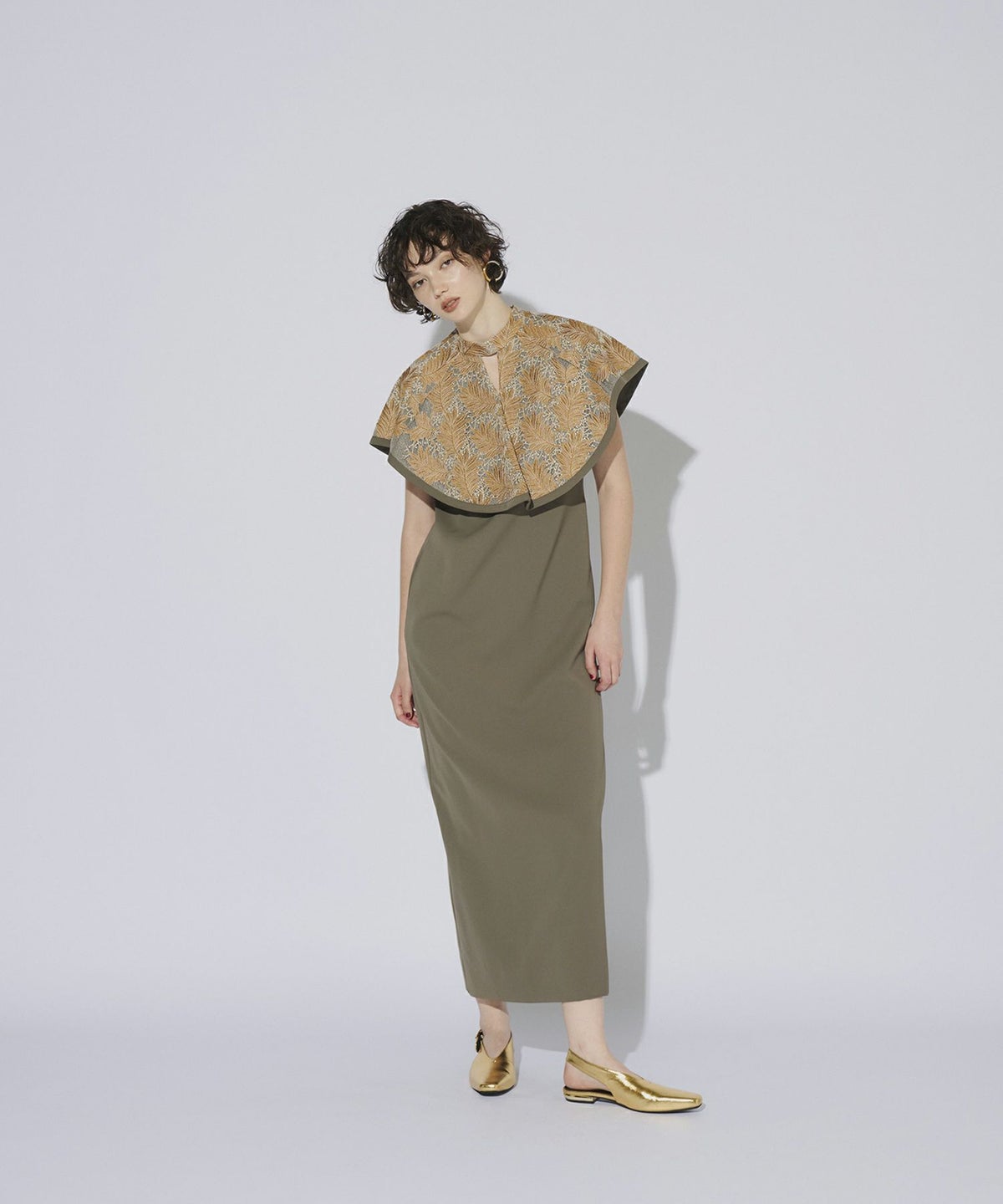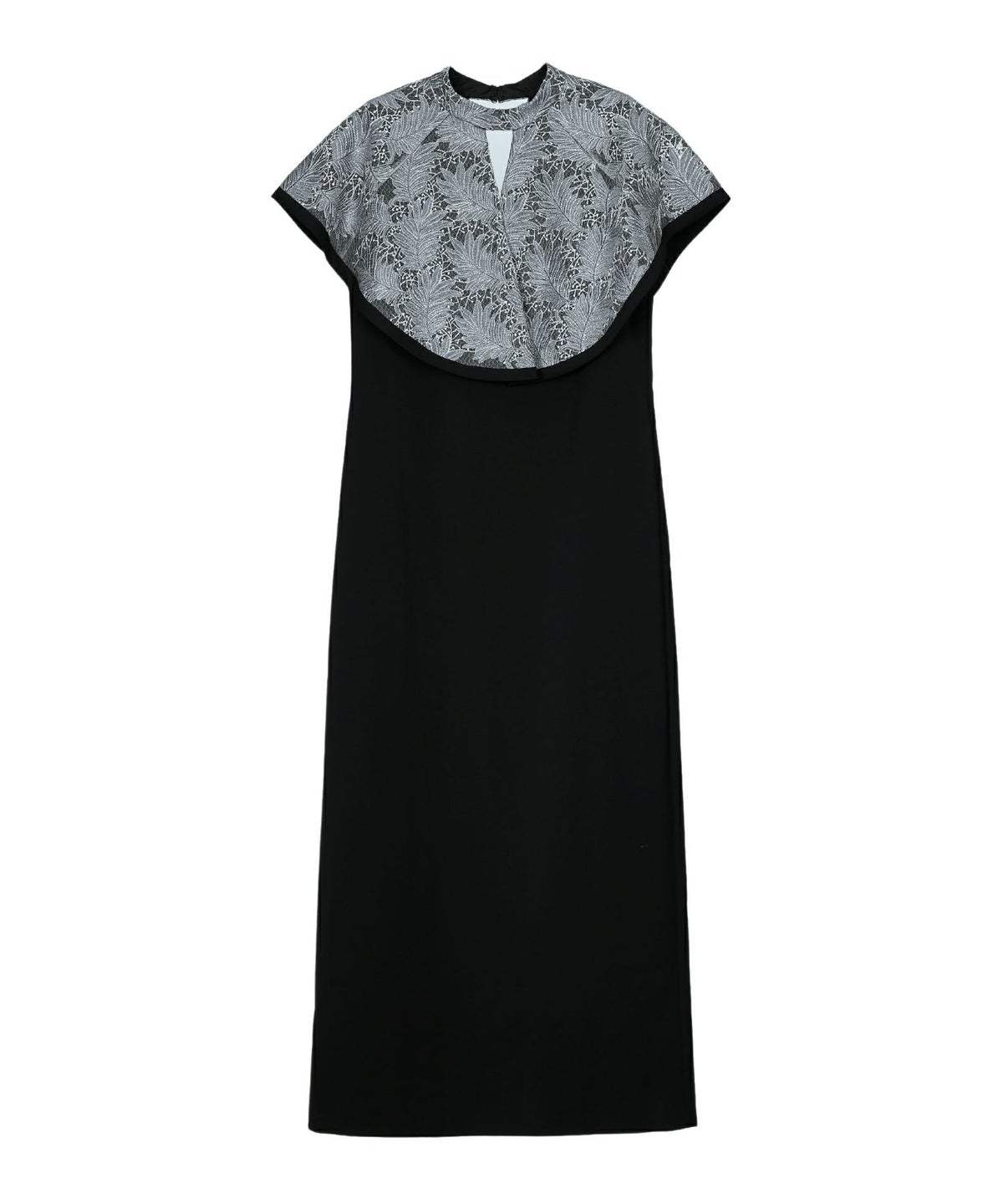 インパクトある刺繍のデザインが目を惹きつけるケープドレス。
