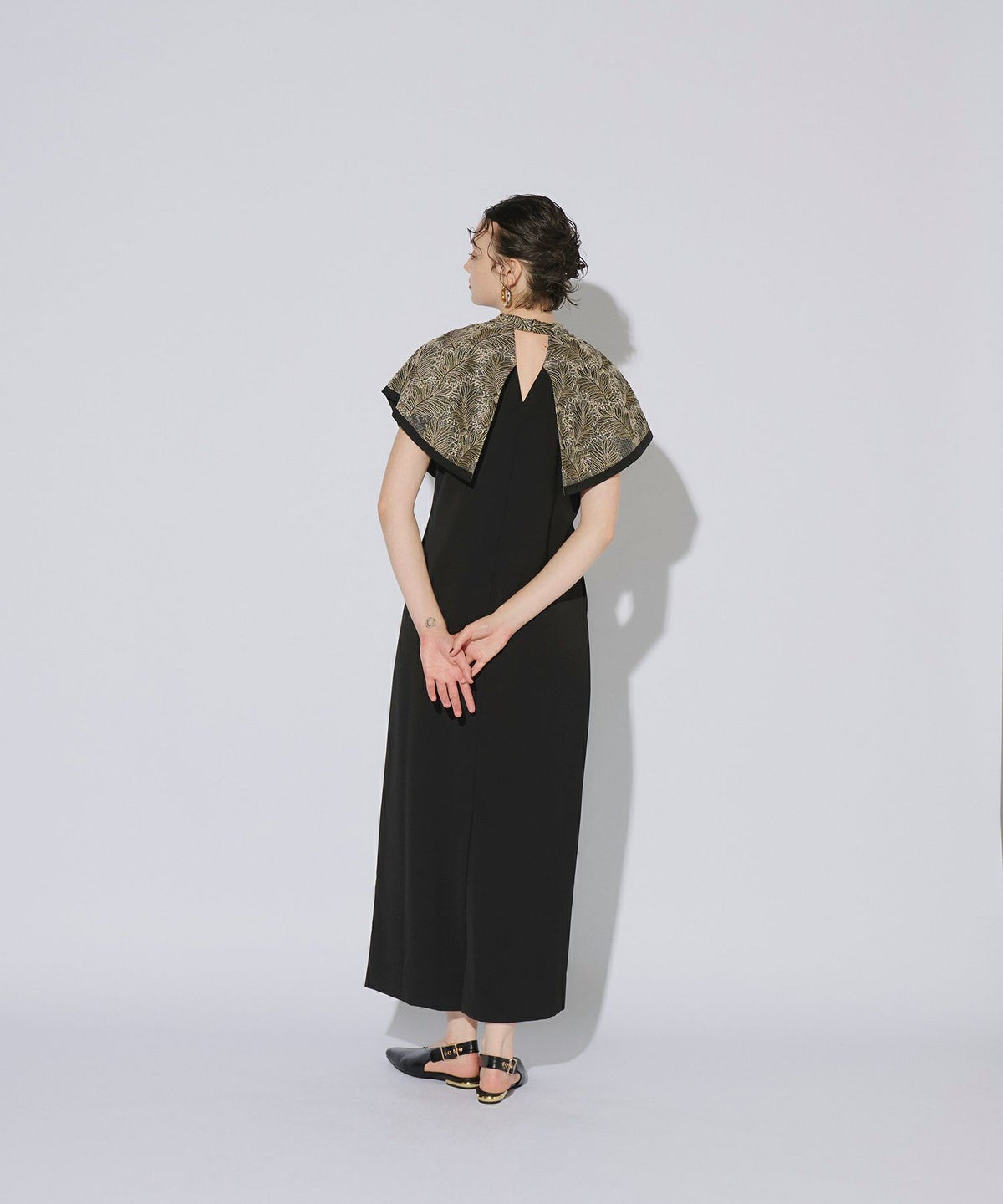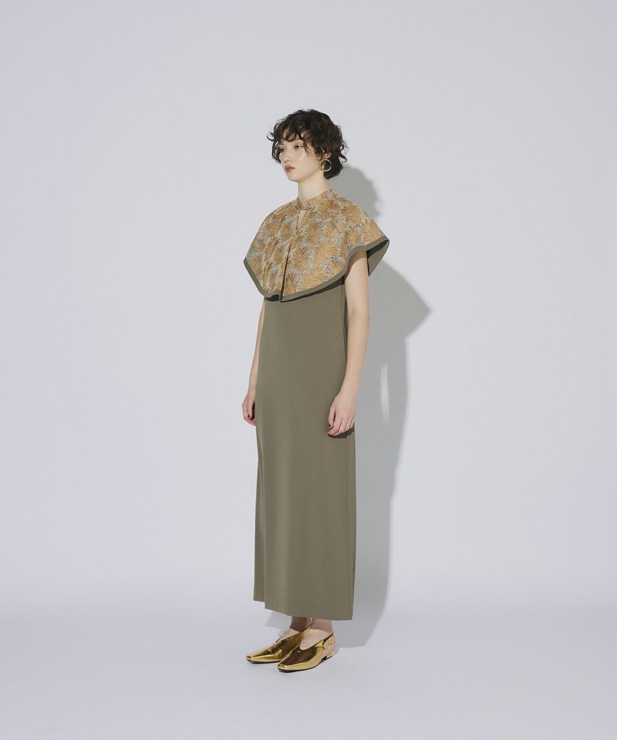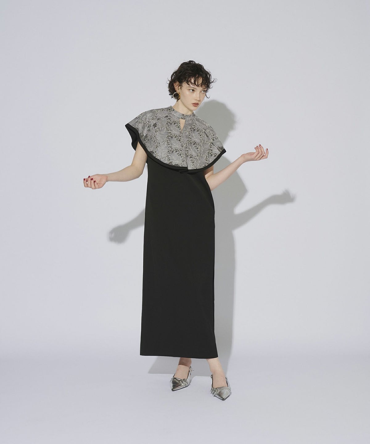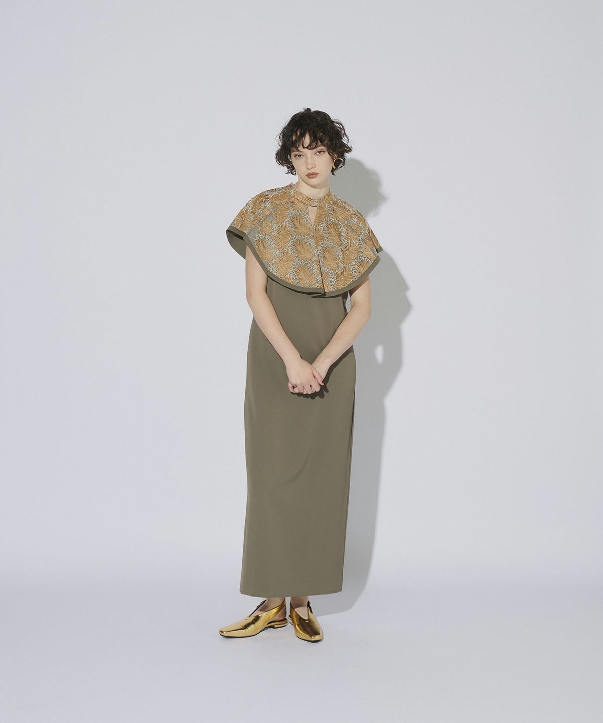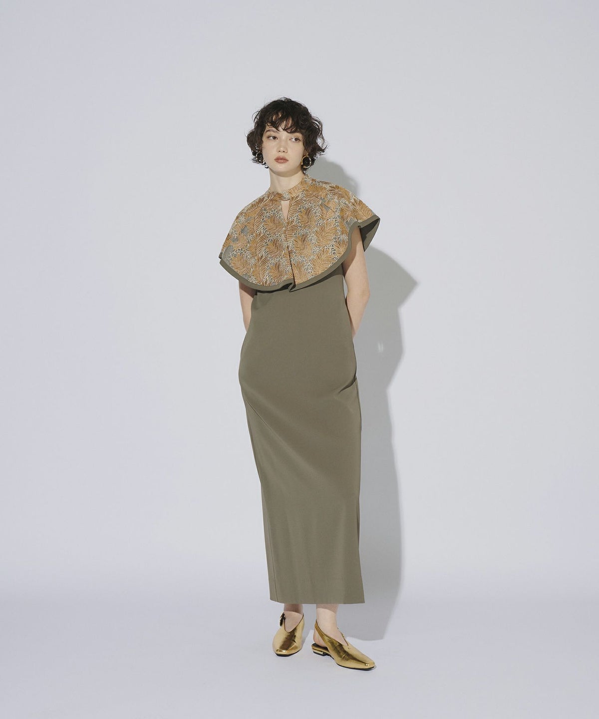 インパクトある刺繍のデザインが目を惹きつけるケープドレス。