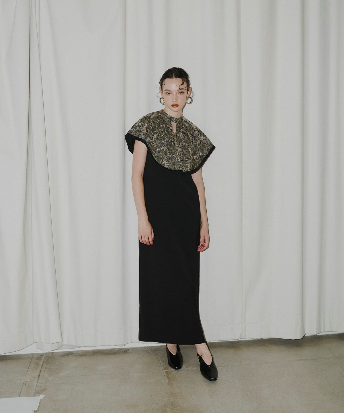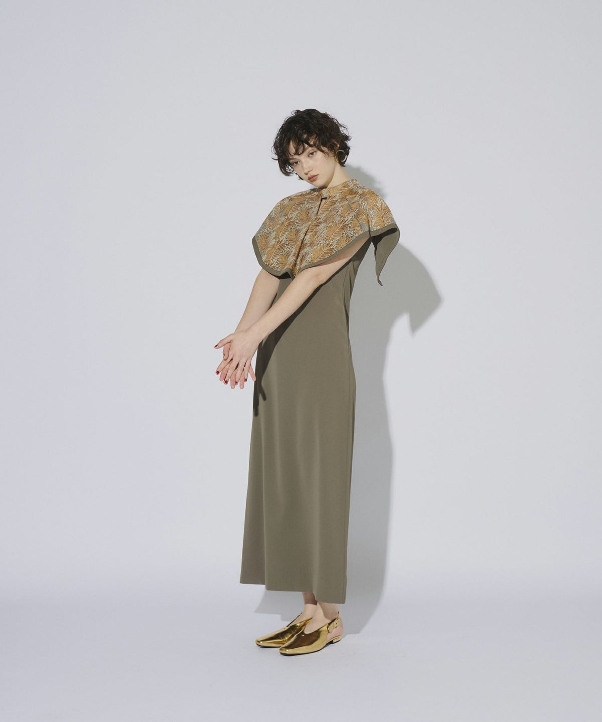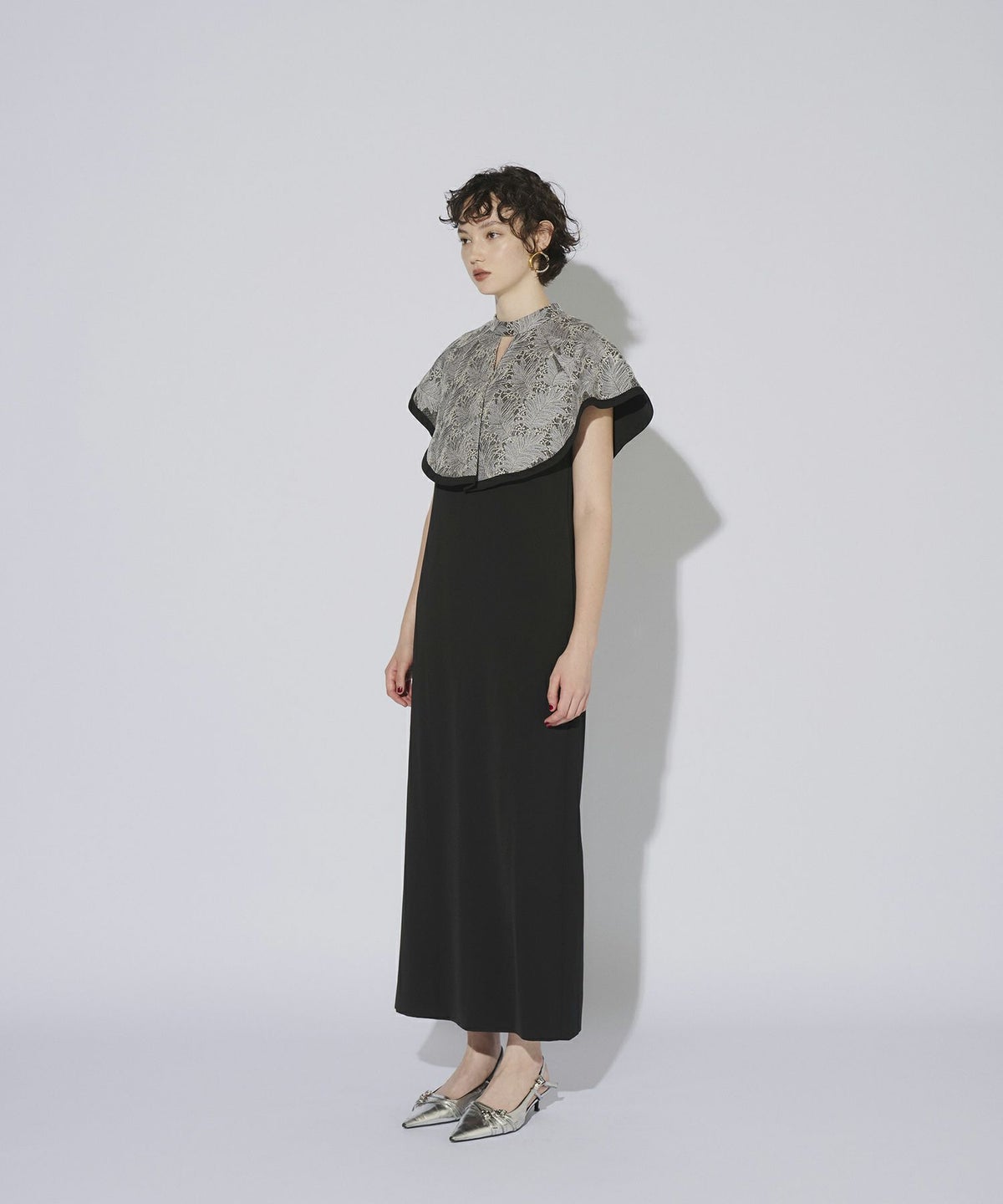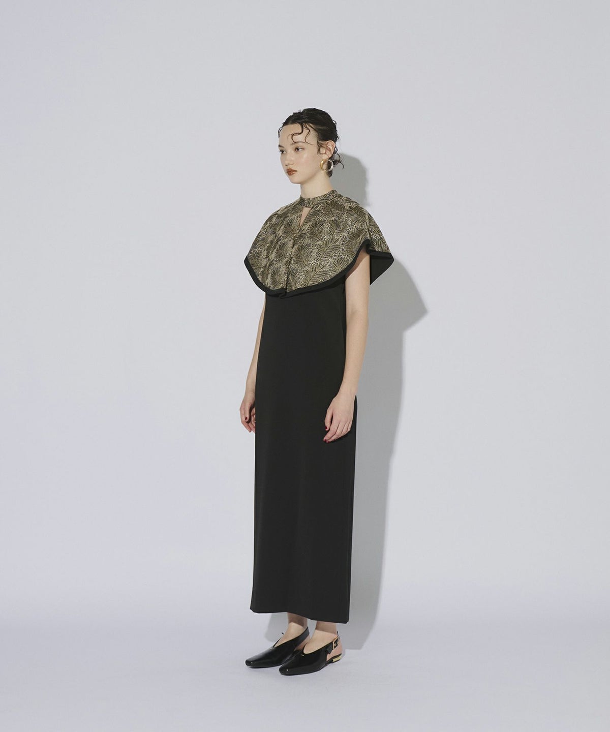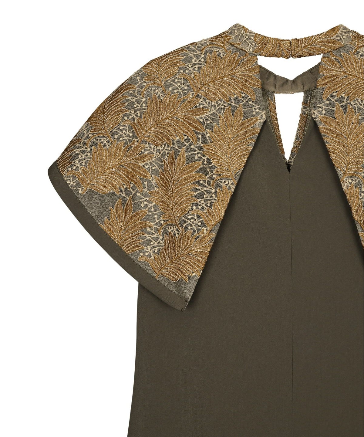 インパクトある刺繍のデザインが目を惹きつけるケープドレス。