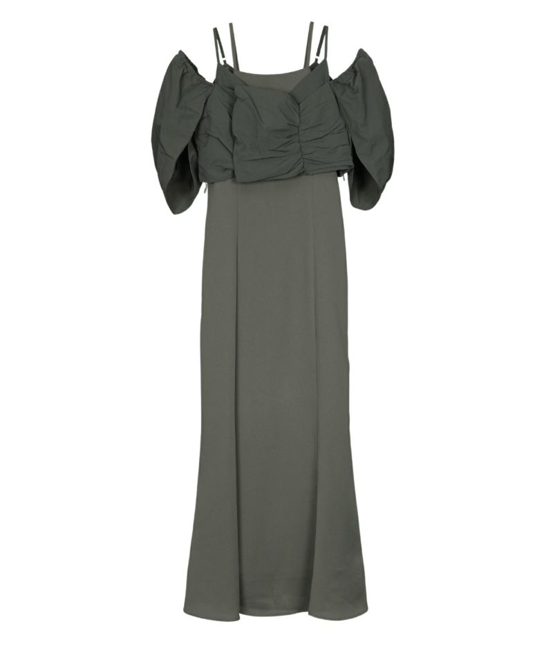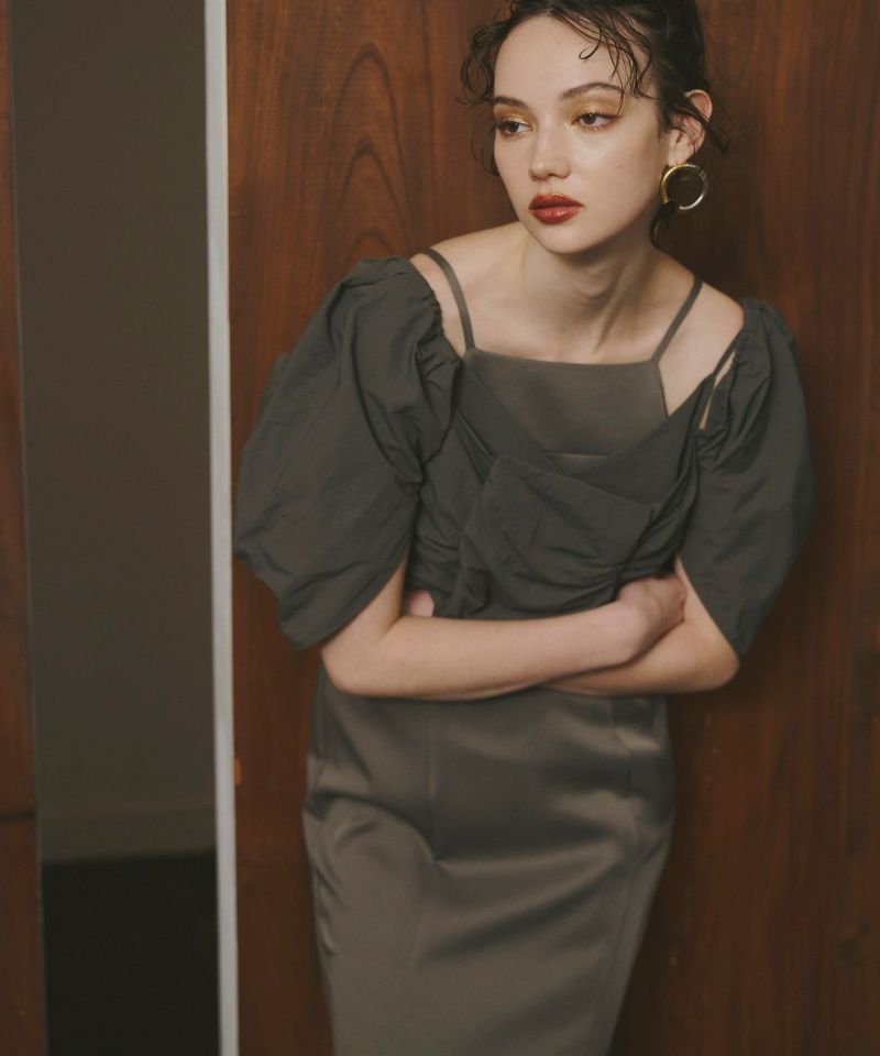 トップスとワンピースの相反するボリューム感と生地感のバランスが、
