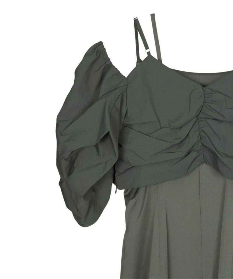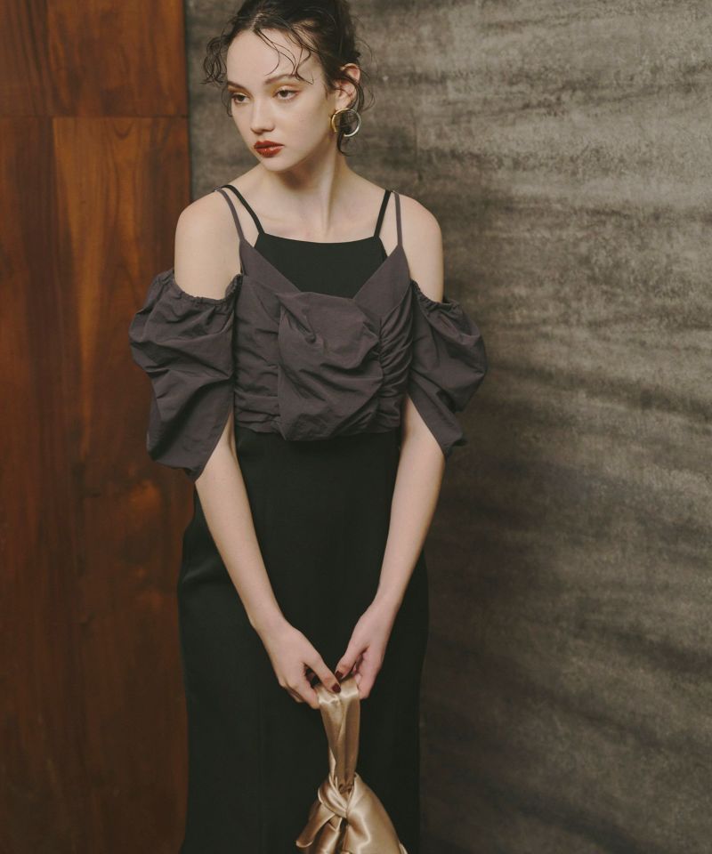 肩紐とトップスの肩部分にボタンをつけてパフスリーブにもオフショルにもできる2way仕様に。