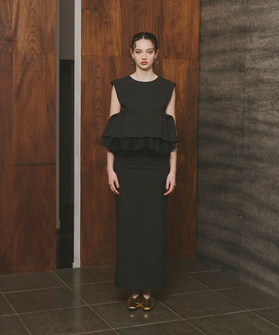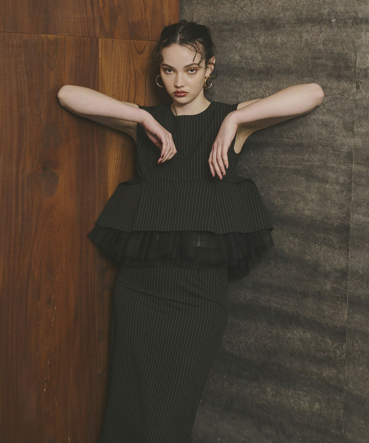 マニッシュな印象を引き立てるピンストライプ素材が魅力のペプラムセットアップ。