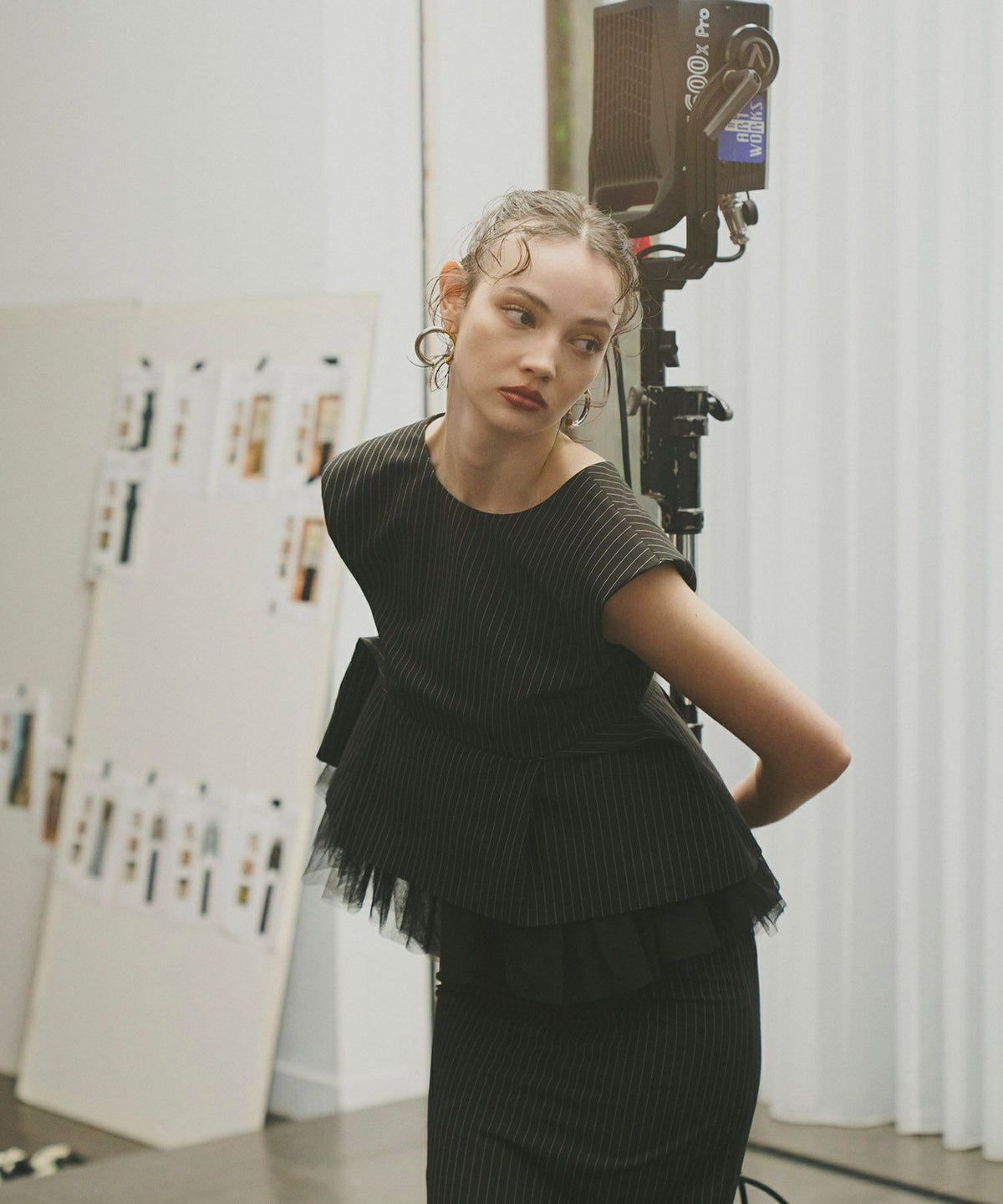 他にはないペプラムセットアップを目指して、斜めに入れたタックやボリュームチュール、肩パッドのような仕様のデザインなど。