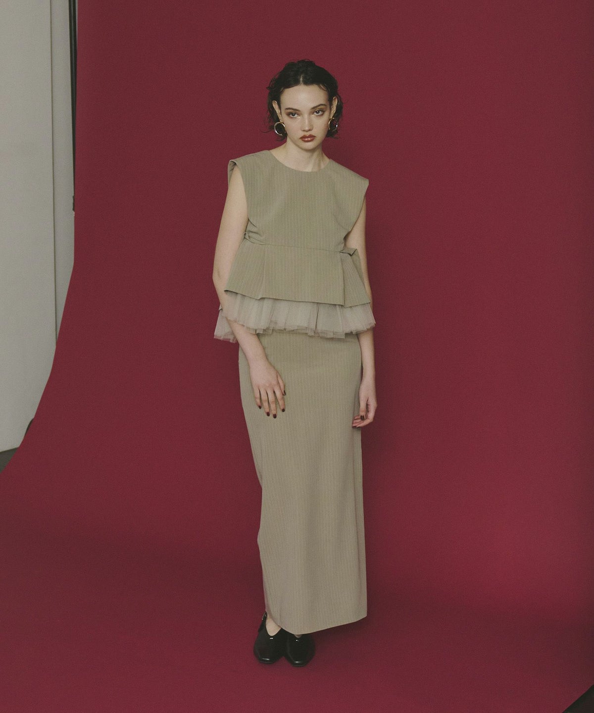 トップスのシルエットがきれいに見えるように、スカートはストレートラインに。