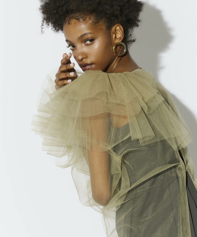 適度なハリ感のあるチュールが、空気を含むようにふんわりと広がり、ボリュームを出しながらも軽やかな印象を演出します。