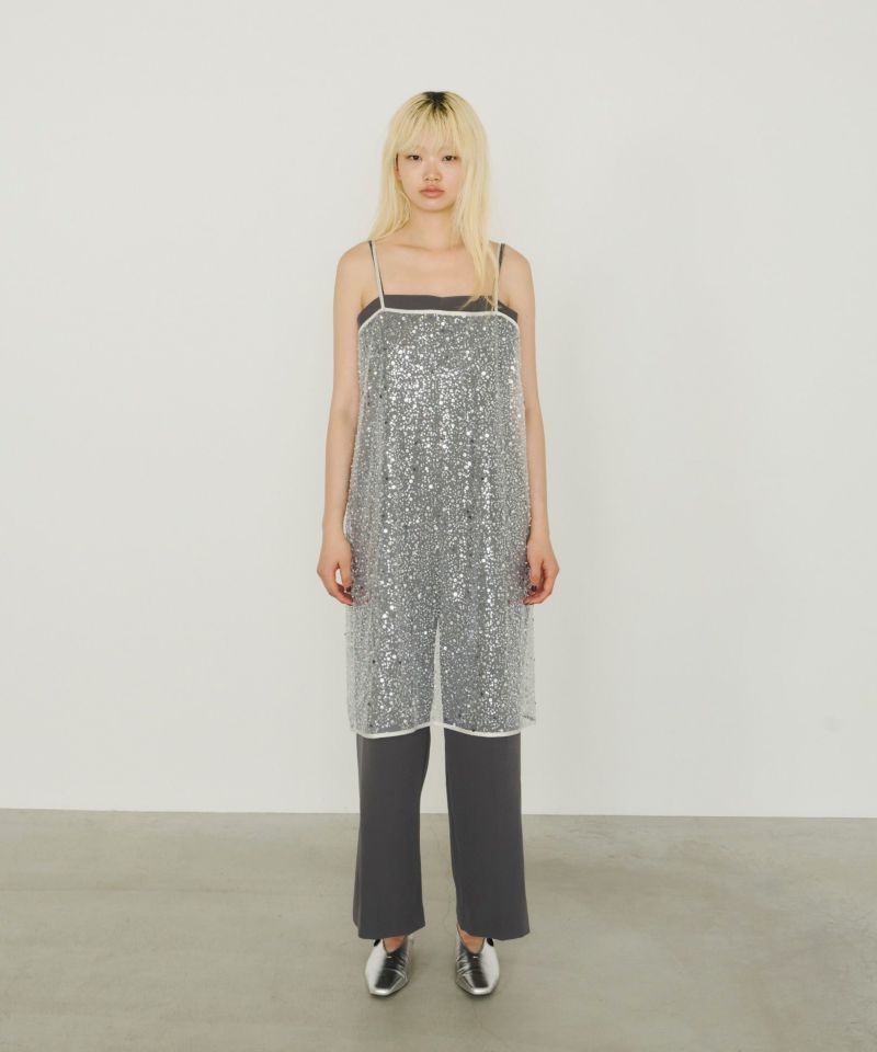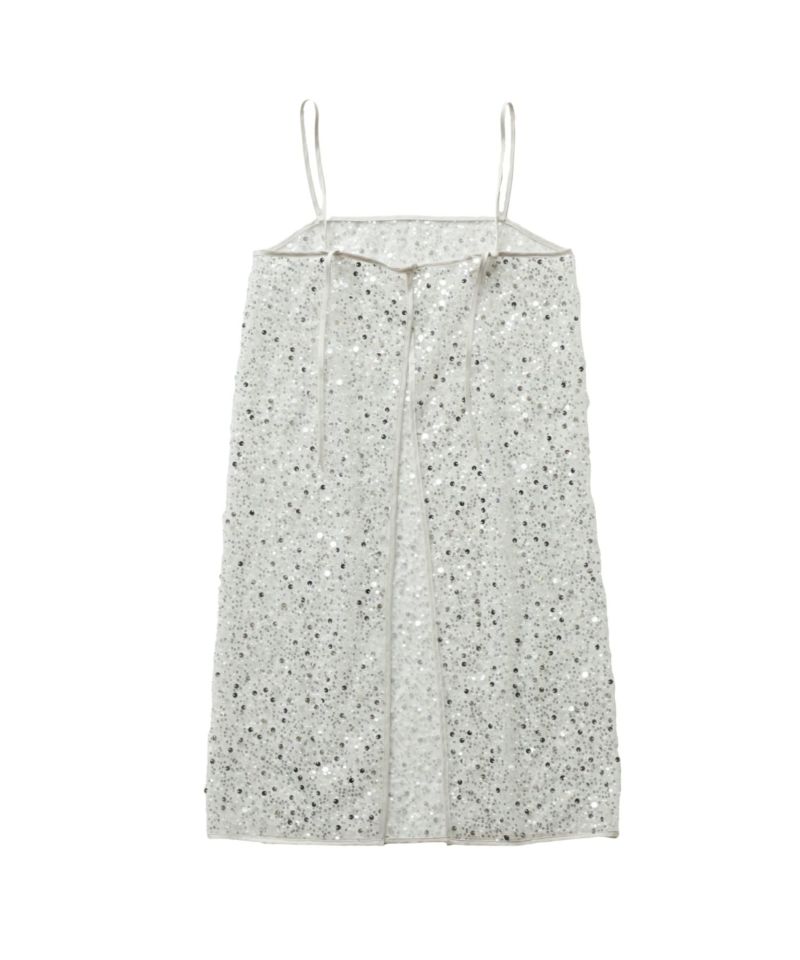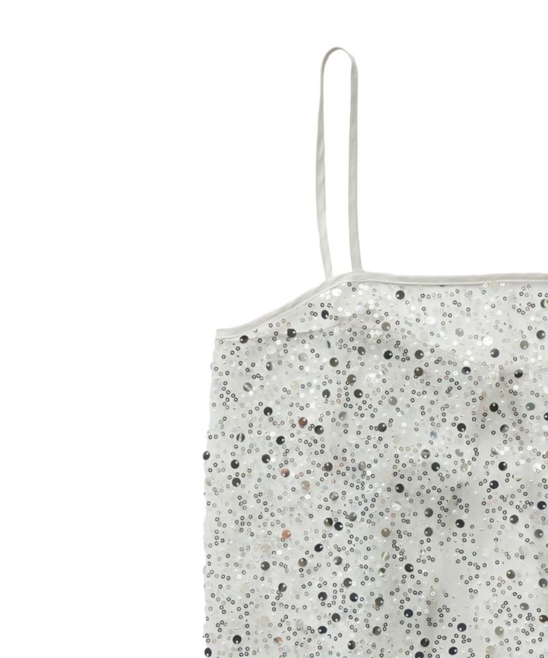 メタリックのスパンコールとパールビーズをランダムに刺繍した、繊細なチュール素材を使用したキャミドレス。