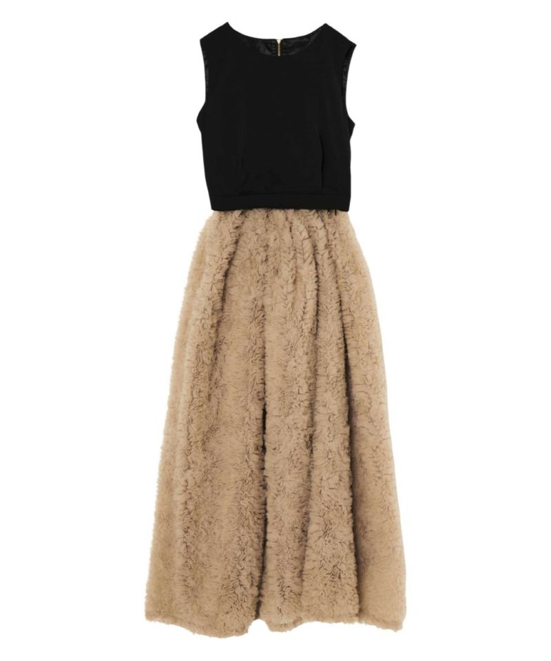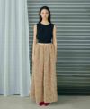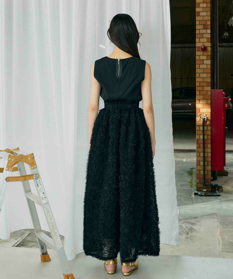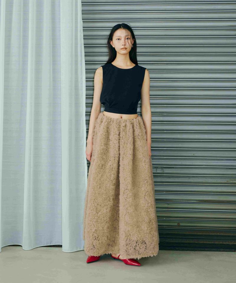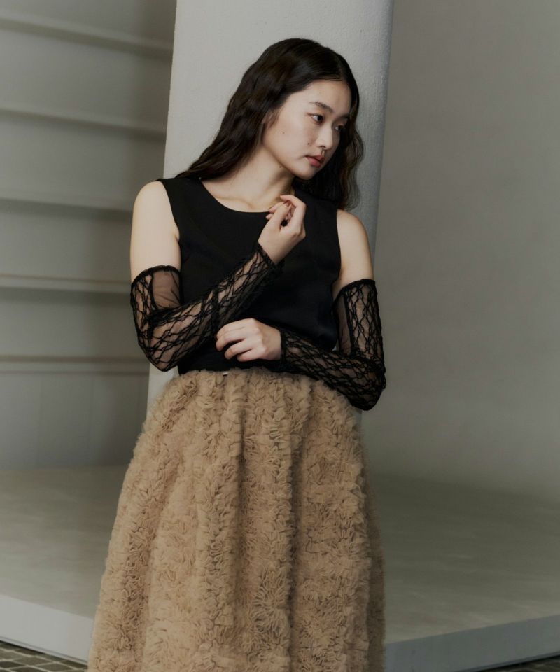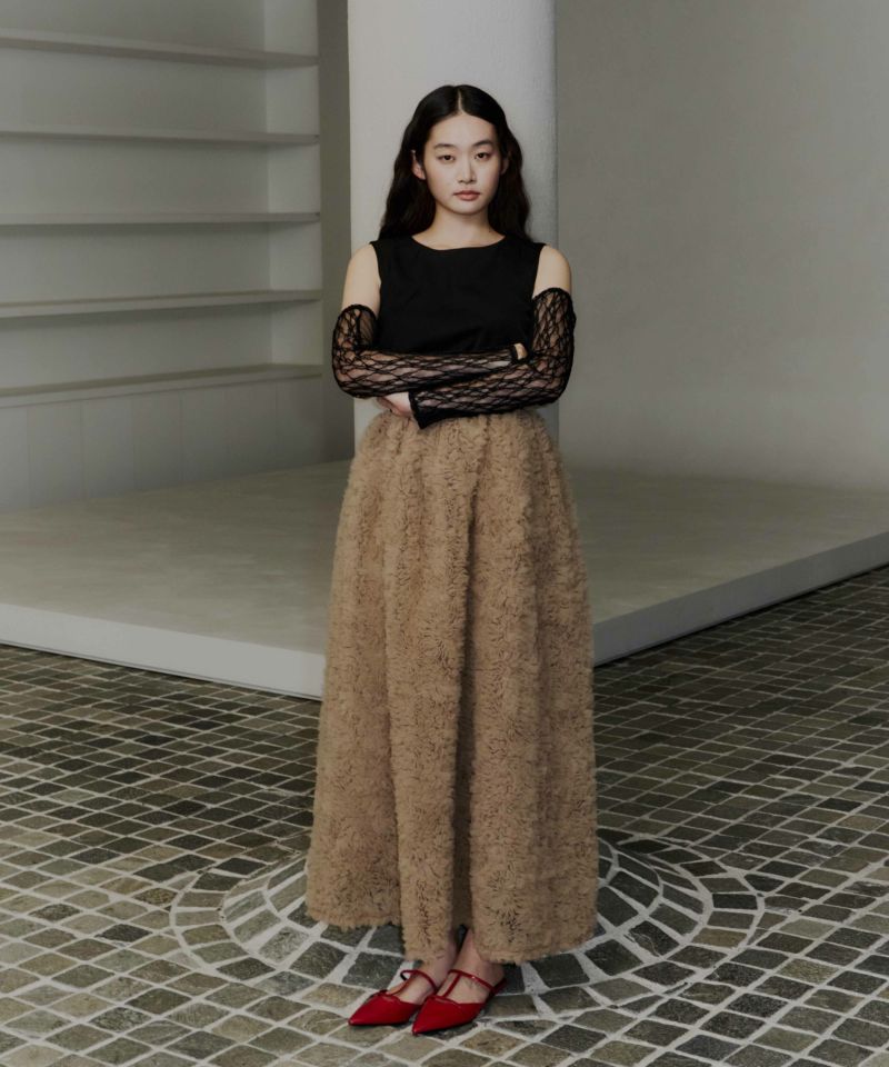 スカートがひき立つよう、トップスはセミマット・少し落ち感のある素材でバランス設計。
