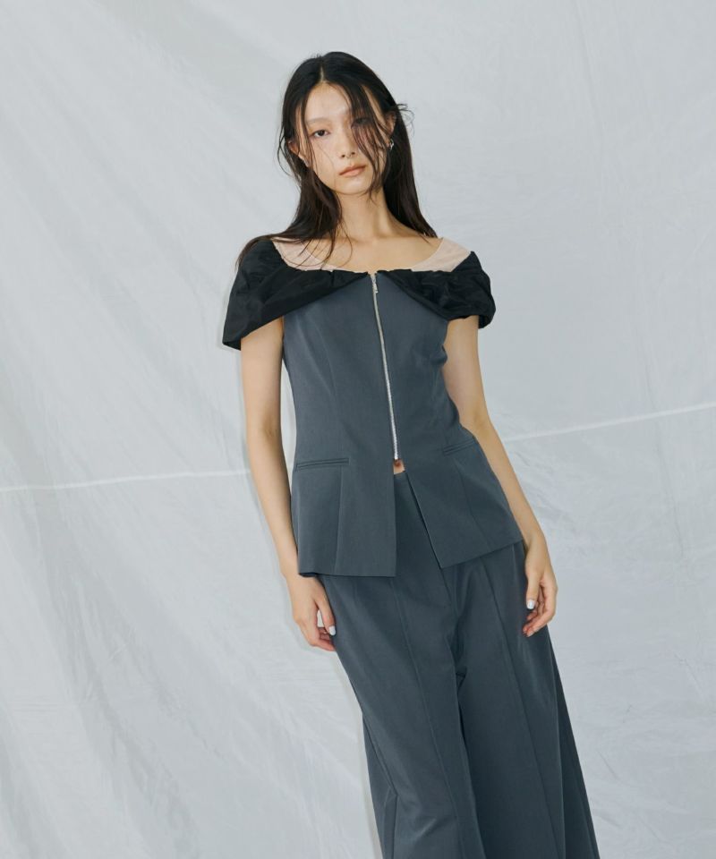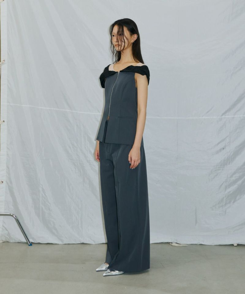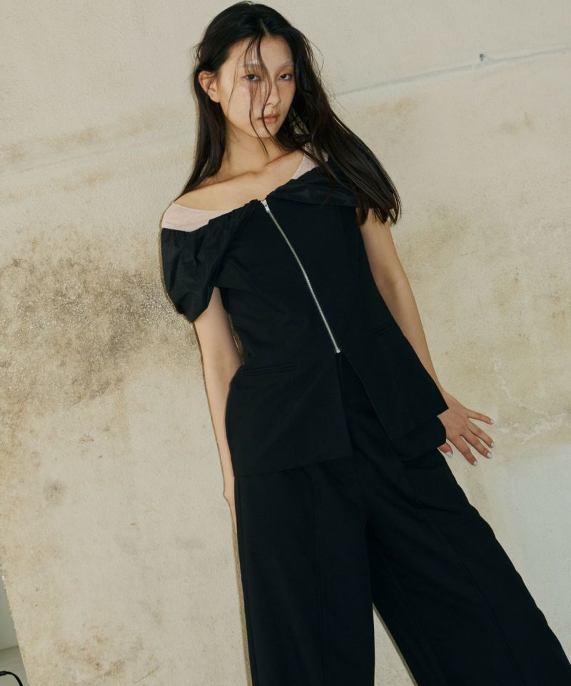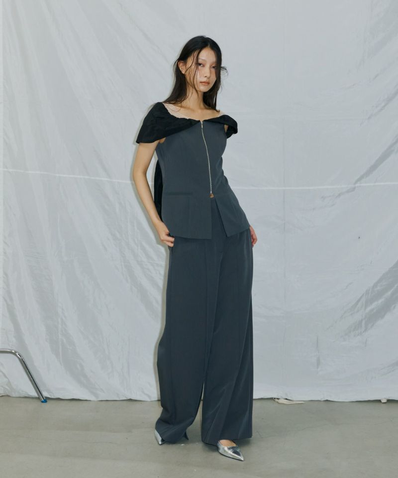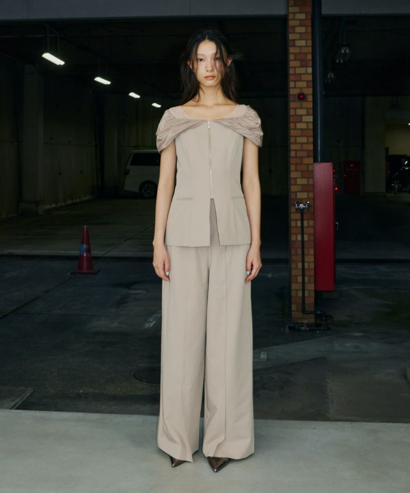 パンツはハイウエスト×ワイドシルエットで構築的に仕上げ、深めのセンタータックが縦のラインを強調。