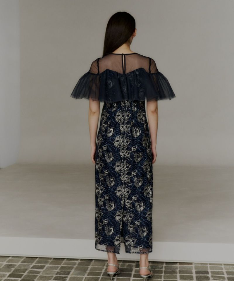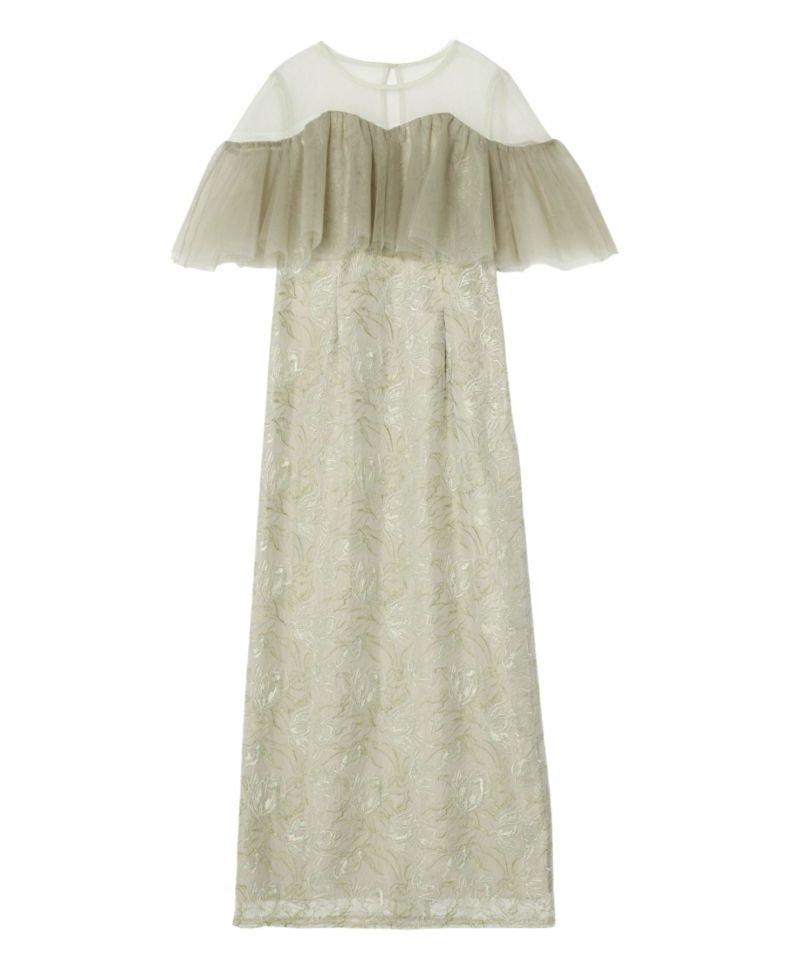 トップにあしらったフリルはハリのあるチュールでボリュームを引き立てオフショル見えのデザインに。