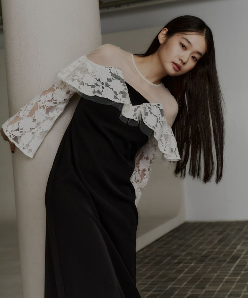 バストからスリーブへと流れるレースのラッフルが印象的な一着。