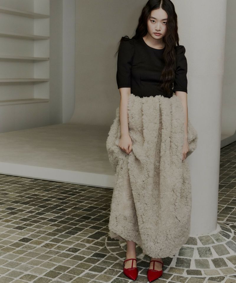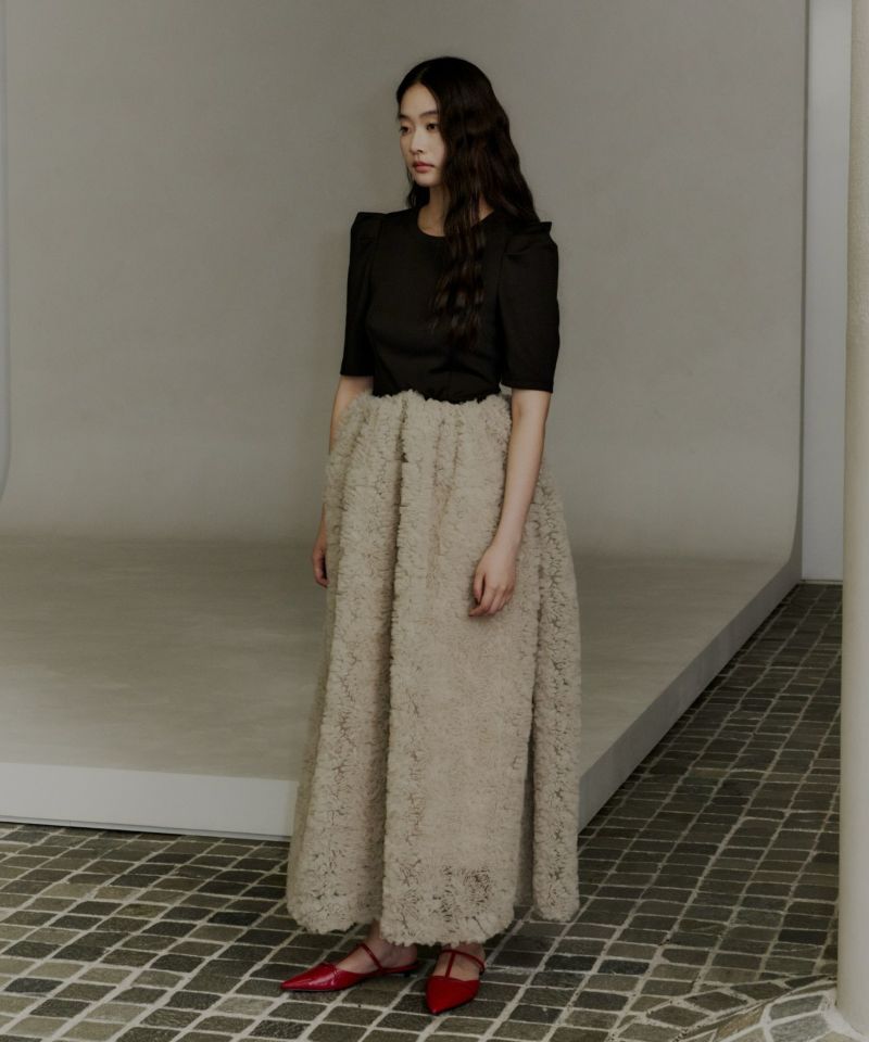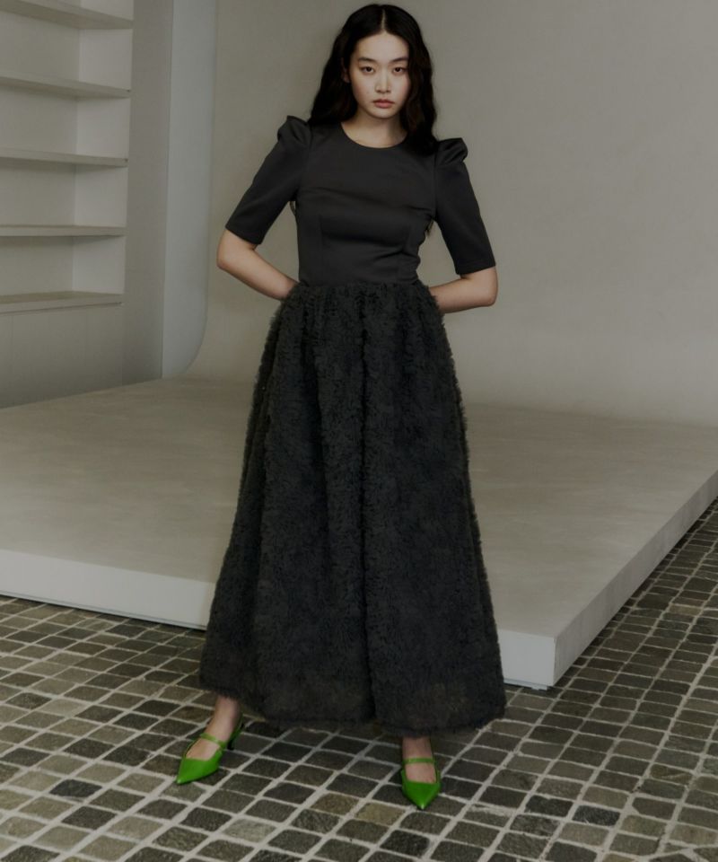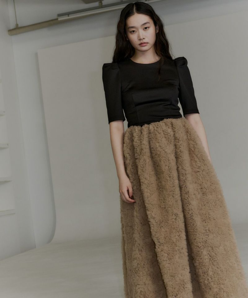 たっぷりのチュールを使ったふんわりフラワーチュール刺繍のもこもこスカートに、