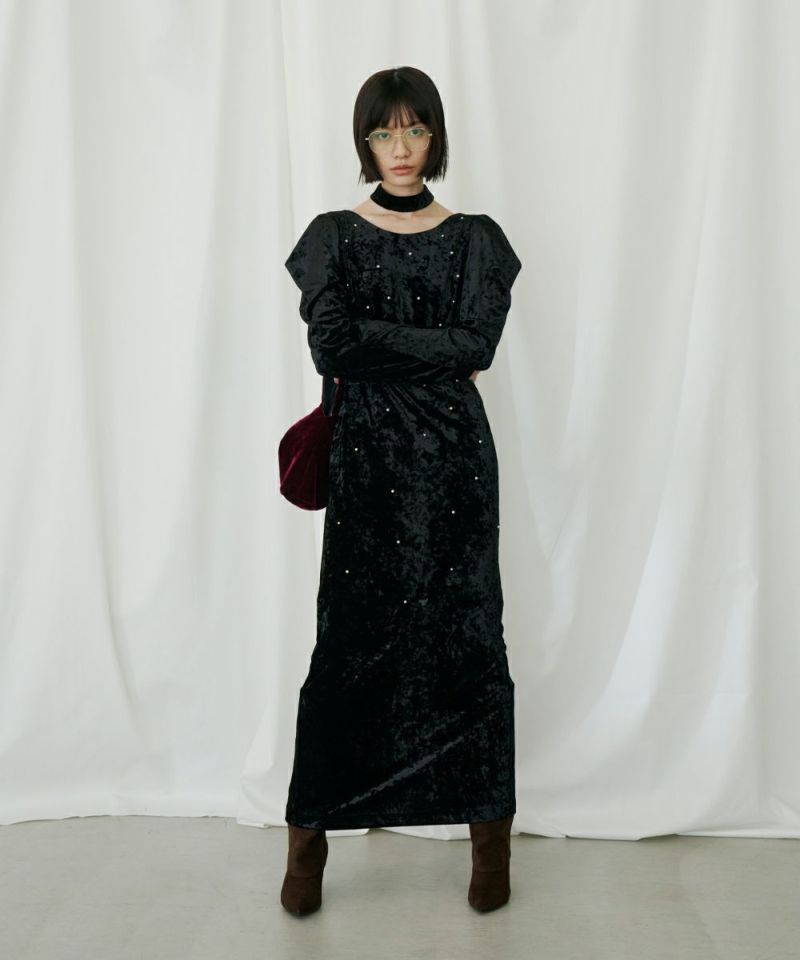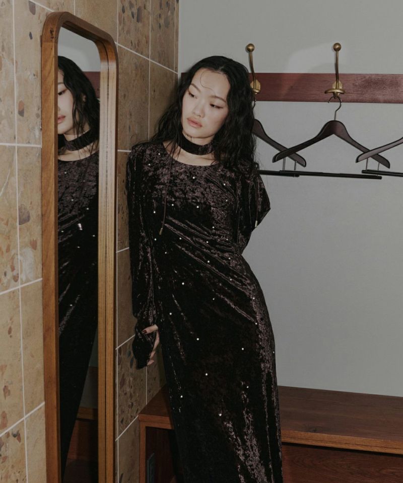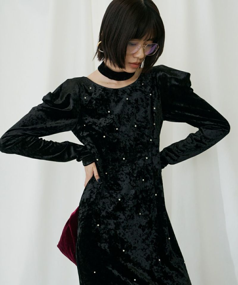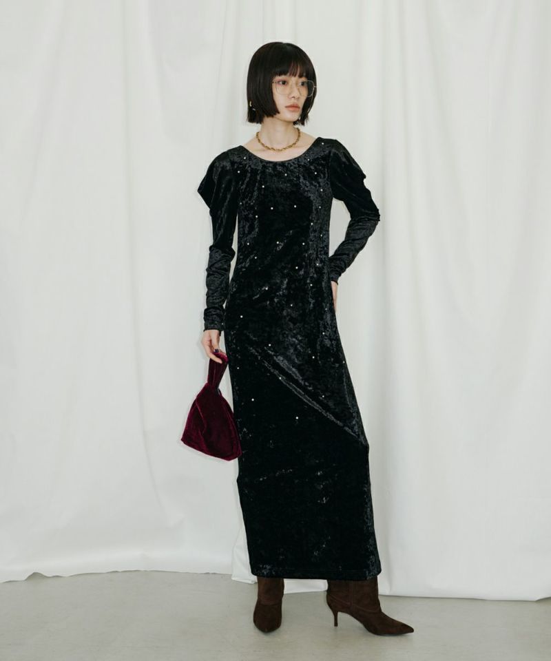 ベロア独特の柔らかいドレープが女っぽさを残してくれる絶妙なバランスのワンピース。