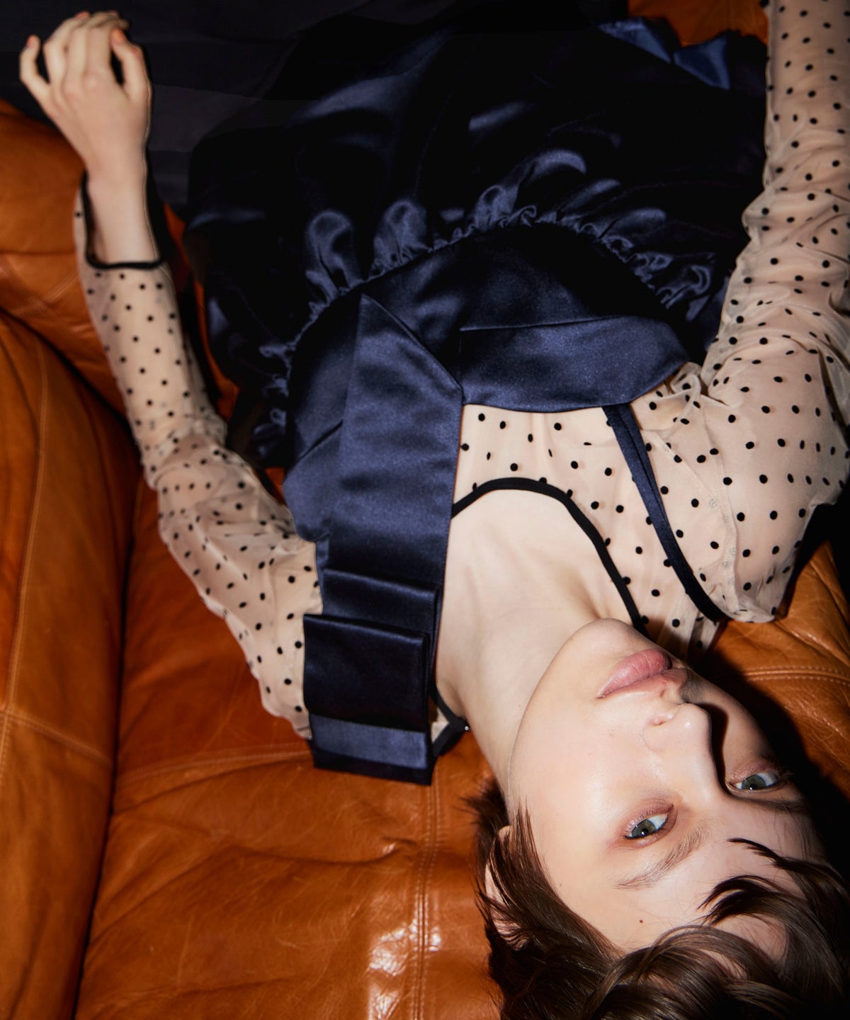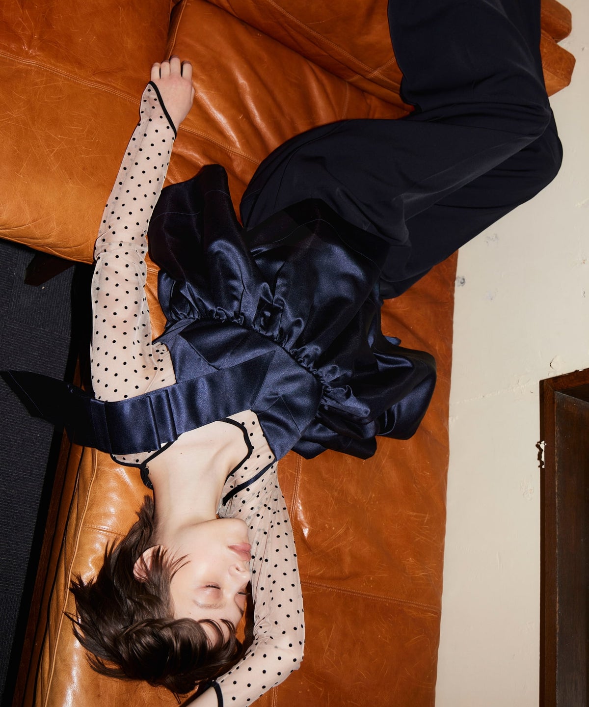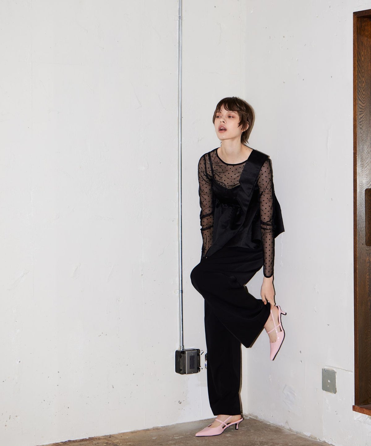 オケージョンシーンには、dot sheer tops(品番:50280) をインナーに合わせて、肌見せを抑えたスタイリングがおすすめ。