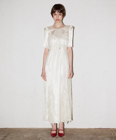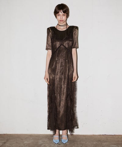 無駄を削ぎ落としたミニマルなシルエットに、繊細なスパンコール刺繍の光を重ねたレイヤードドレス。