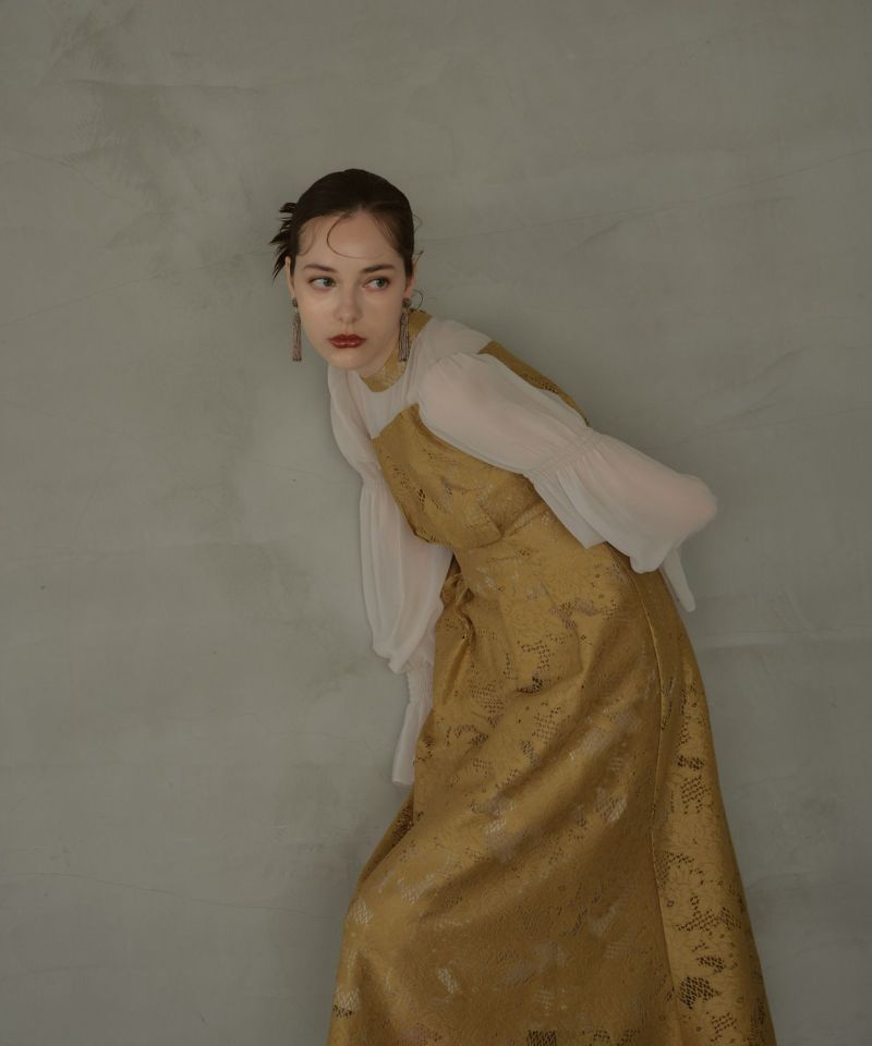 デコルテ部分にはアシンメトリーなデザインが施され、独特の魅力を放ちます。