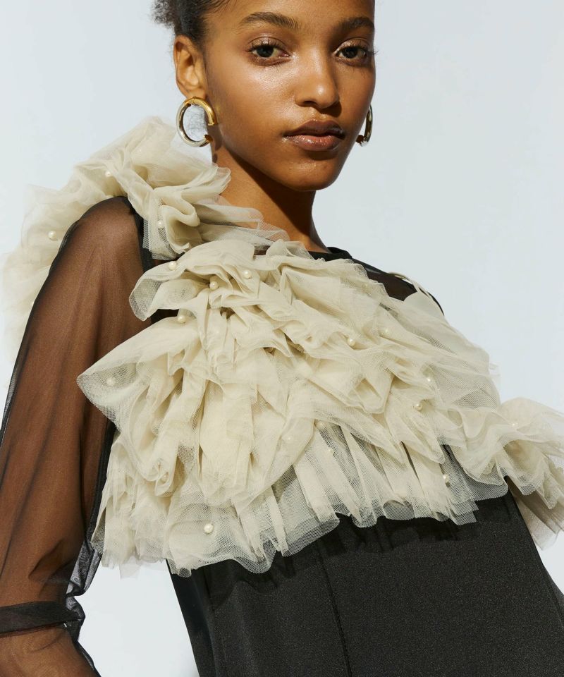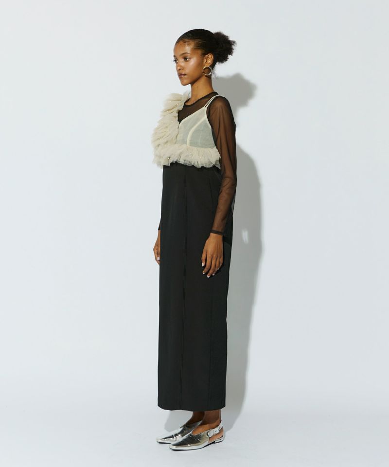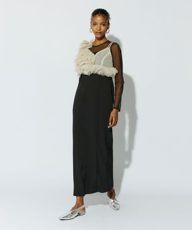 ビスチェにはランダムに散りばめたパールが目を惹くチュール生地を採用。