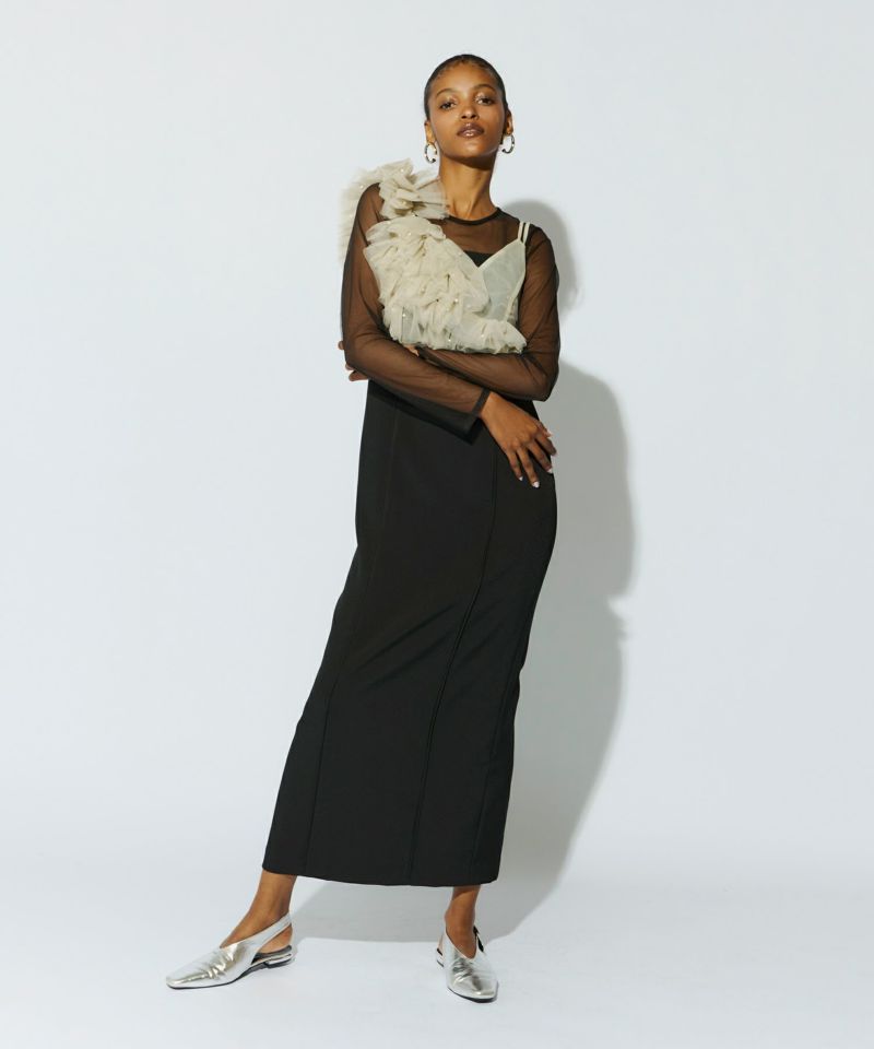 ワンピースはタイトなシルエットですっきりとした印象に。