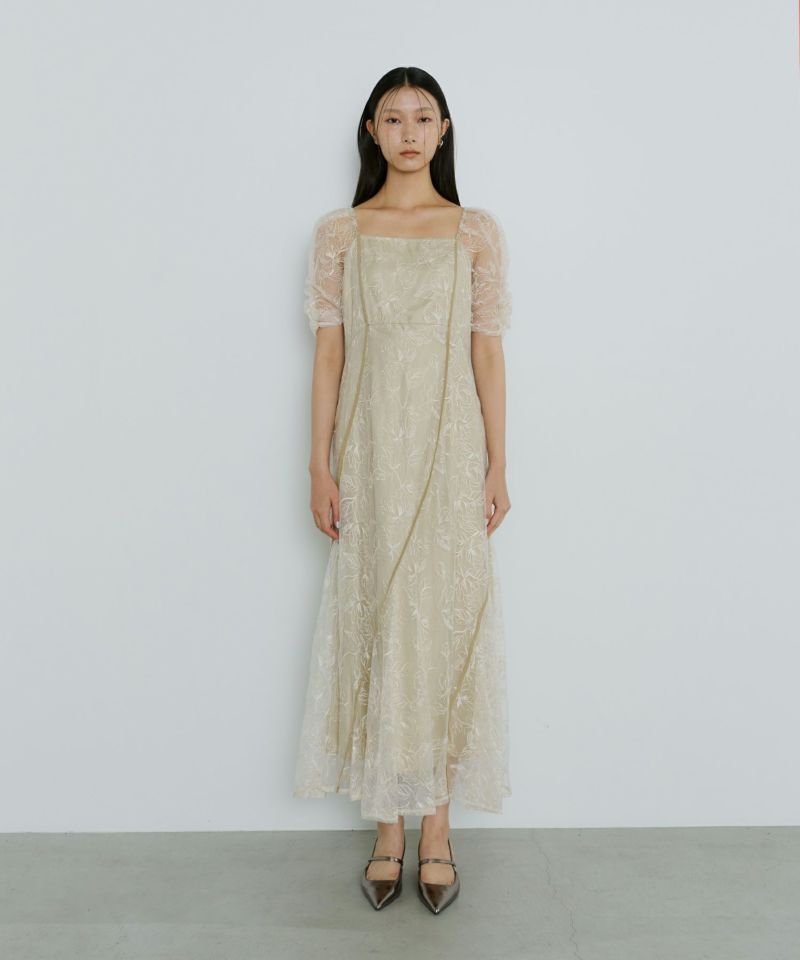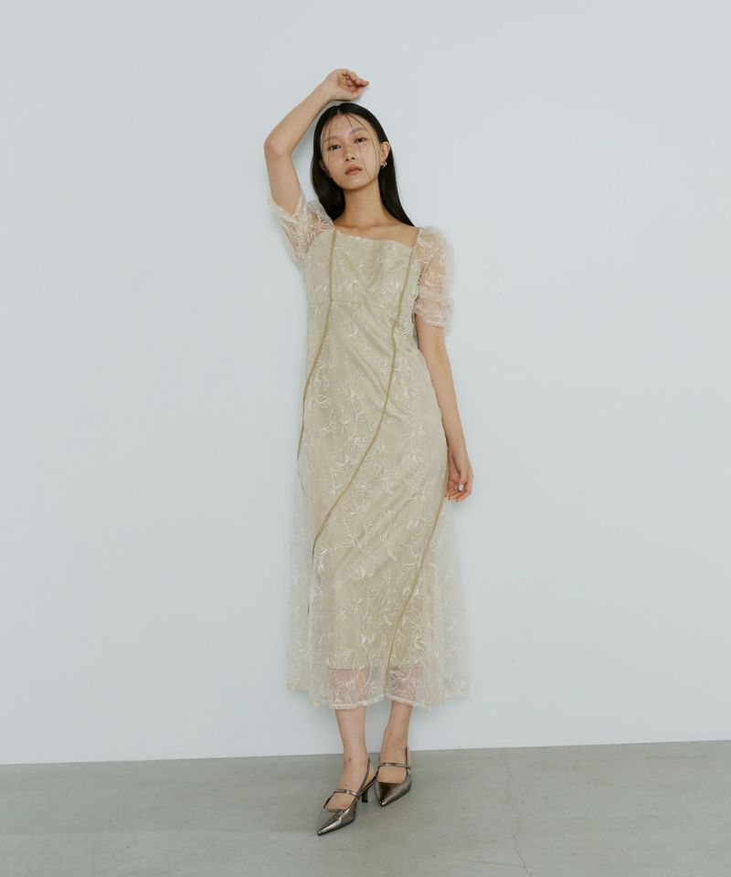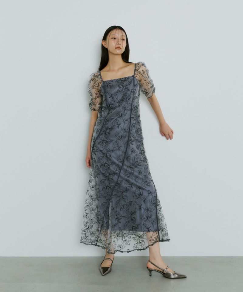 線画調の繊細なフラワー刺繍と軽やかな素材感で